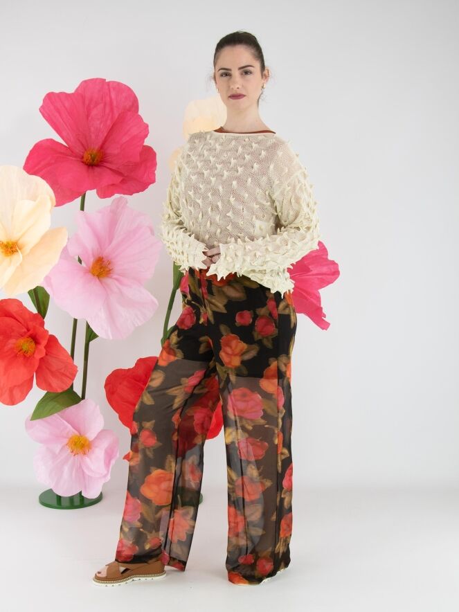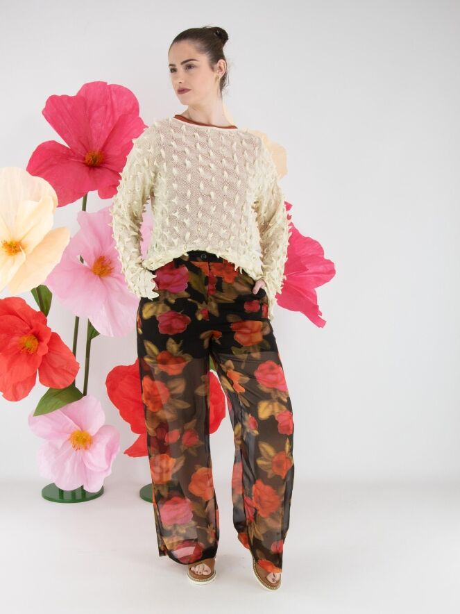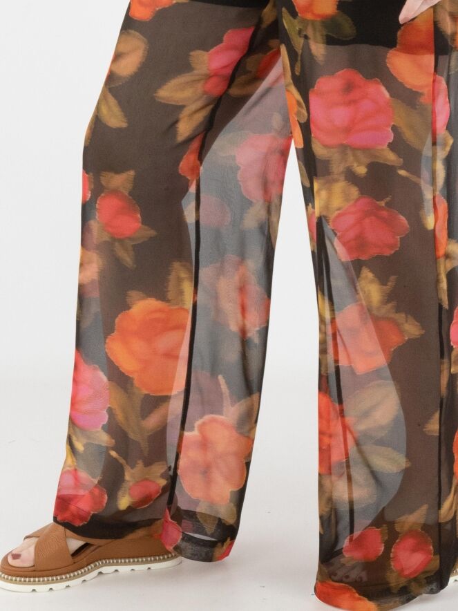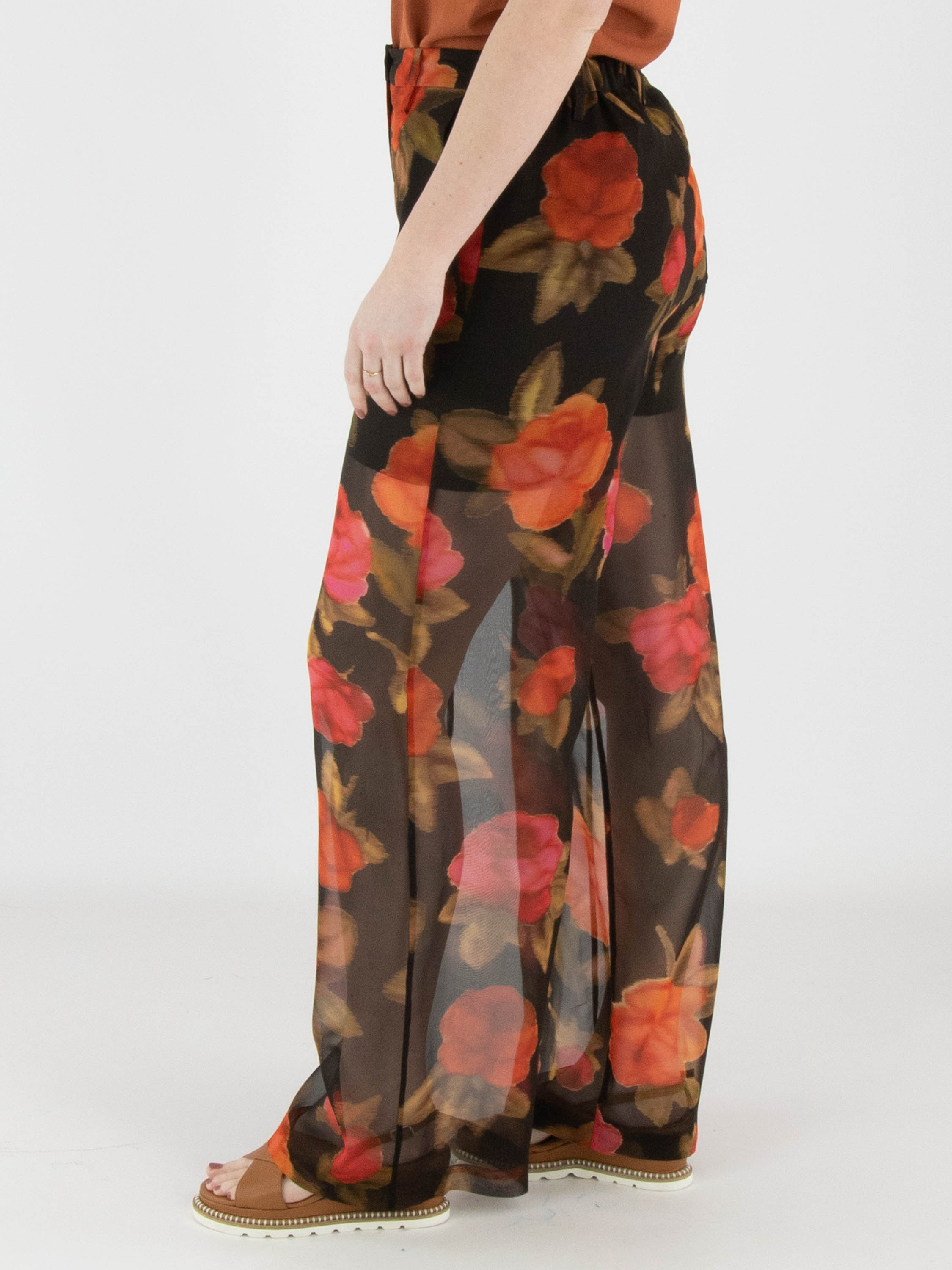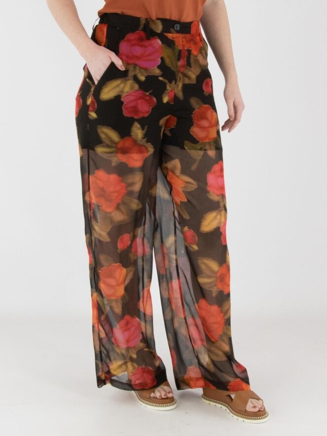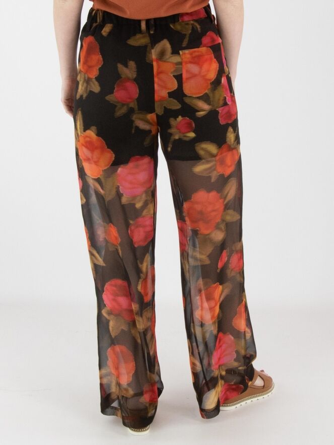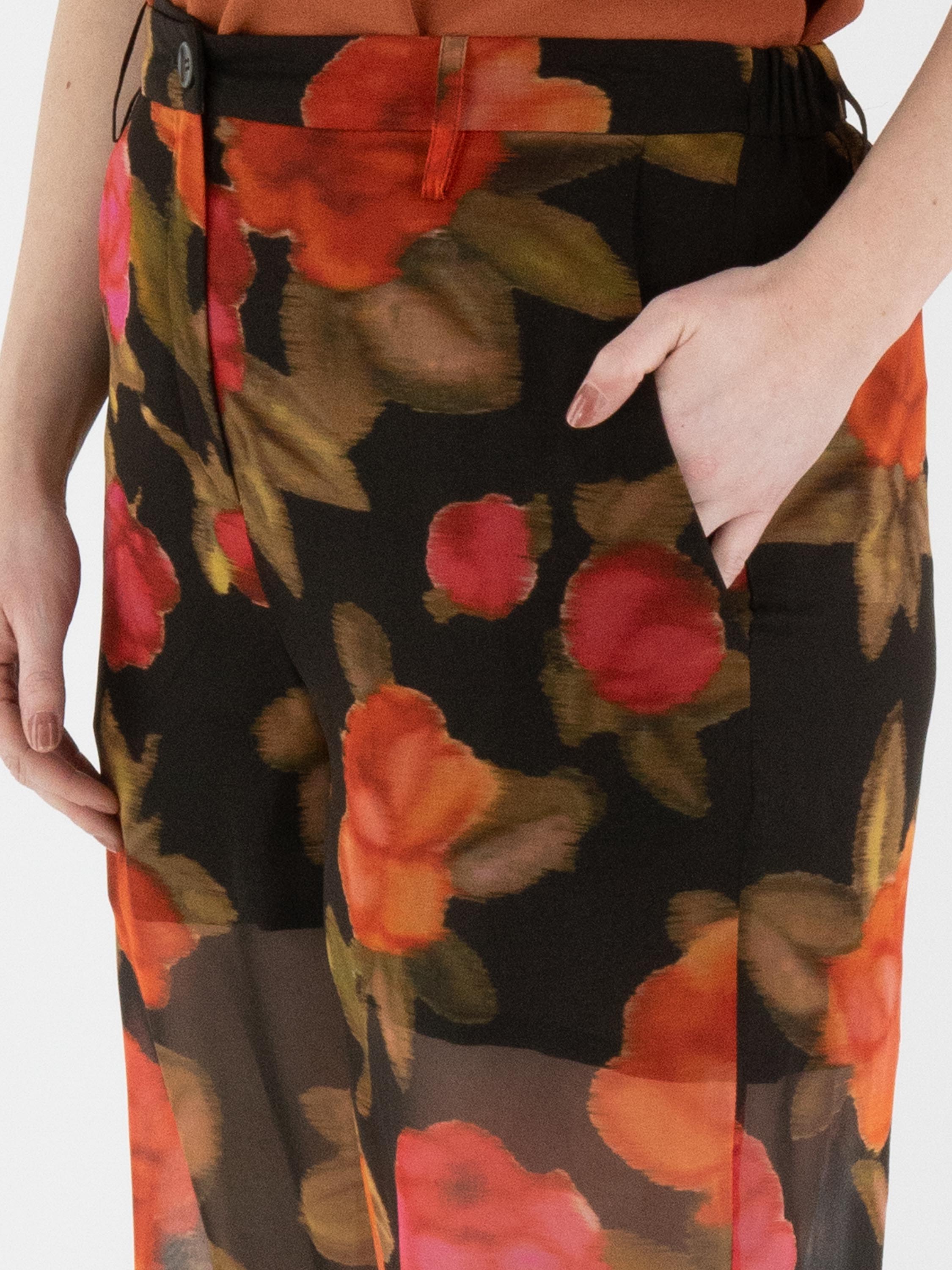 Eine leicht transparente, weit geschnittene Hose von Annette Görtz mit einem Blumenprint in mehreren Rot- und Fuchsiatönen, kombiniert mit Olivgrün auf schwarzem Hintergrund. Die Hose ist bis zum Oberschenkel gefüttert. Am hinteren Bund ist ein elastischer Einsatz verarbeitet. Die Hose verfügt über Seitentaschen und darf nicht gewaschen werden.