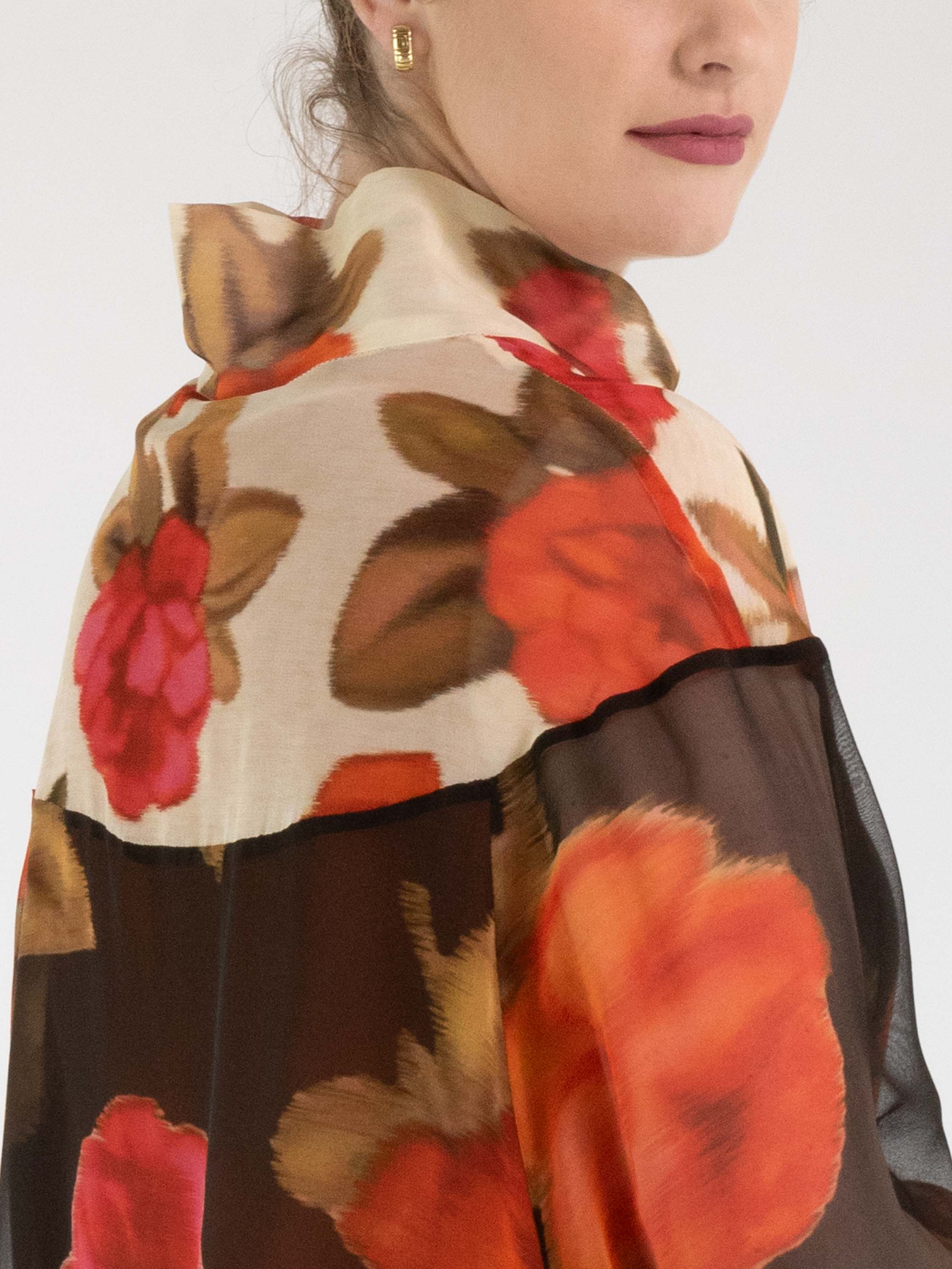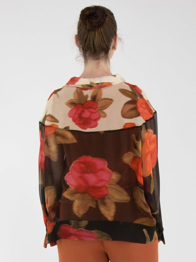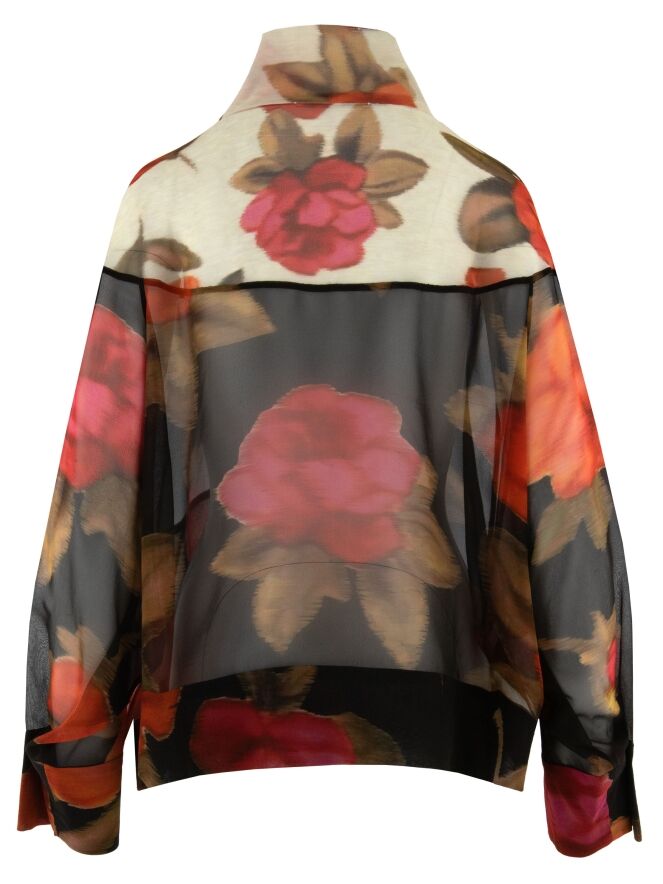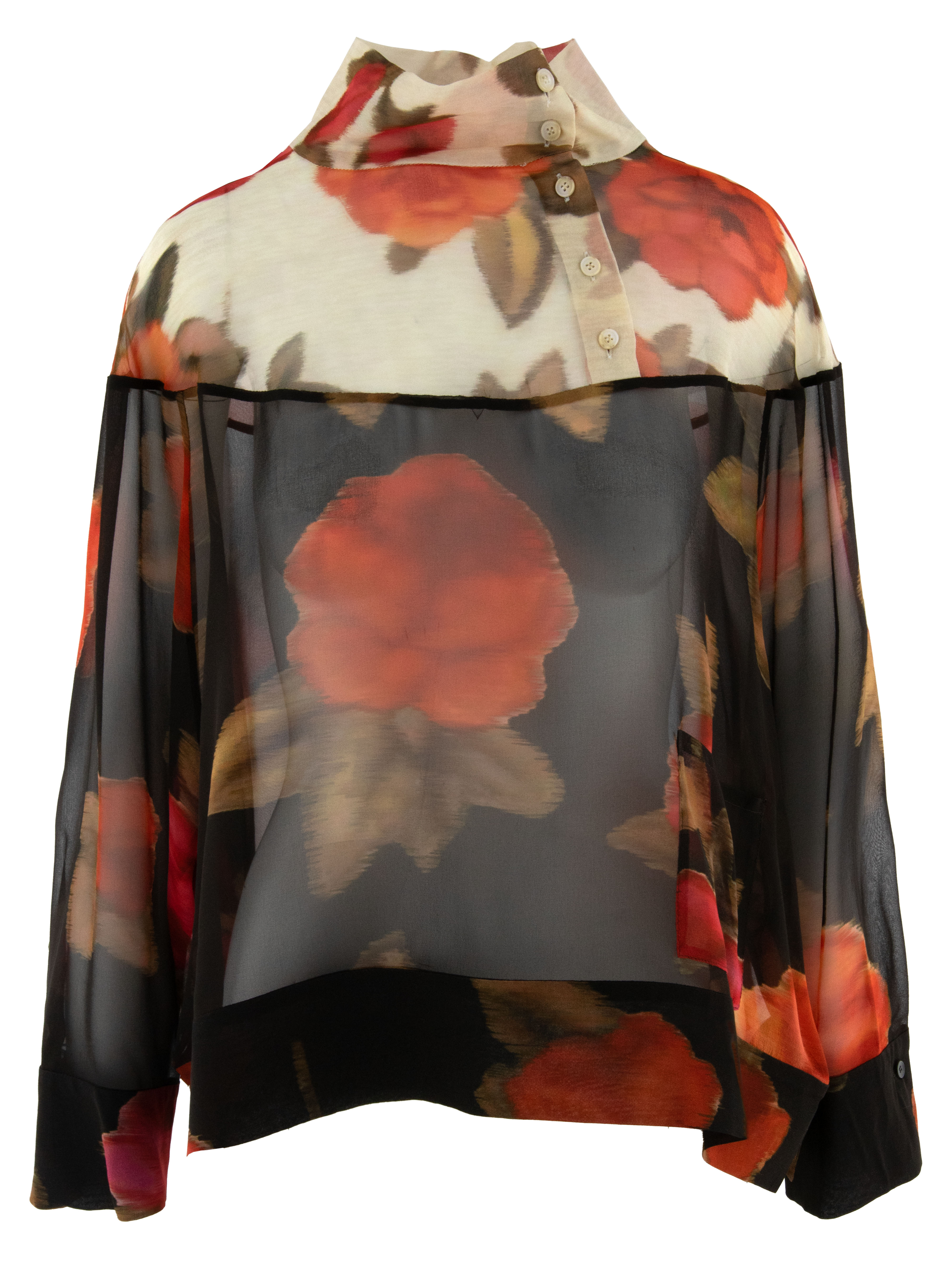 Eine luxuriöse, transparente Bluse von Annette Görtz mit einem Blumenprint in mehreren Rot-, Fuchsia- und Olivgrüntönen. Oberhalb der Brust ist der Hintergrund beige gehalten, unterhalb der Brust schwarz. Die Bluse hat halblange Fledermausärmel und darf nicht gewaschen werden.