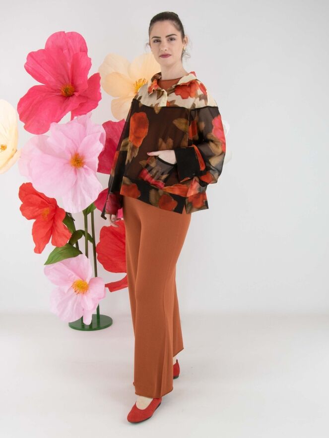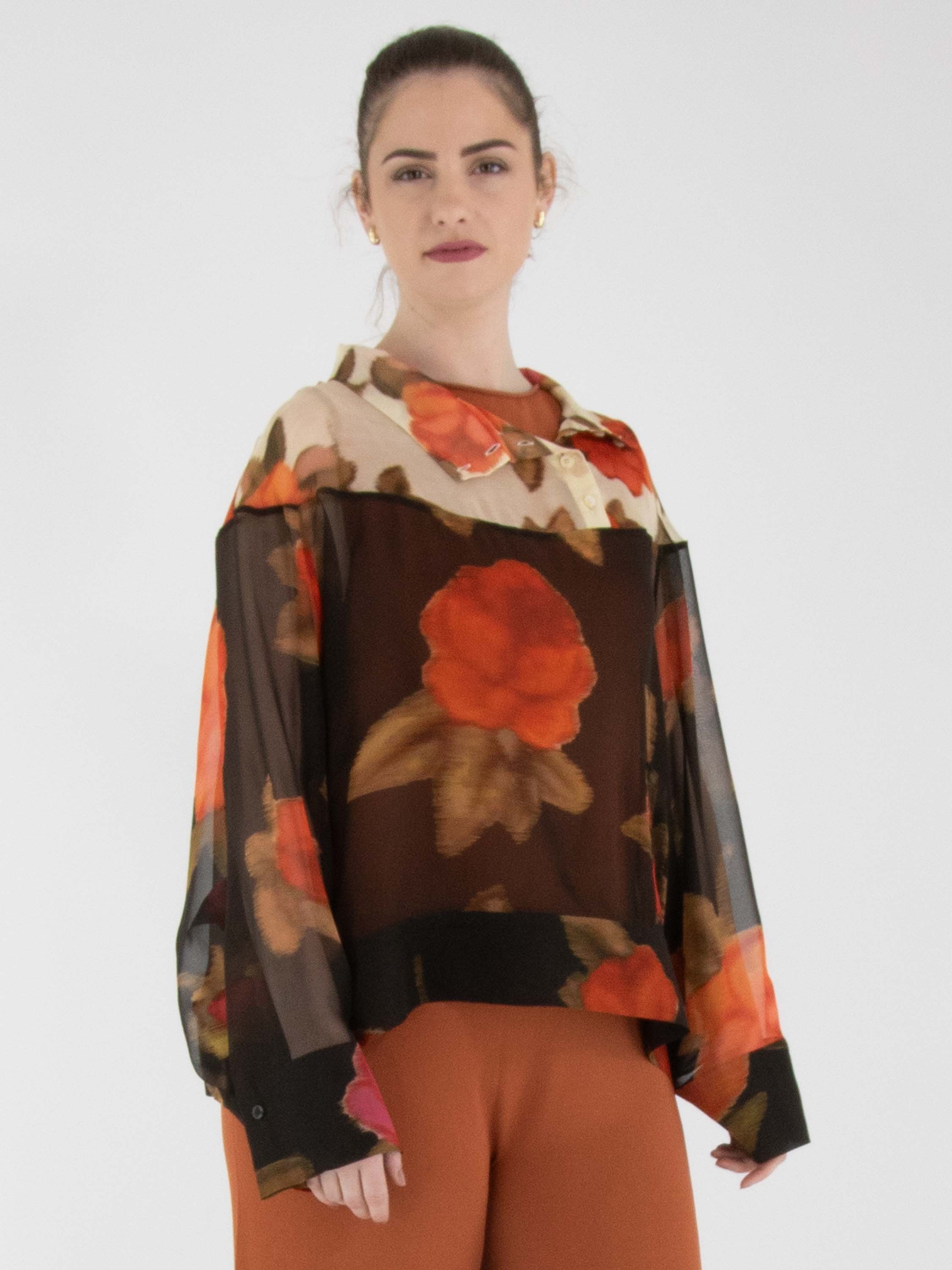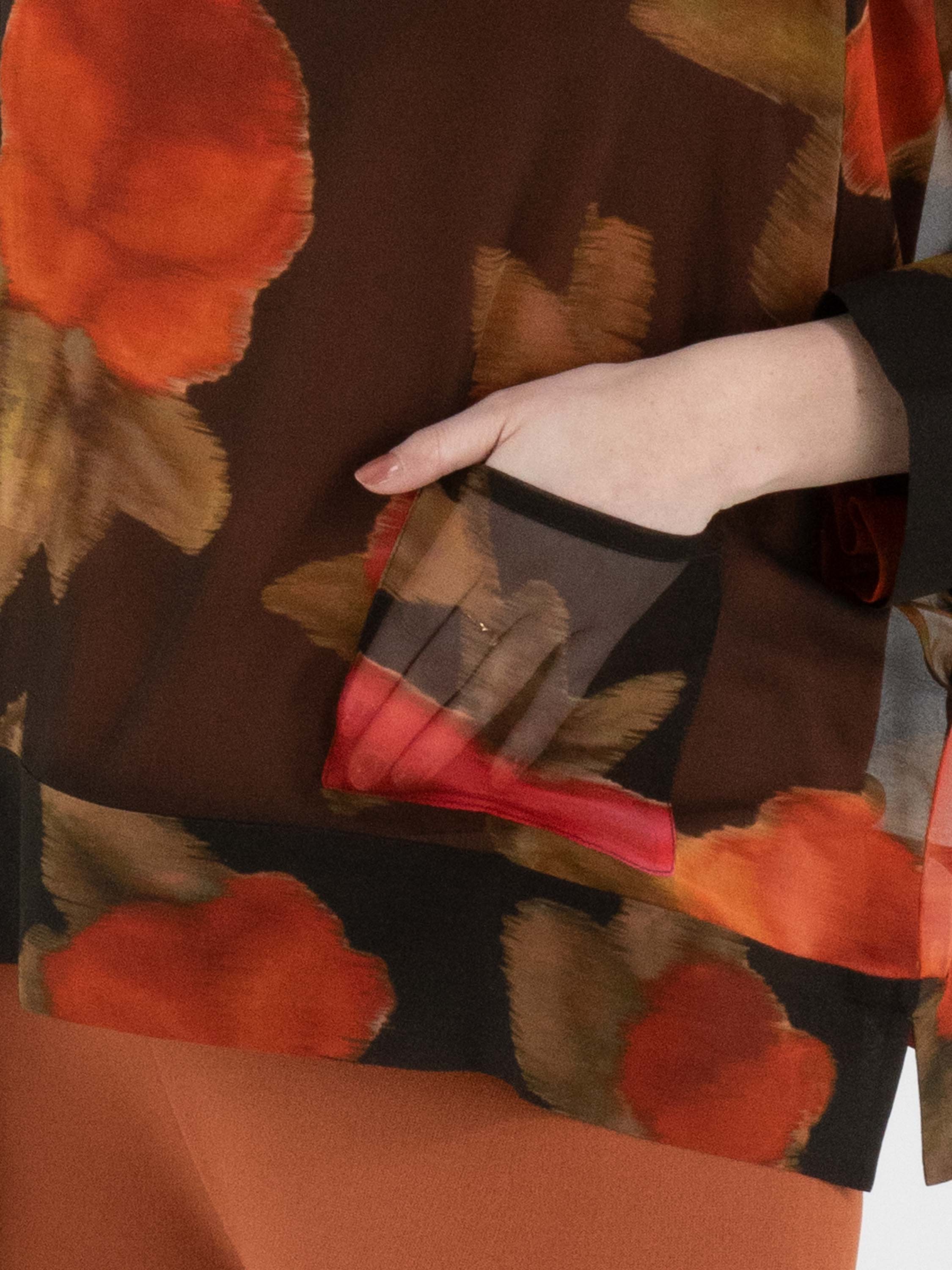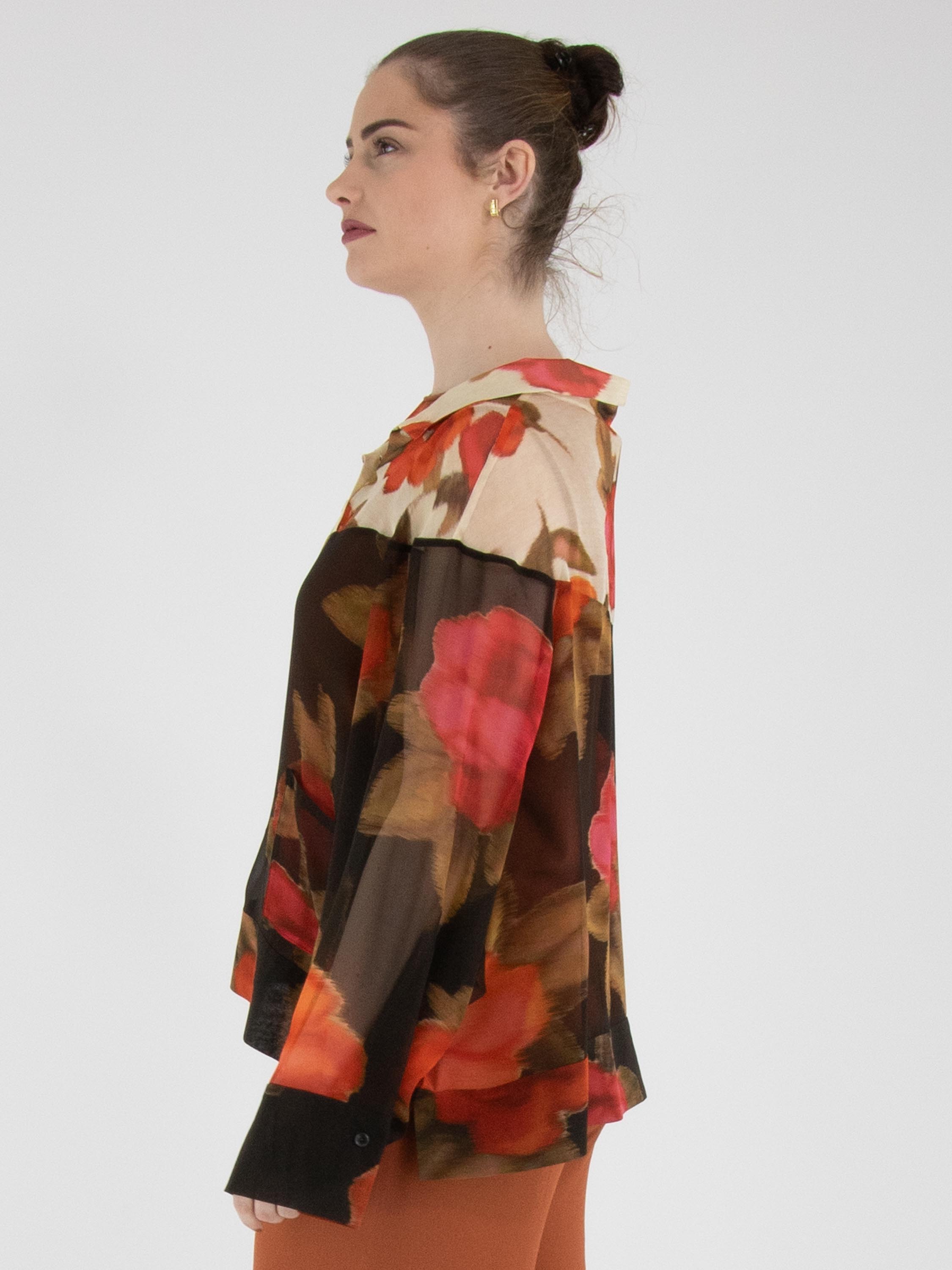 Eine luxuriöse, transparente Bluse von Annette Görtz mit einem Blumenprint in mehreren Rot-, Fuchsia- und Olivgrüntönen. Oberhalb der Brust ist der Hintergrund beige gehalten, unterhalb der Brust schwarz. Die Bluse hat halblange Fledermausärmel und darf nicht gewaschen werden.
