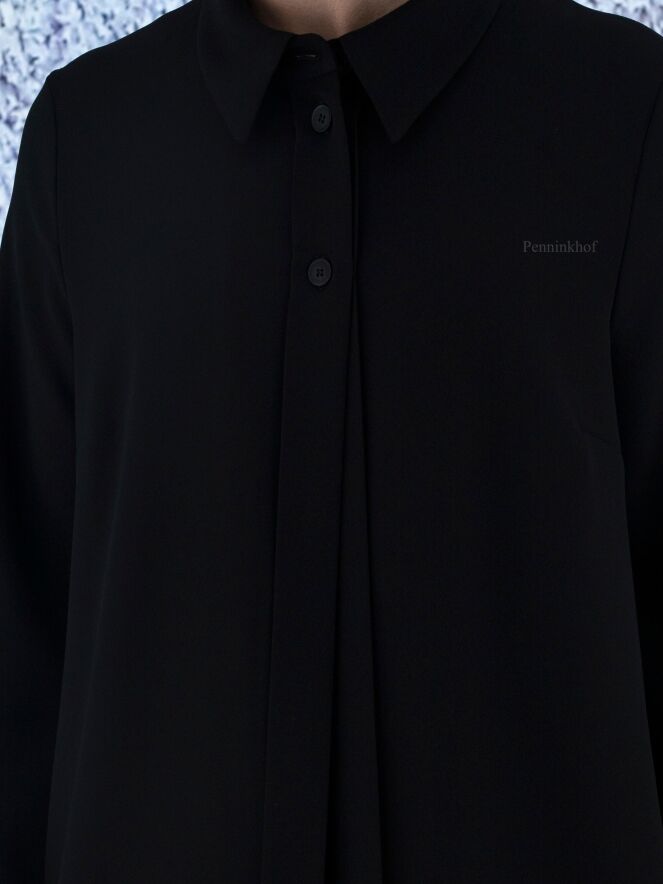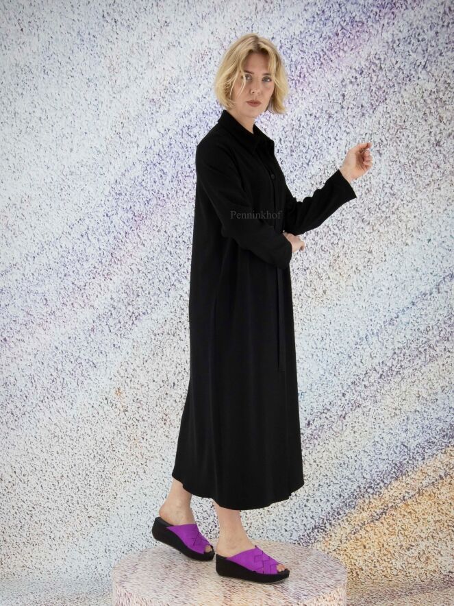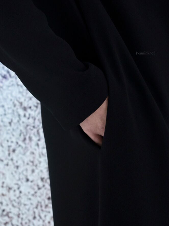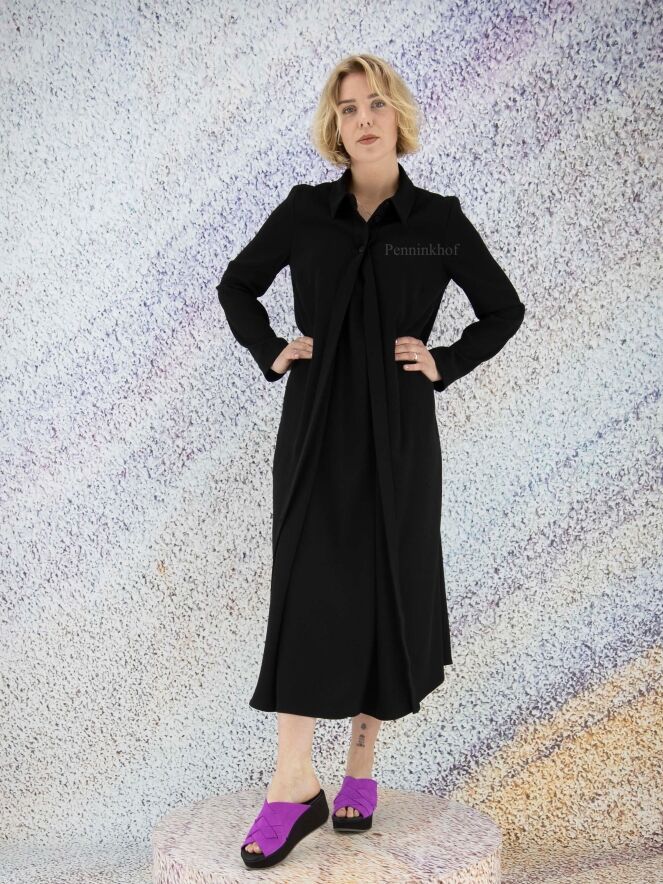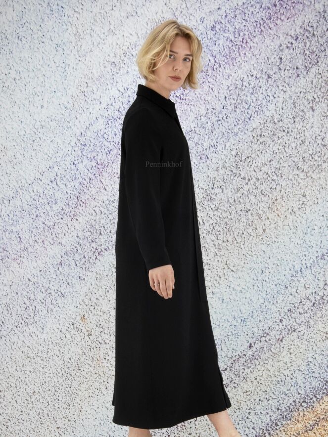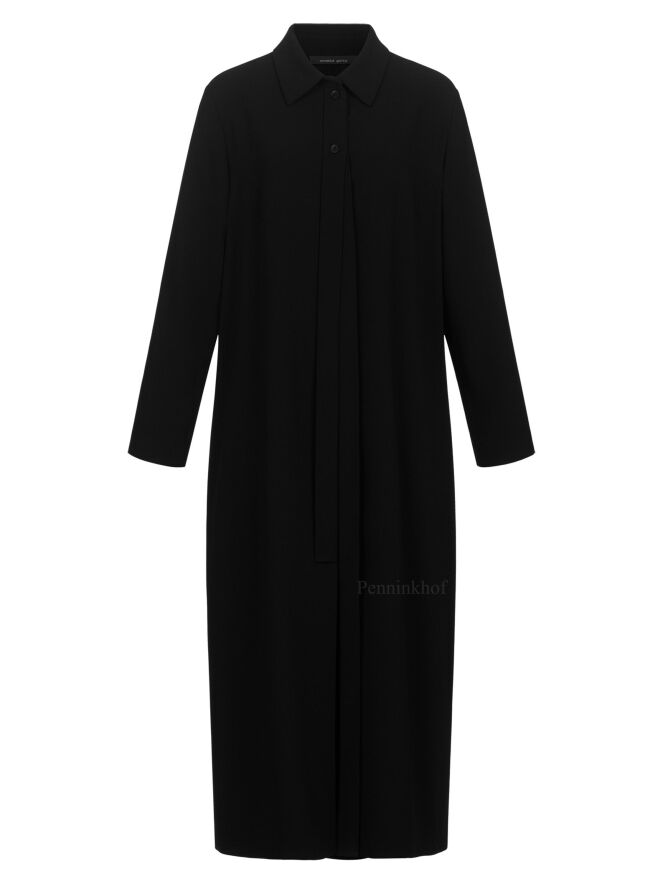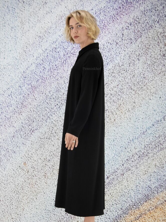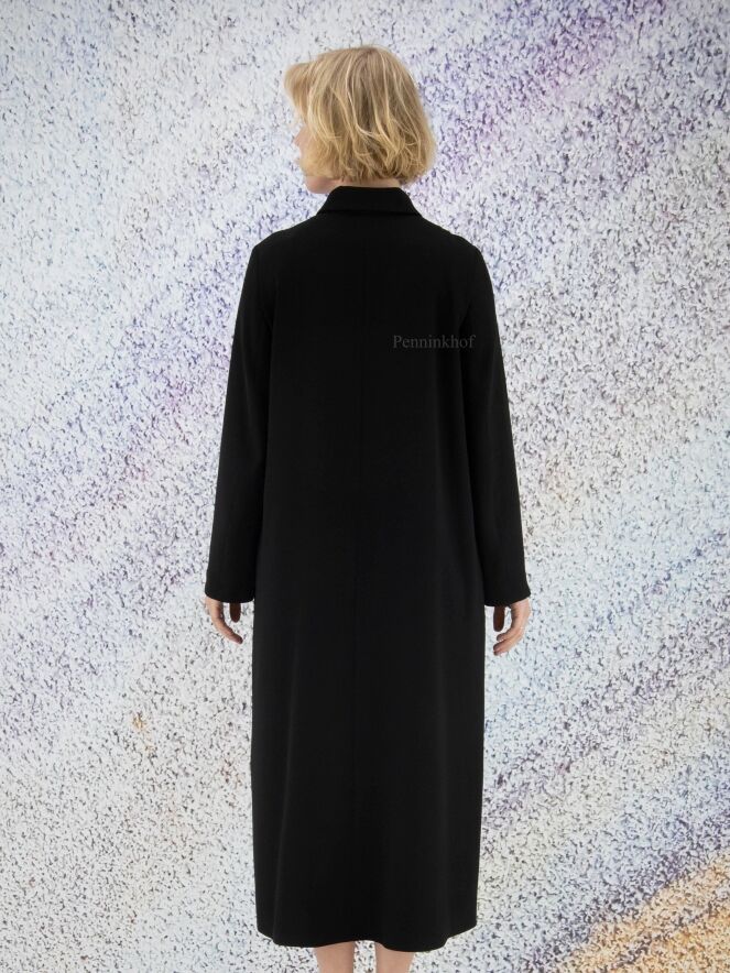 Ein schwarzes Kleid im Longblazer-Look der Designermode von Annette Görtz. Unter dem Halsverschluss befinden sich 2 Knöpfe. Darunter hat das Kleid eine leichte A-Linie. Dieses Kleid darf von Hand gewaschen werden.