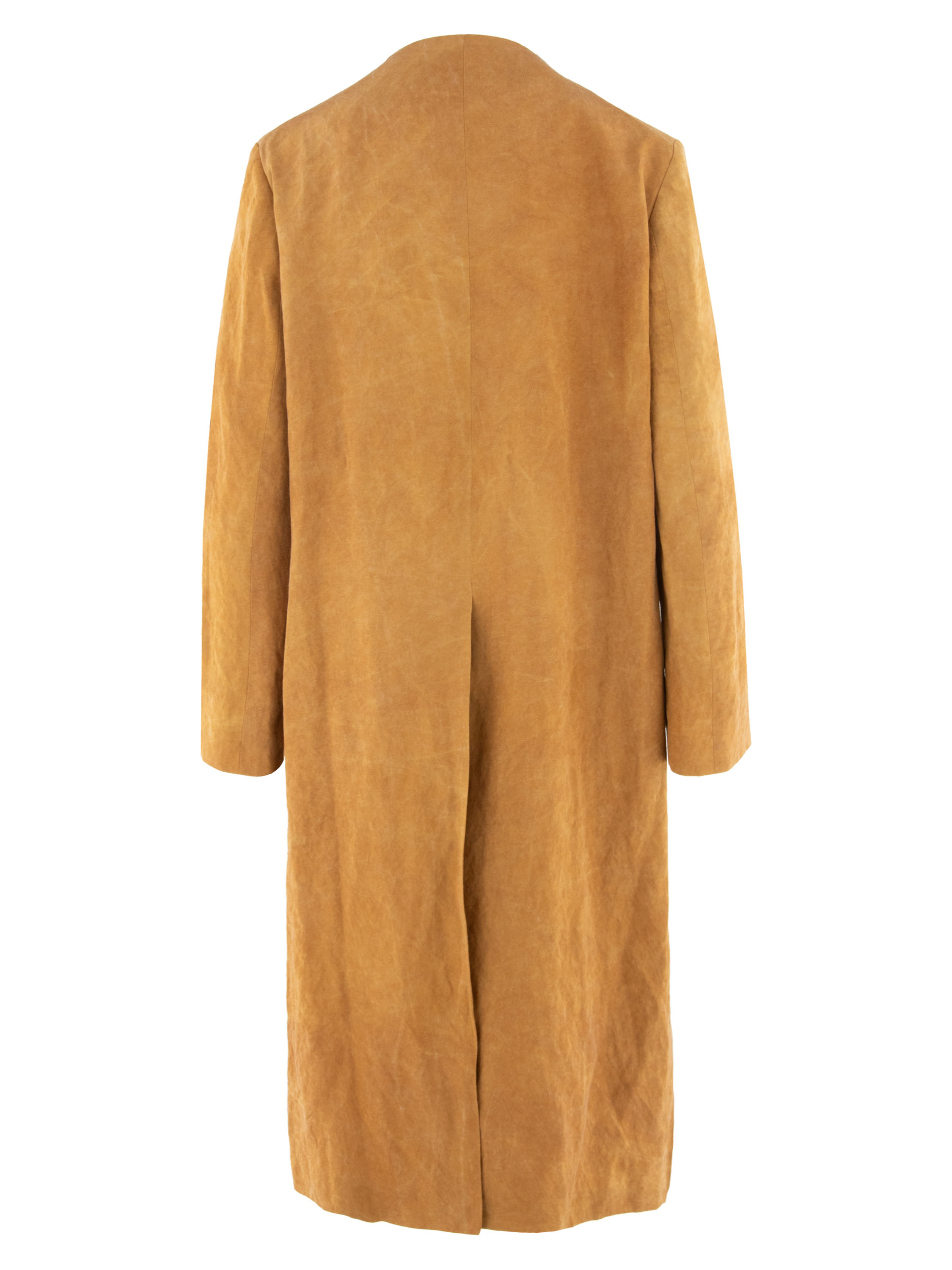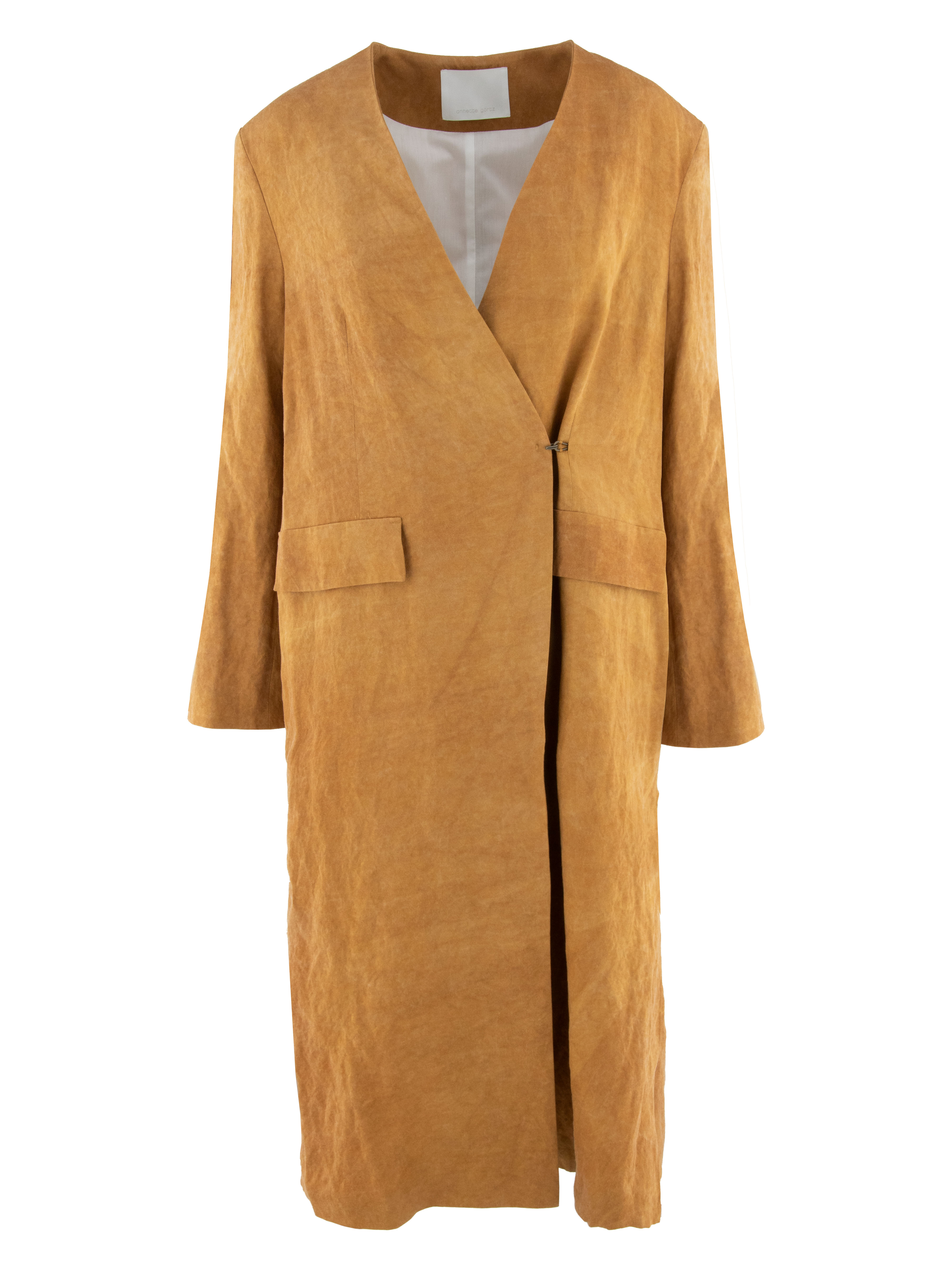 Langer Mantel von Annette Görtz in einem melierten Rostbraun. Der Verschluss ist mit einem Pelzhaken verstellbar und sorgt für eine elegante, minimalistische Optik. An beiden Seiten des Saums befinden sich tiefe Schlitze, die dem Modell eine fließende, elegante Bewegung verleihen. Der Mantel ist gefüttert und darf nicht gewaschen werden.