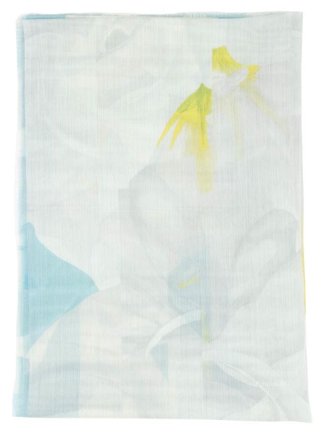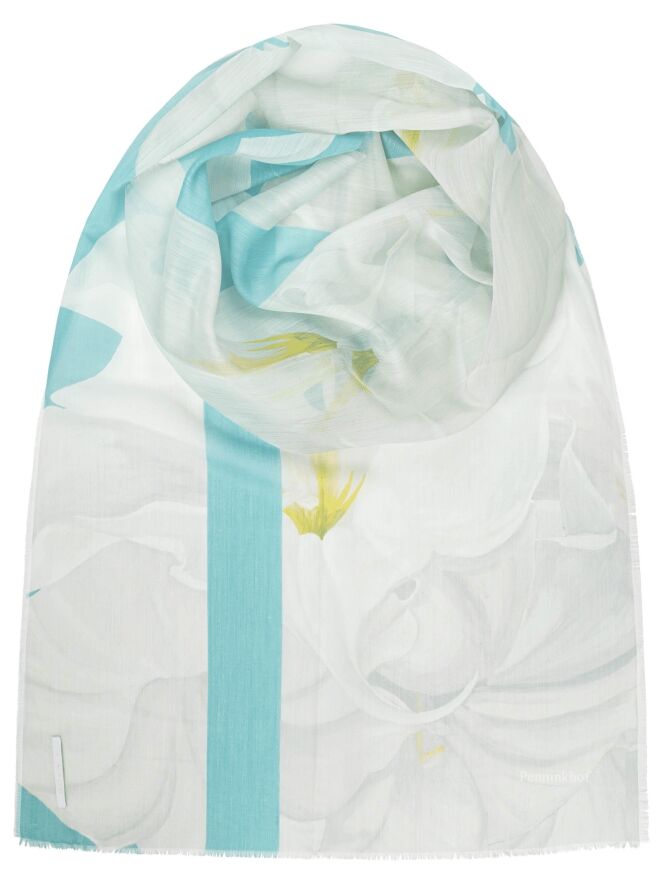 Ein edles, leicht transparentes Tuch der Designermode von Annette Görtz mit grafischem Print in Türkis, Limettengrün und Cremeweiß. Die Kanten des Schals sind fein ausgefranst. Dieser Schal kann von Hand gewaschen werden.