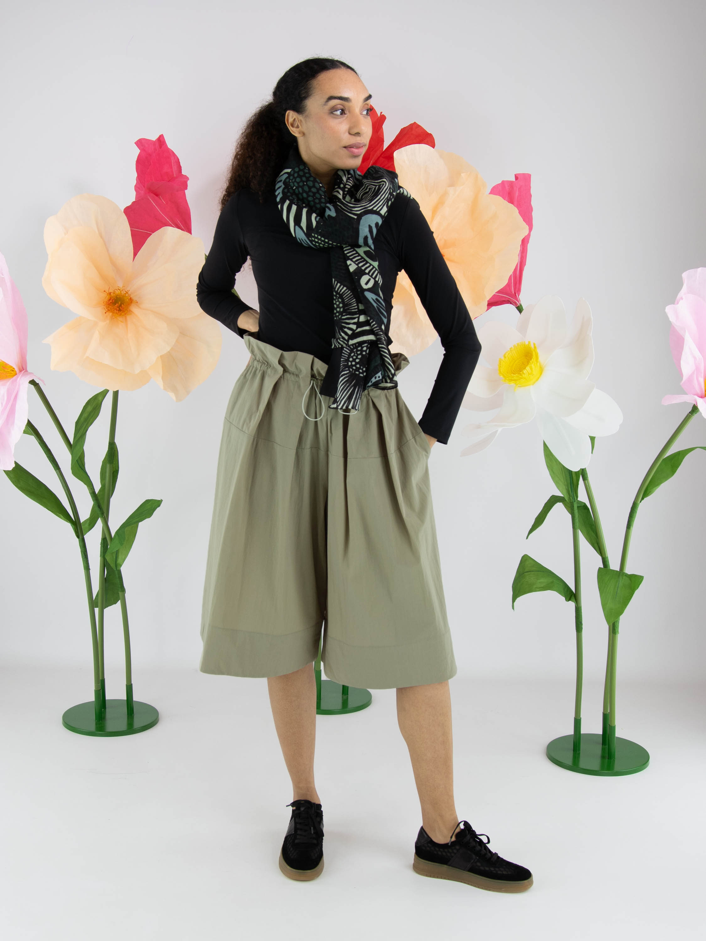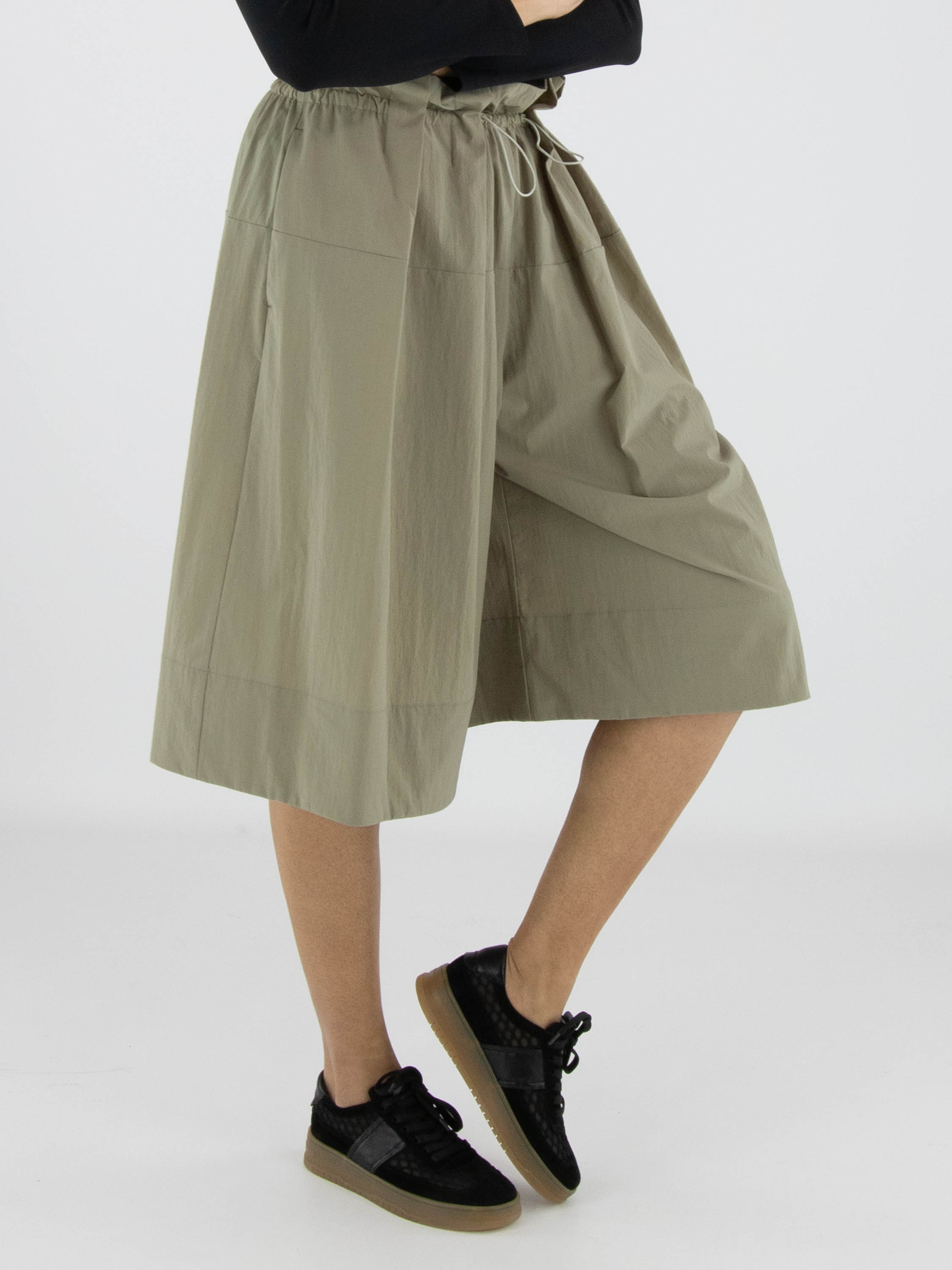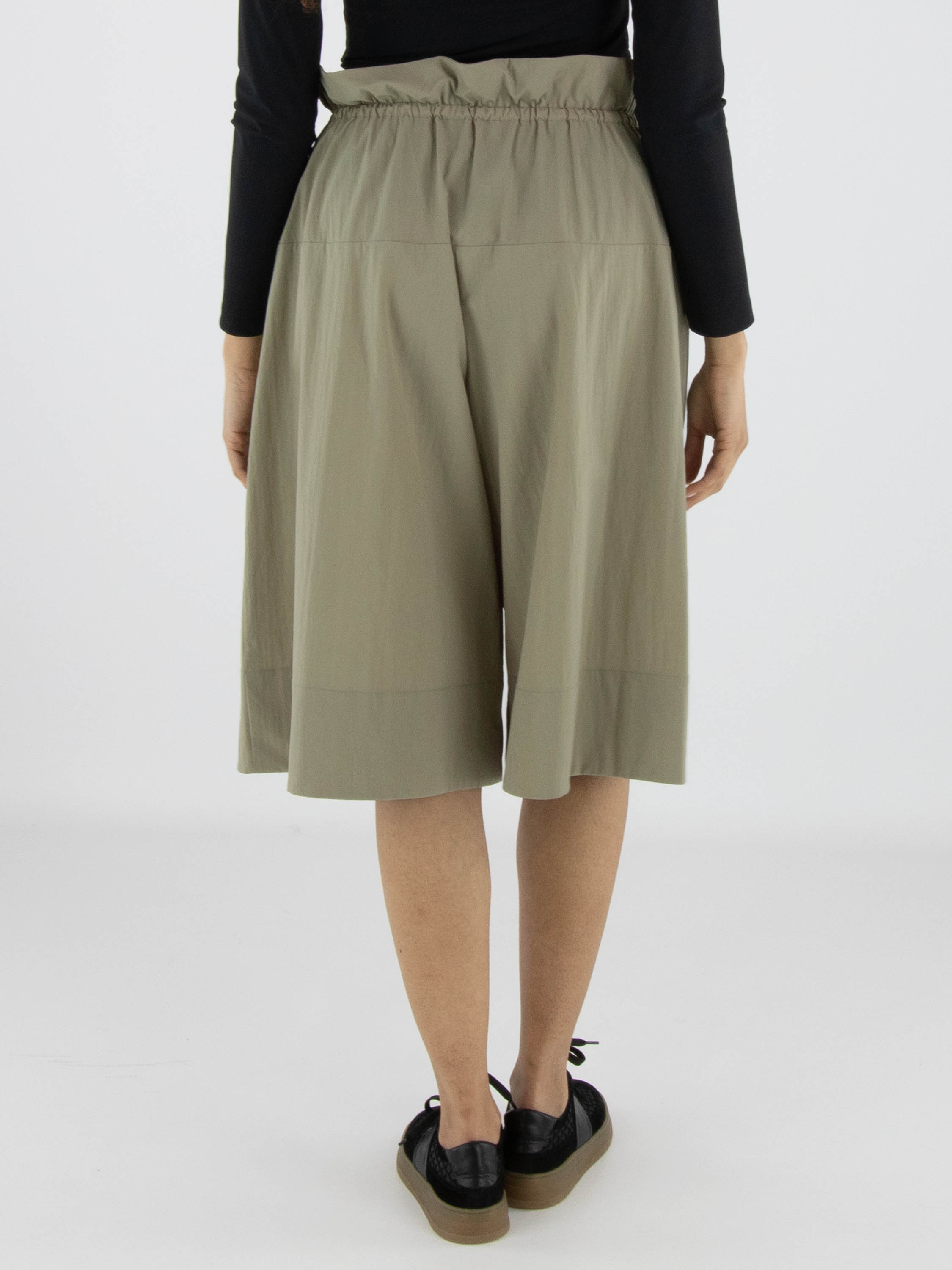 Bermuda von Annette Görtz in einem eleganten Olivgrün. Der Bund ist mit einem elastischen Tunnelzug versehen, der den Stoff fein rafft und für eine bequeme Passform sorgt. Diese Bermuda sollte per Hand gewaschen werden.