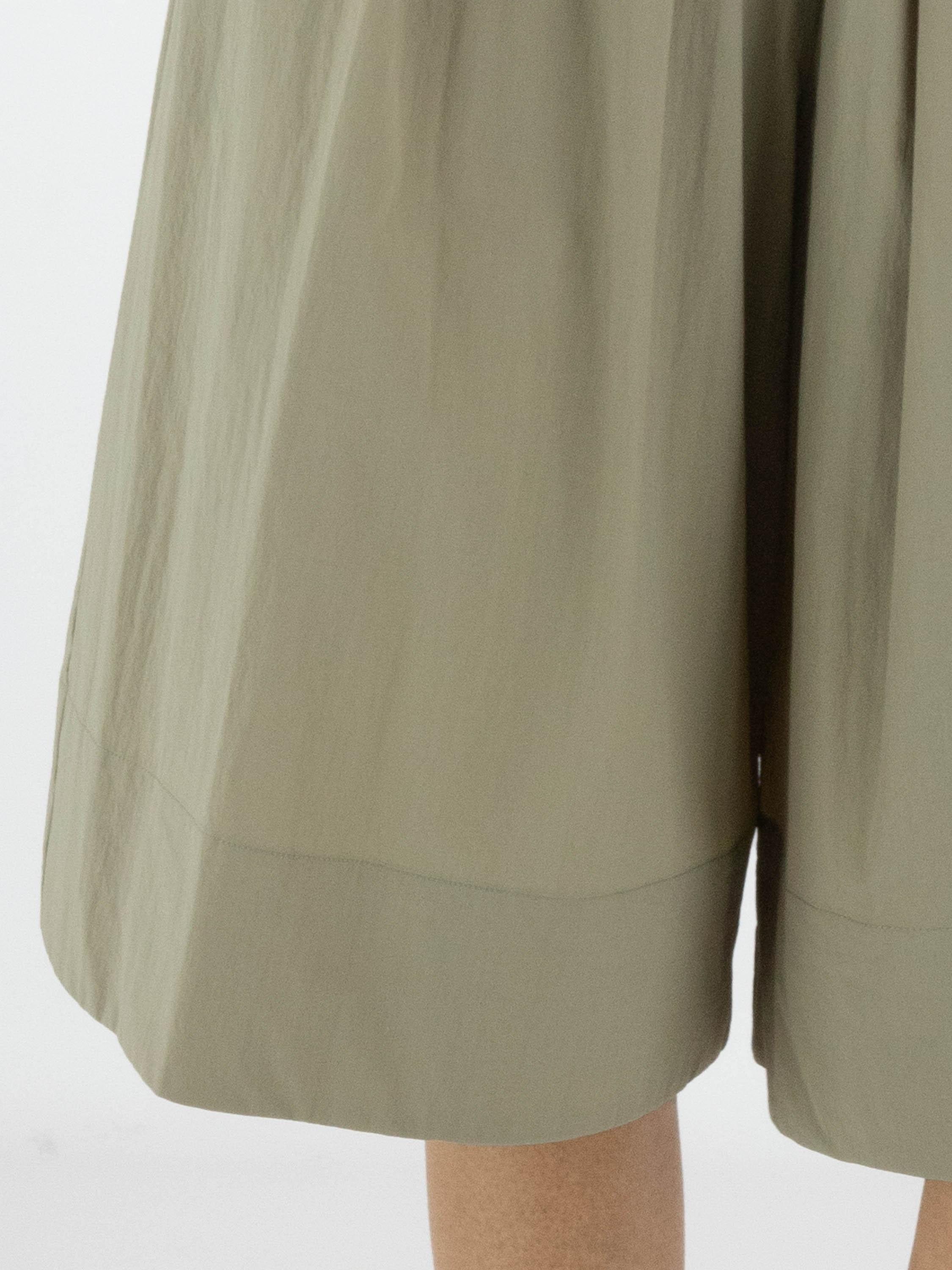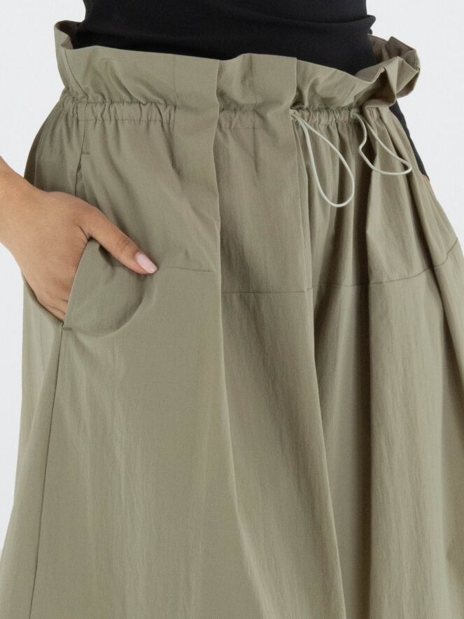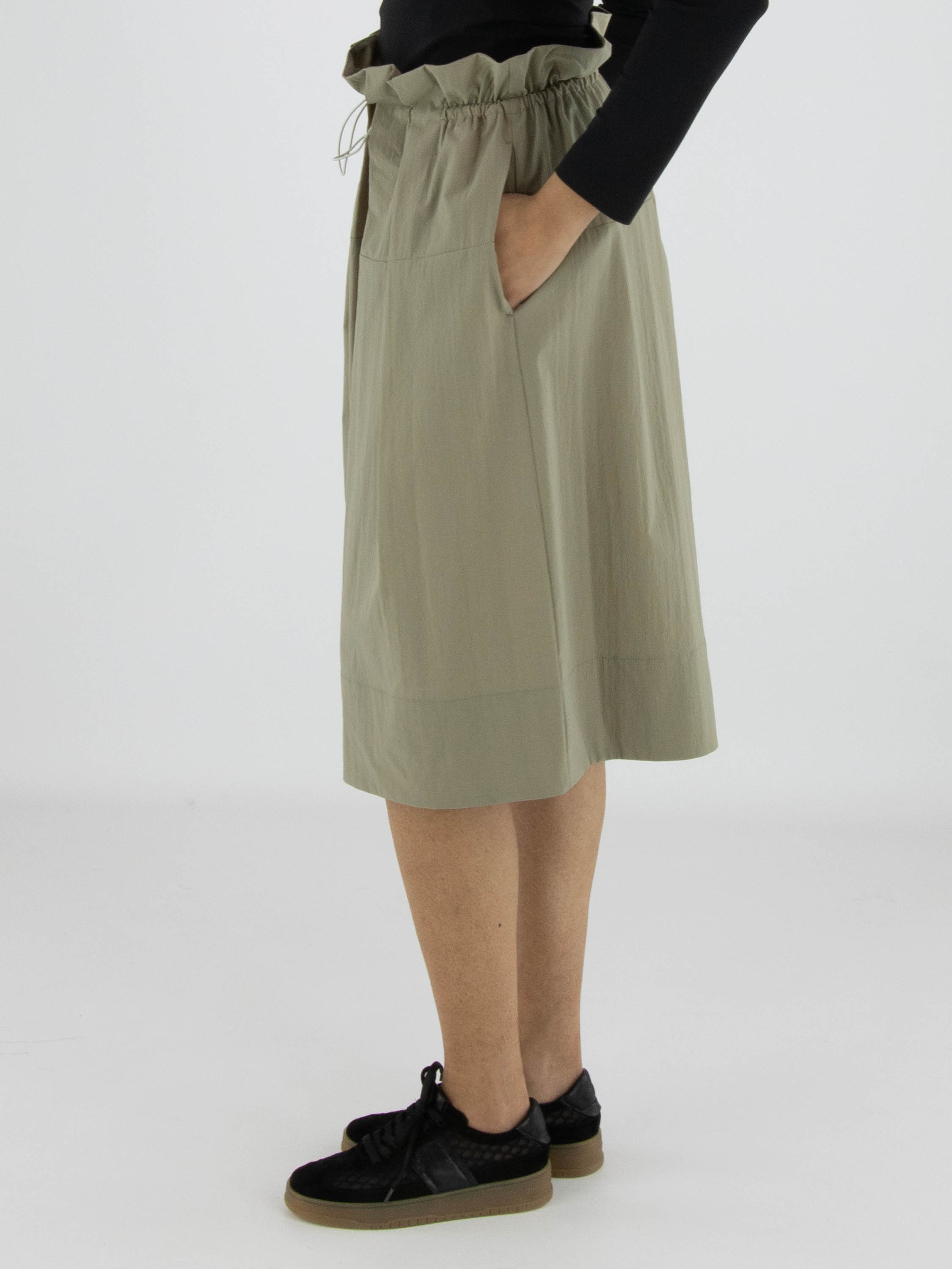 Bermuda von Annette Görtz in einem eleganten Olivgrün. Der Bund ist mit einem elastischen Tunnelzug versehen, der den Stoff fein rafft und für eine bequeme Passform sorgt. Diese Bermuda sollte per Hand gewaschen werden.