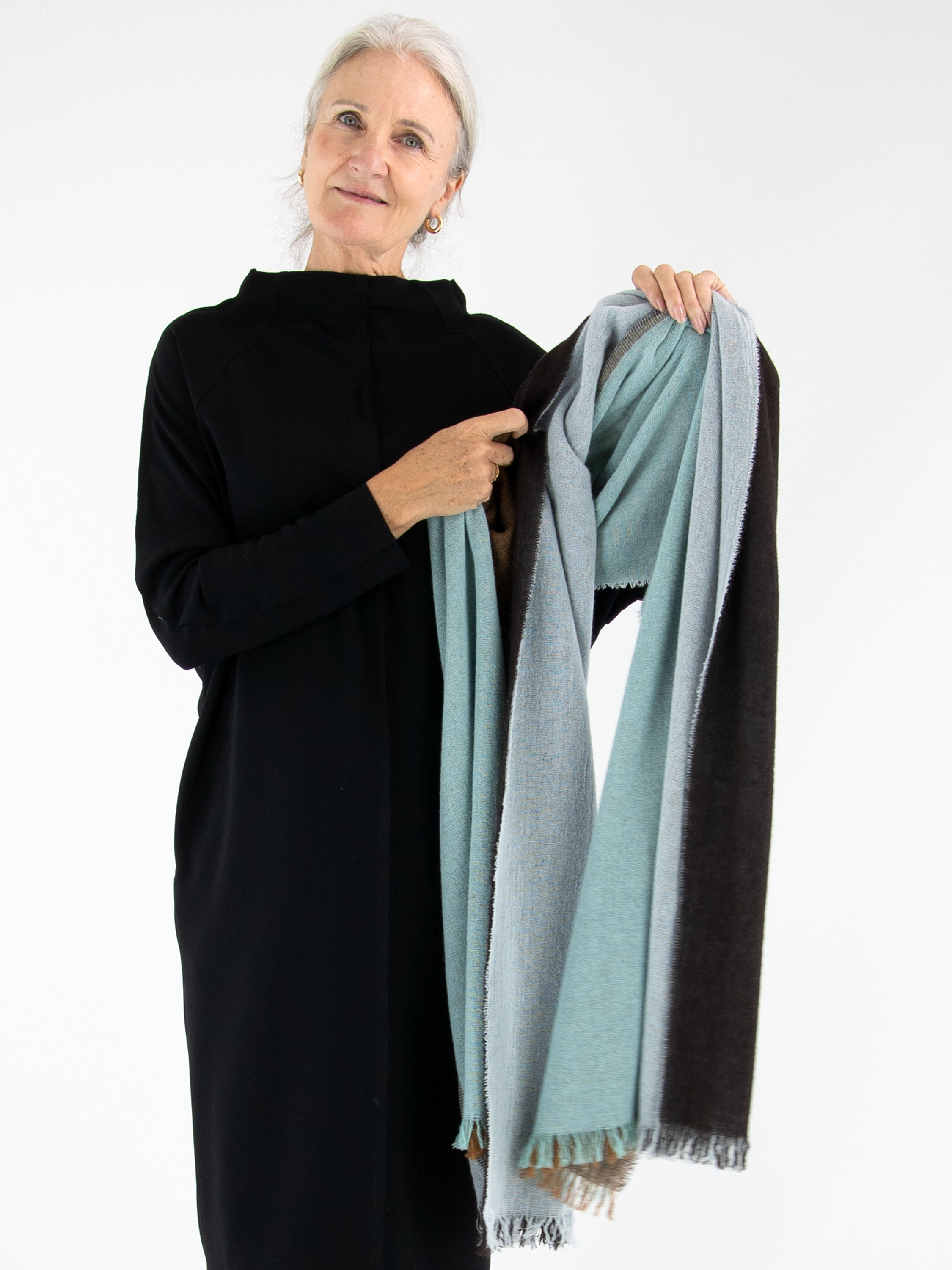 Ein luxuriöser Schal von Annette Görtz in Farbflächen aus Kastanienbraun, Mokkabraun und Türkis. In der Mitte verläuft eine feine Karostruktur, die dezent mit silberfarbenem Metallfaden durchzogen ist und einen edlen Glanz verleiht. Die Enden sind fein ausgefranst und runden den Schal elegant ab. Dieser Schal darf nicht gewaschen werden.