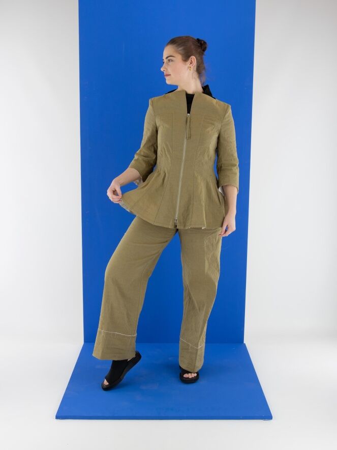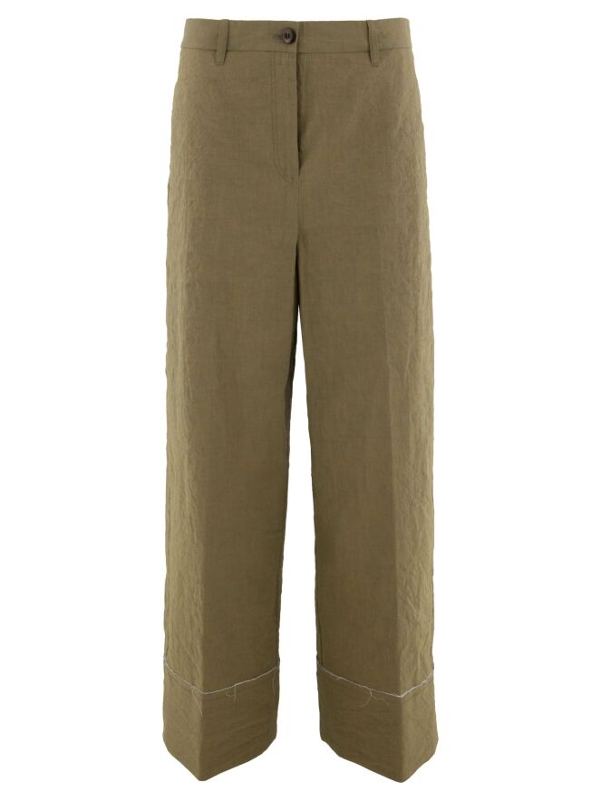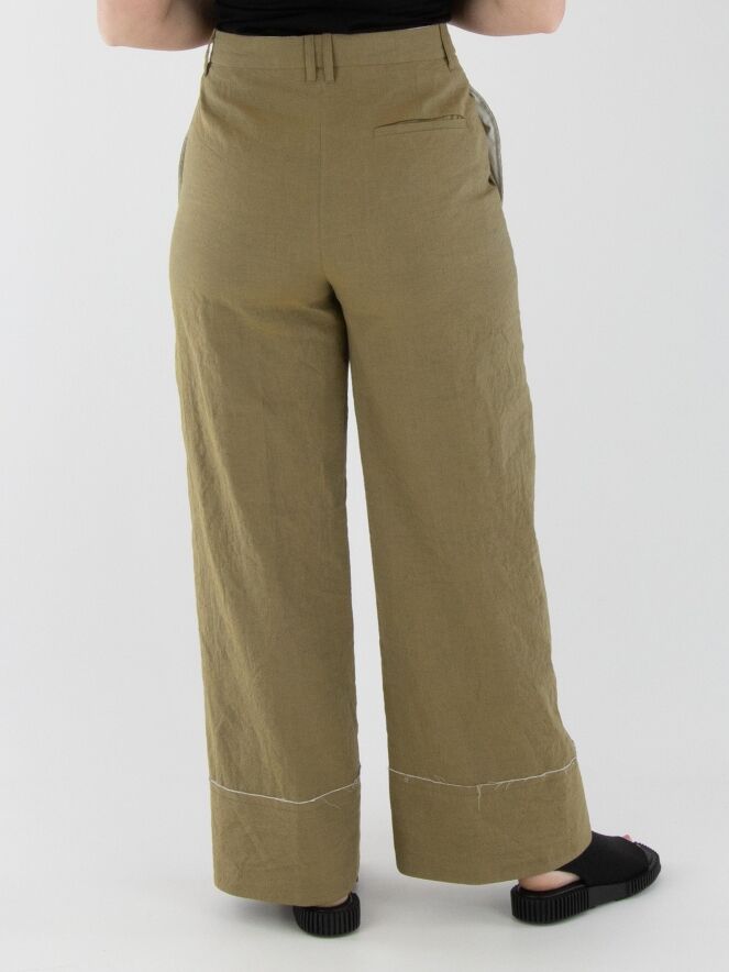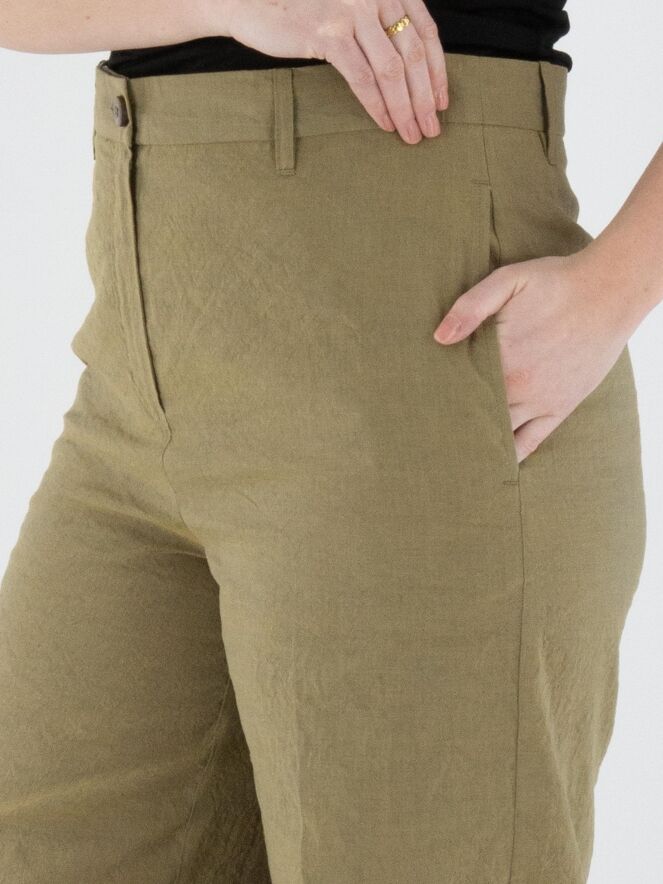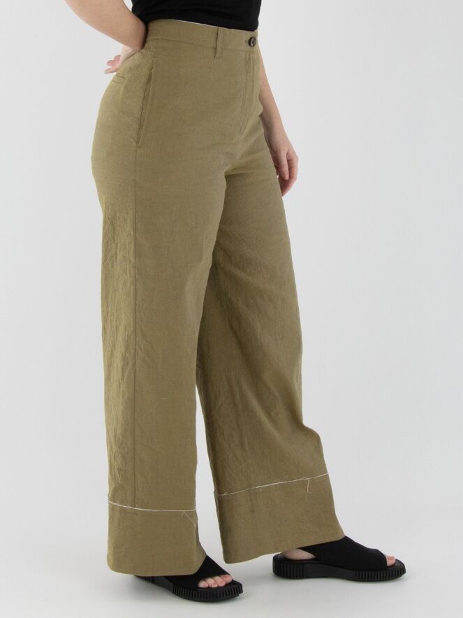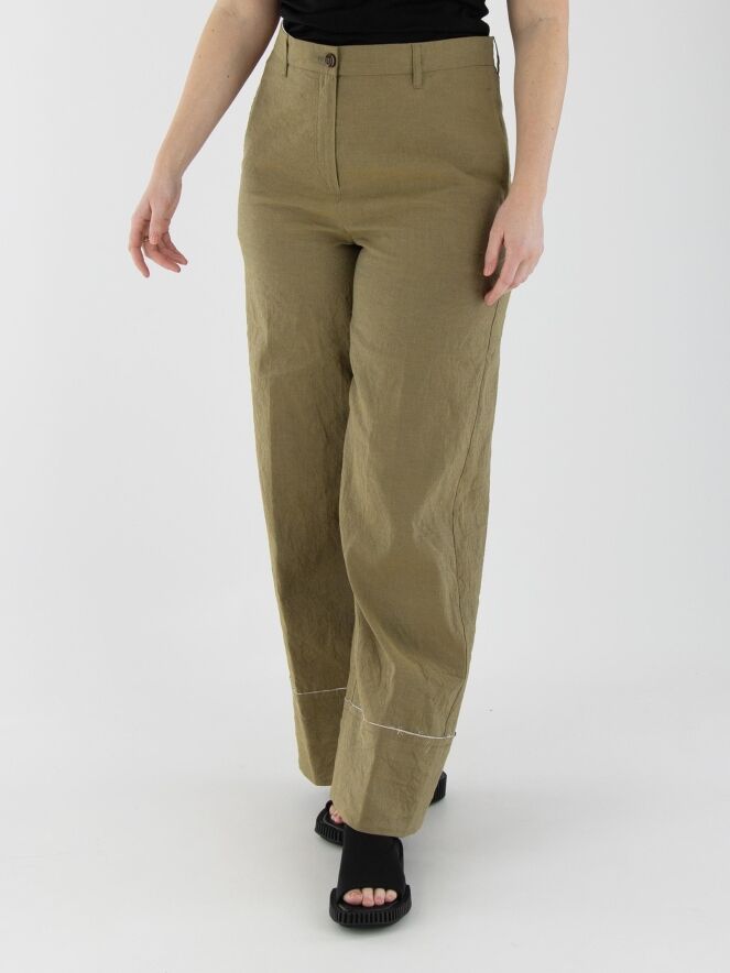 Eine weite Hose von Annette Görtz in Olivgrün. Der Stoff ist fein gesmokt. Am unteren Ende befindet sich ein breites Bündchen mit einem cremeweißen, fein ausgefransten Stoff entlang der Naht. Diese Hose kann bei 30 Grad gewaschen werden.