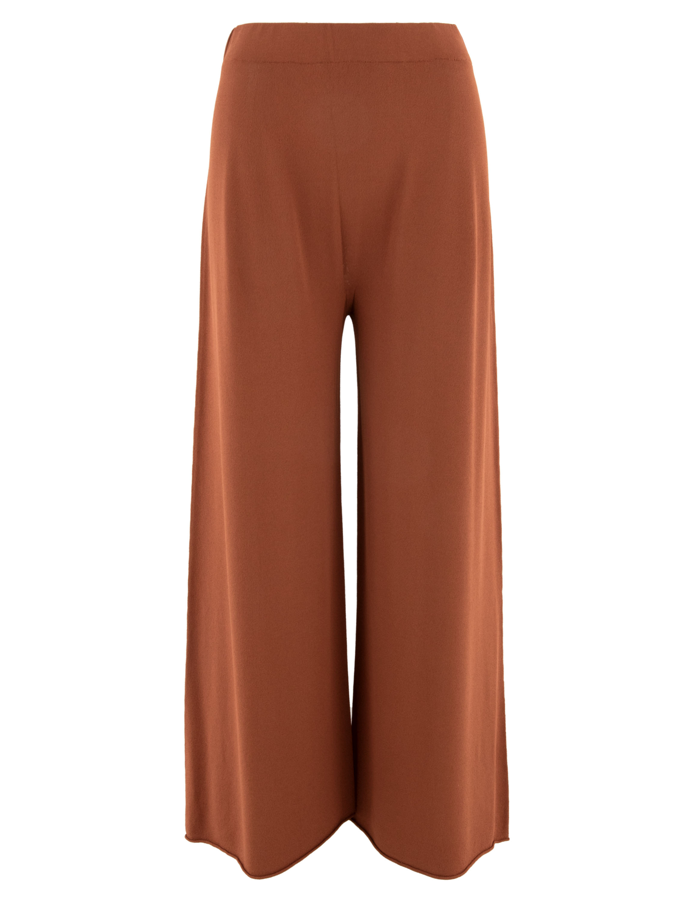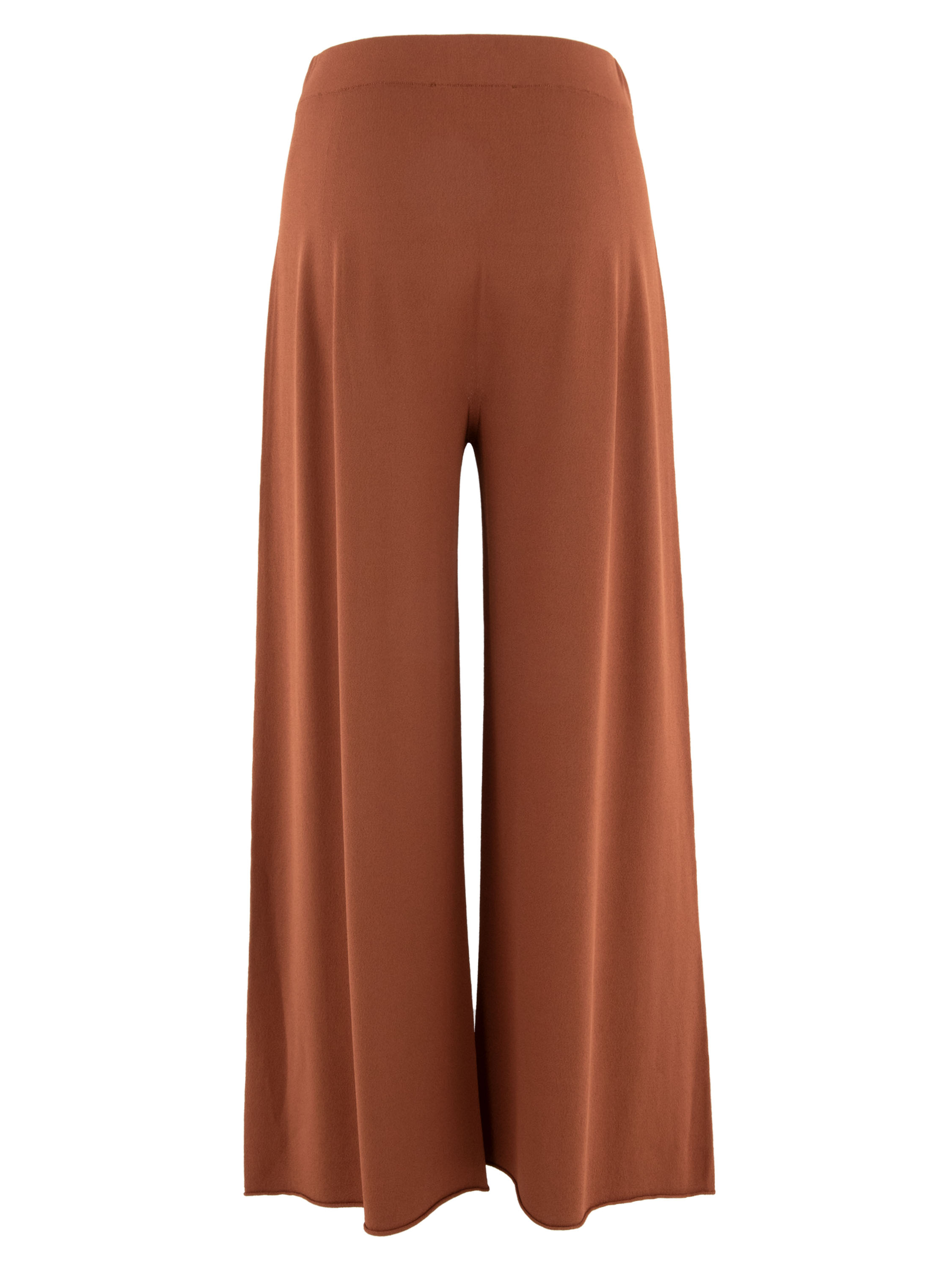 Eine fein gestrickte, weit geschnittene Strickhose von Annette Görtz in Rostbraun. Der Bund ist elastisch gearbeitet. Die Abschlüsse an den Hosenbeinen sind gerüscht. Diese Hose kann bei 30 Grad gewaschen werden.
