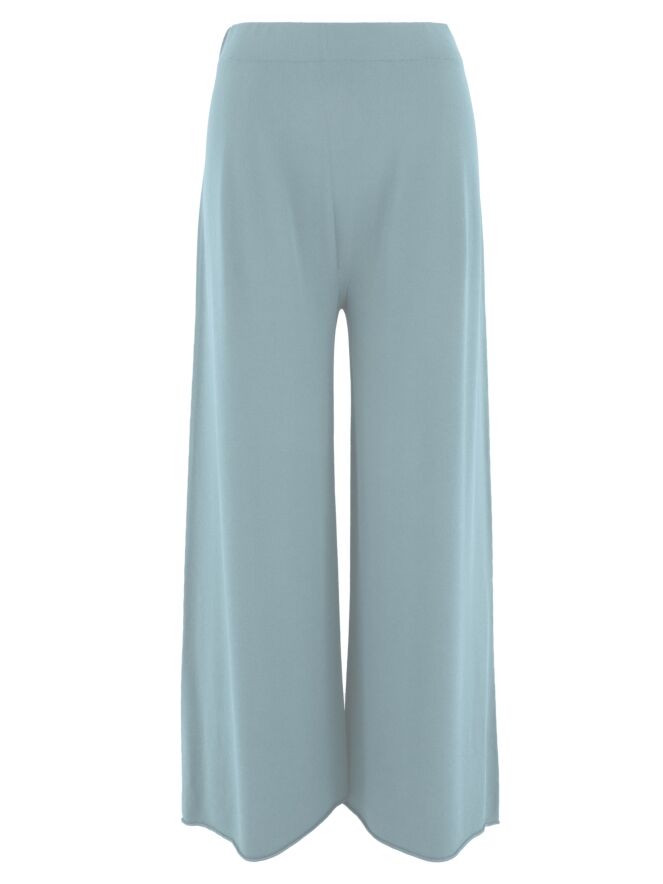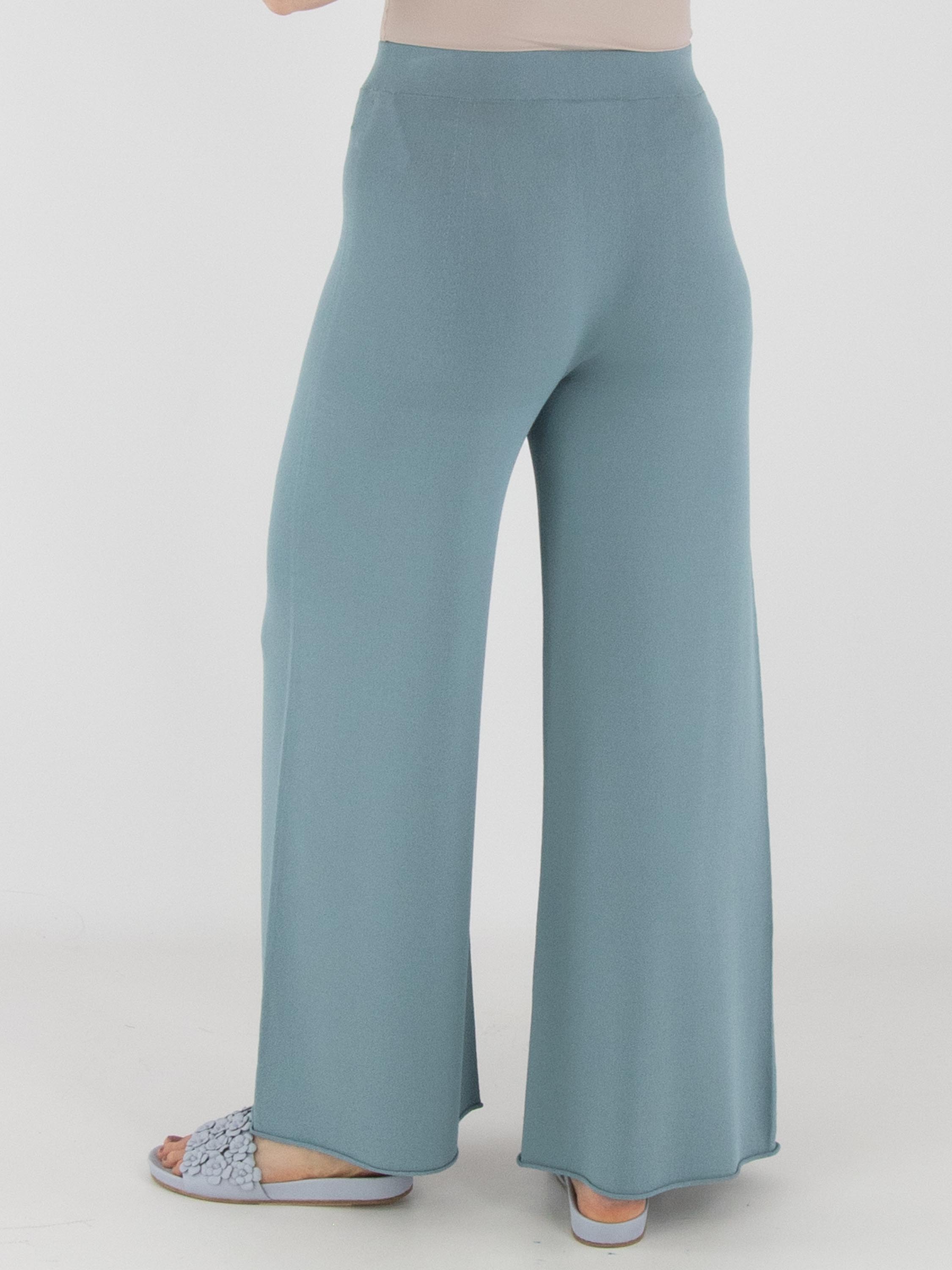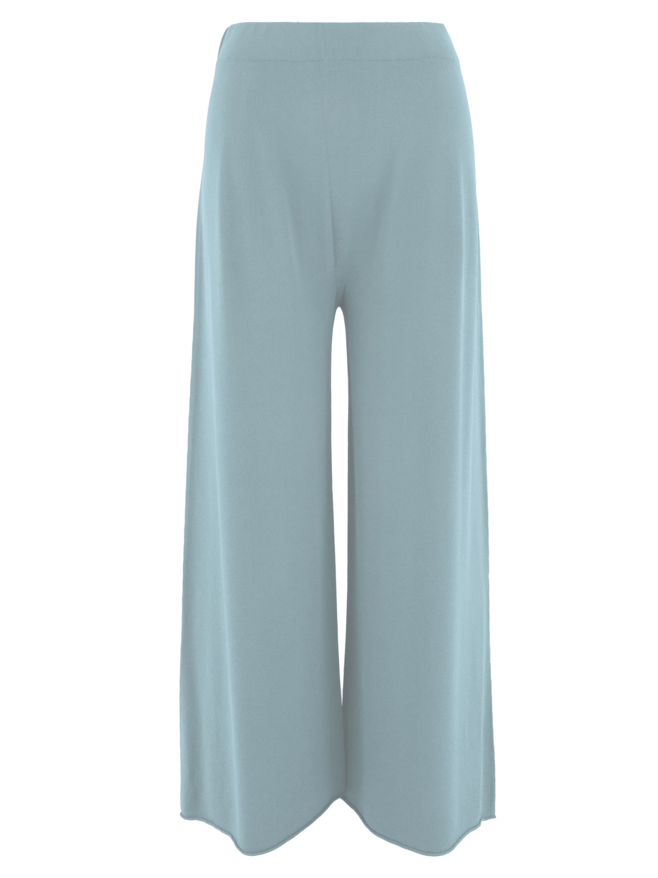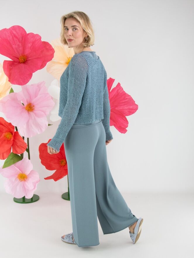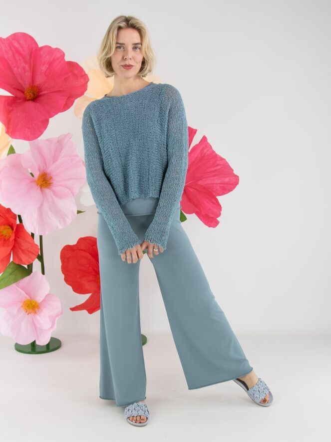 Eine fein gestrickte, weit geschnittene Jerseyhose von Annette Görtz in Petrolblau. Der Bund ist elastisch gearbeitet. Die Beinabschlüsse sind mit einer gerüschten Kante versehen. Diese Hose kann bei 30 Grad gewaschen werden.