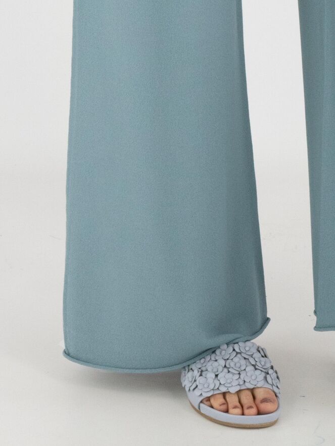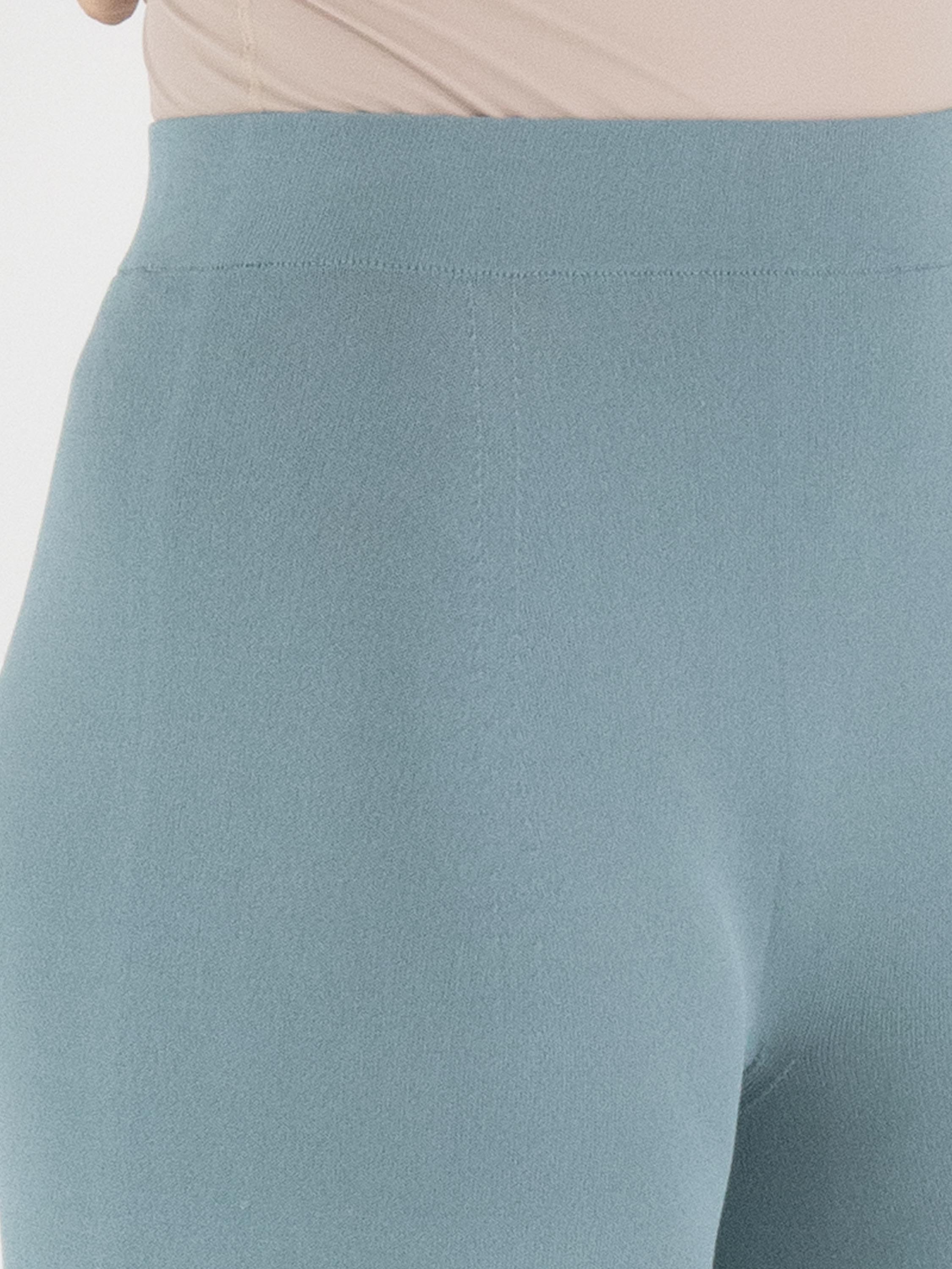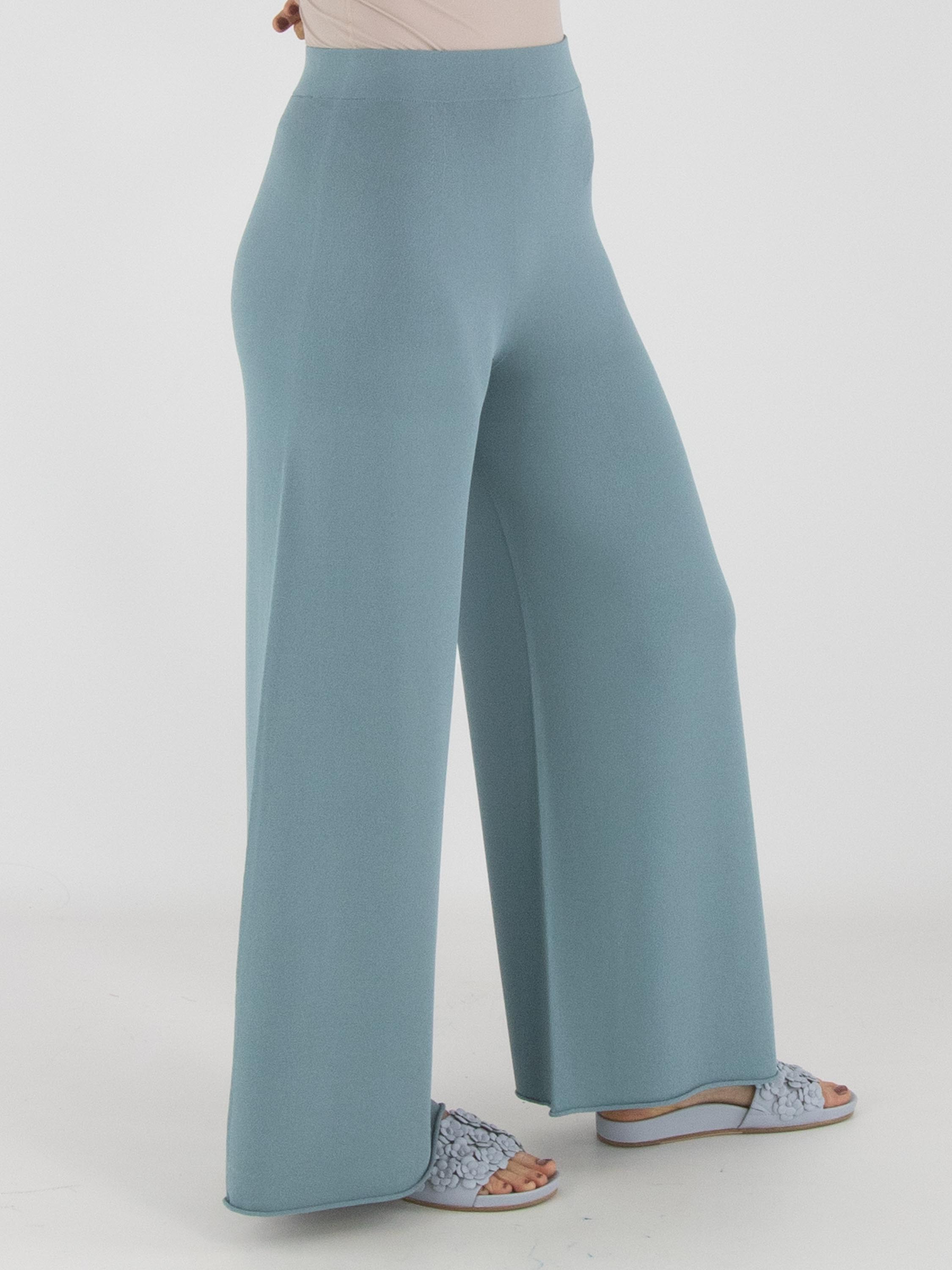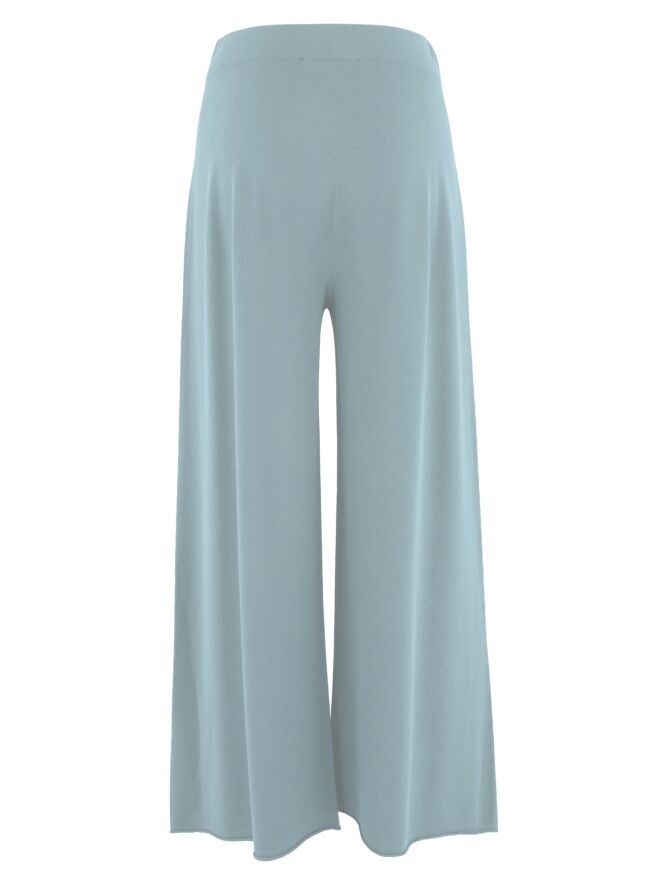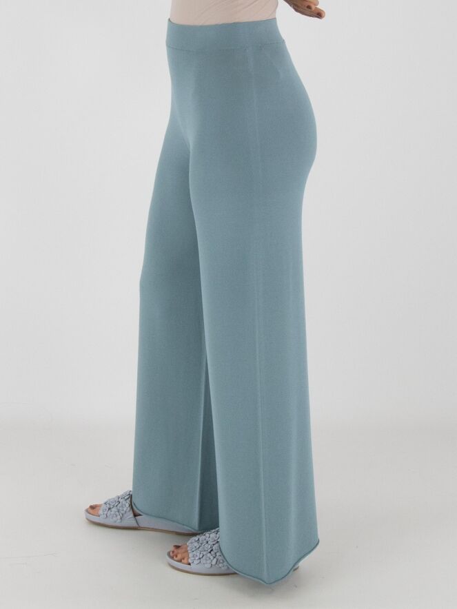 Eine fein gestrickte, weit geschnittene Jerseyhose von Annette Görtz in Petrolblau. Der Bund ist elastisch gearbeitet. Die Beinabschlüsse sind mit einer gerüschten Kante versehen. Diese Hose kann bei 30 Grad gewaschen werden.