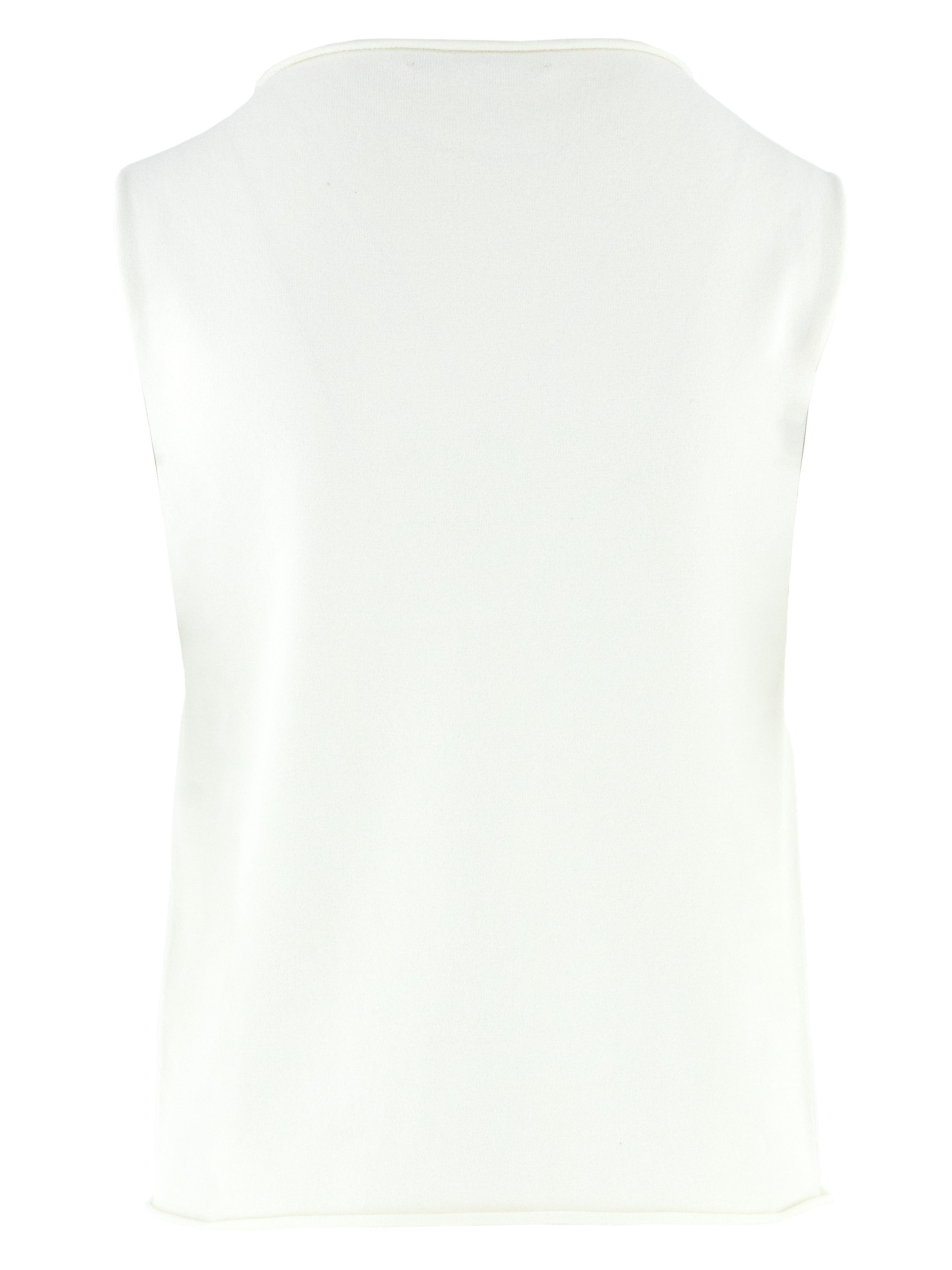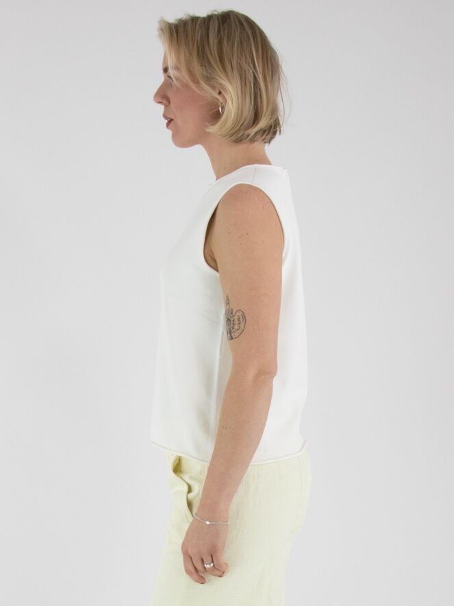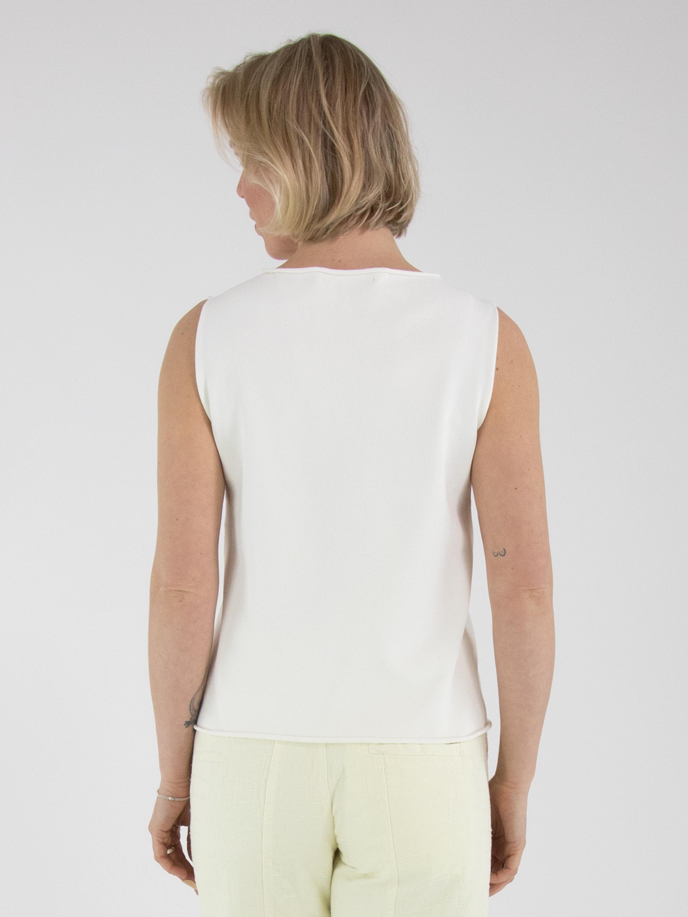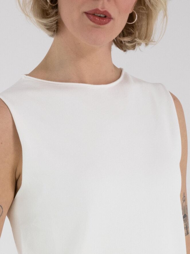 Ein Top von Annette Görtz in Cremeweiß. Der Rand des Rundhalsausschnitts, der Armausschnitte und des Saums ist gerüscht gearbeitet. Dieser Top kann bei 30 Grad gewaschen werden.
