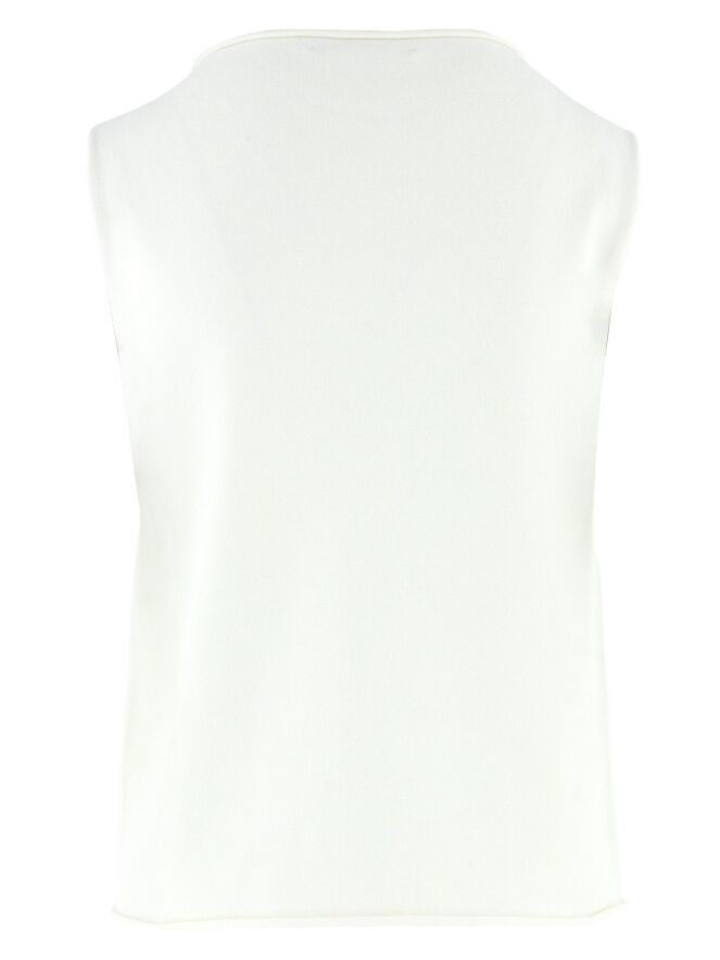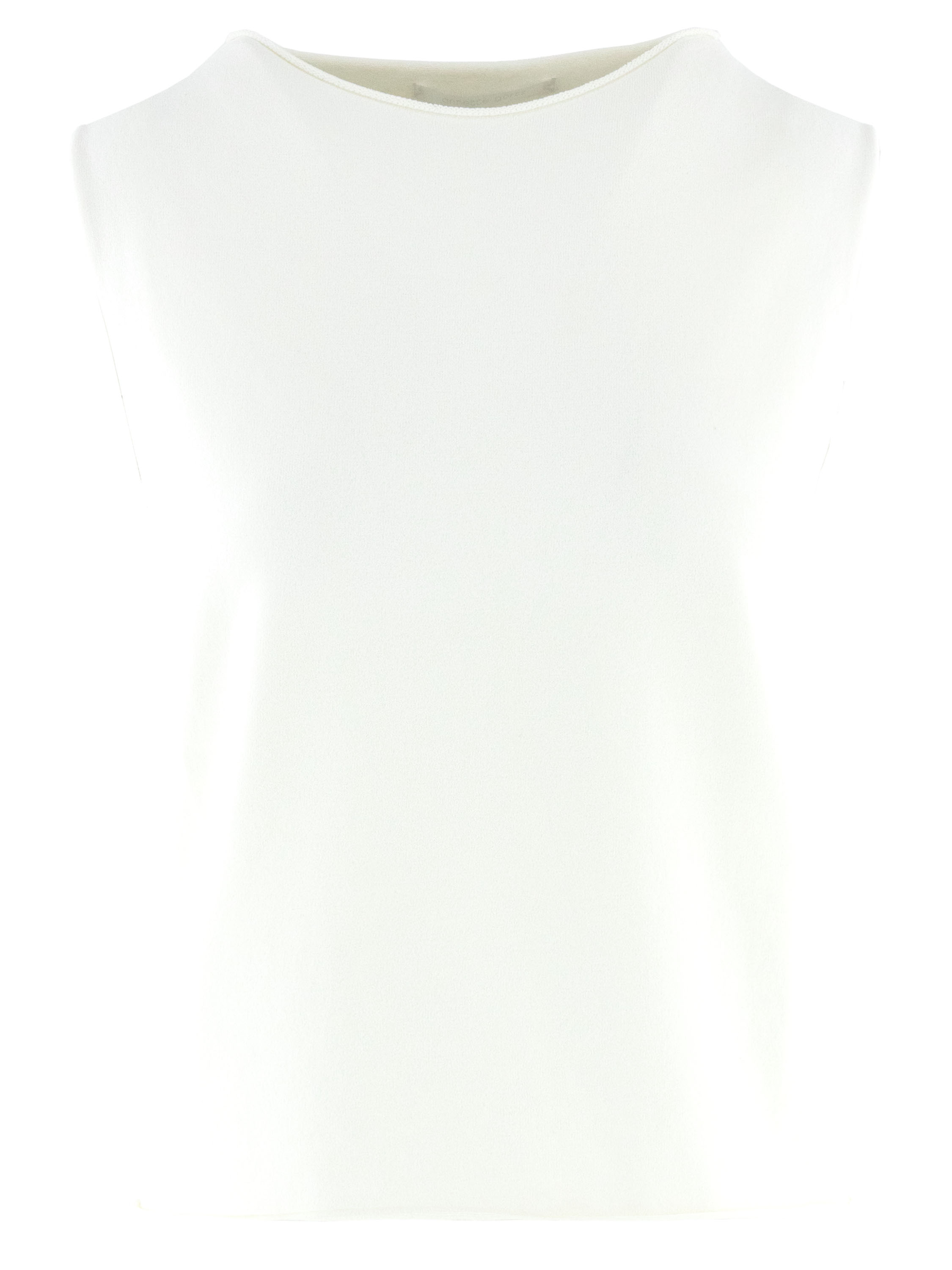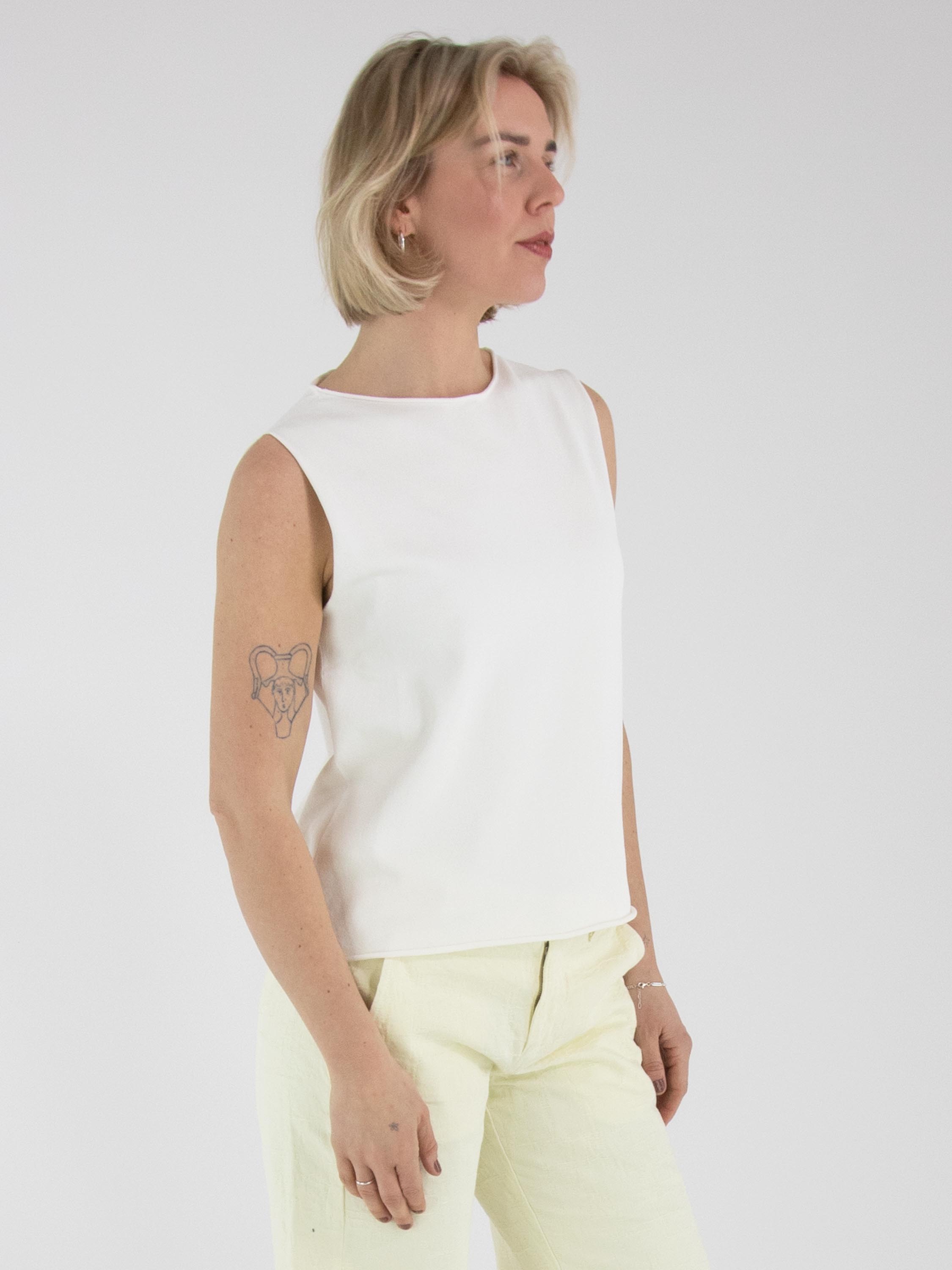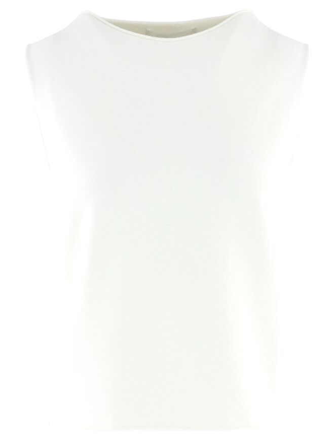 Ein Top von Annette Görtz in Cremeweiß. Der Rand des Rundhalsausschnitts, der Armausschnitte und des Saums ist gerüscht gearbeitet. Dieser Top kann bei 30 Grad gewaschen werden.