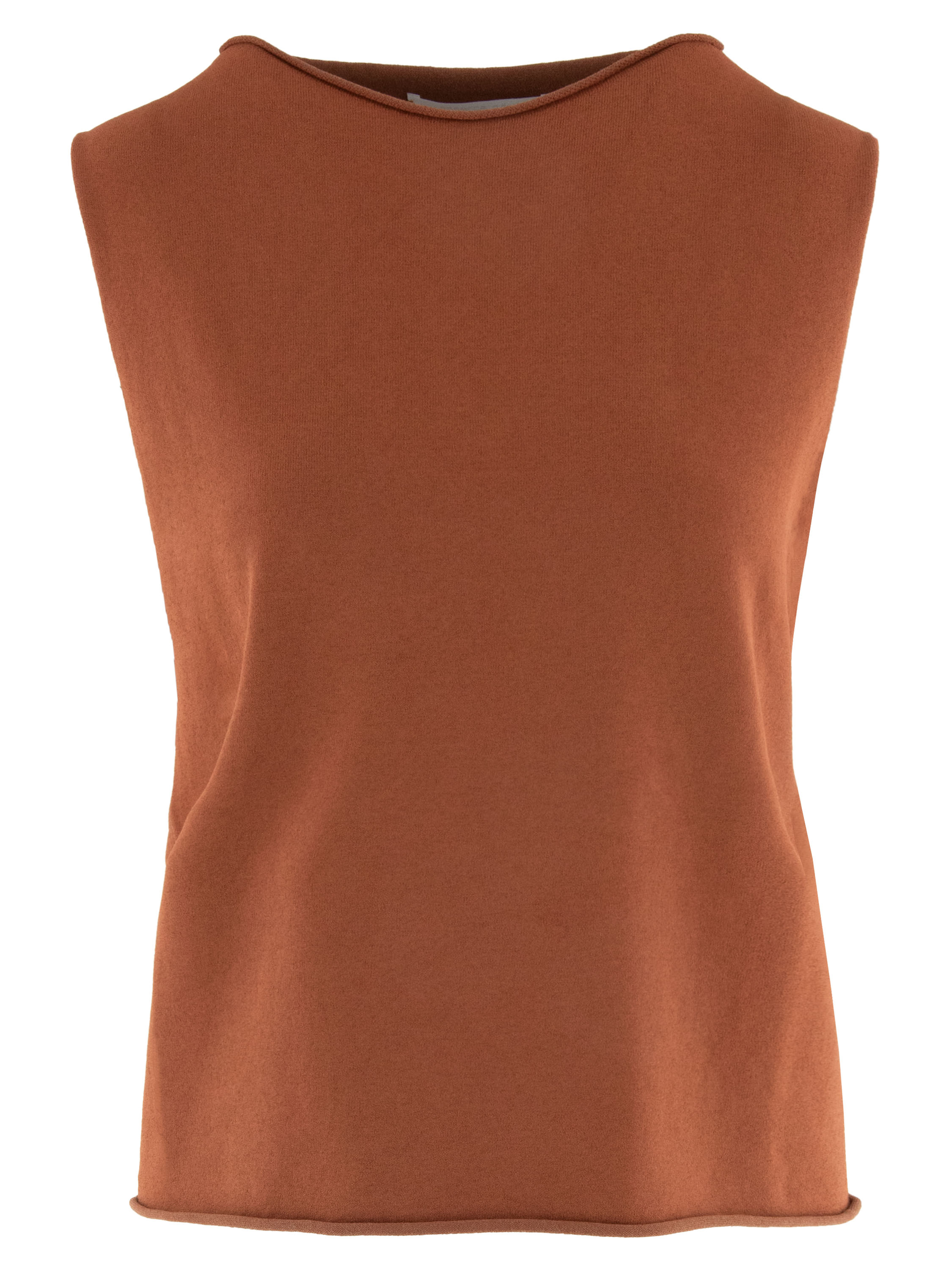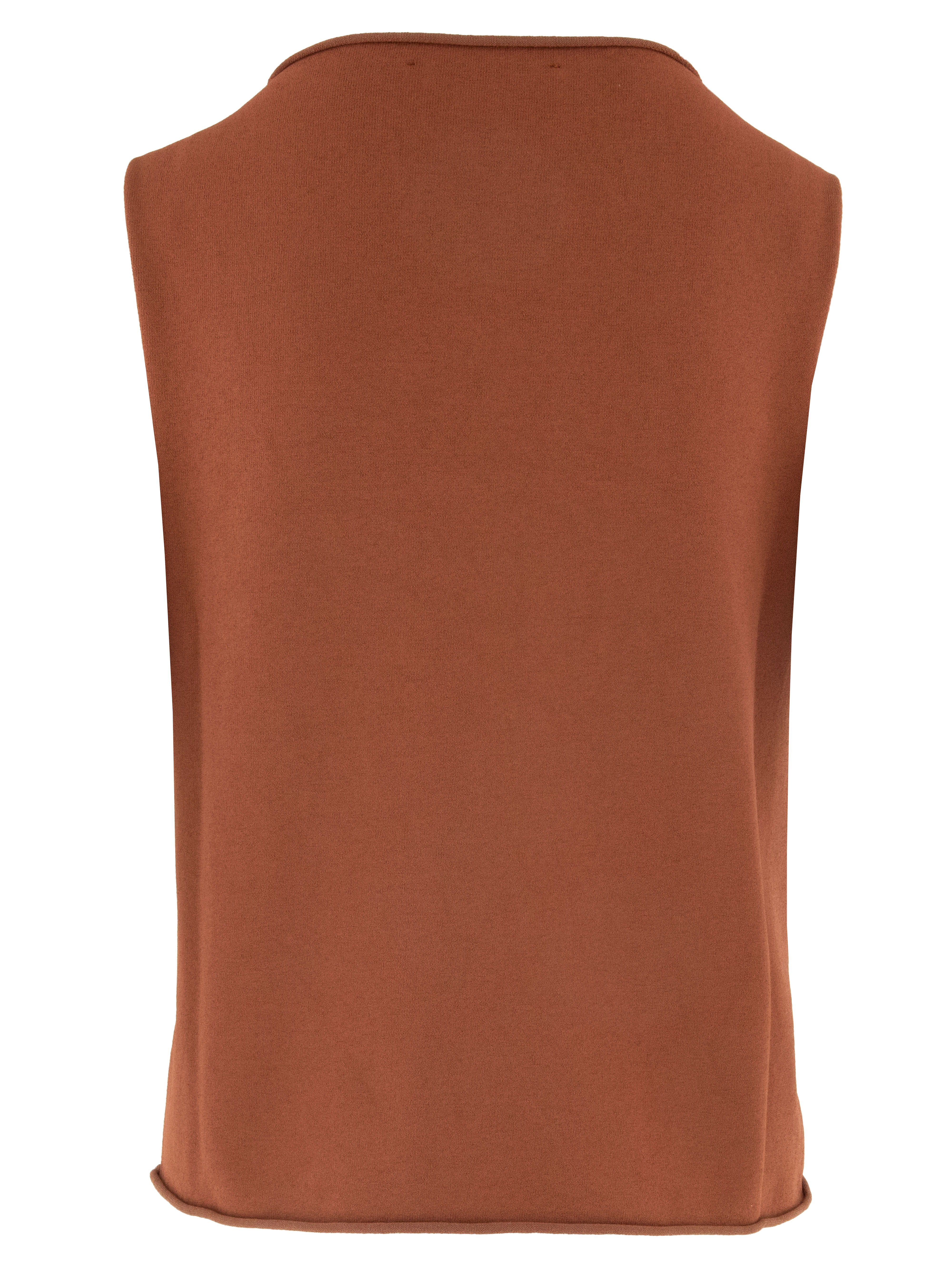 Ein Top von Annette Görtz in Rostbraun. Die Kanten des Rundhalsausschnitts, der Armausschnitte und des Saums sind gerüscht gearbeitet. Dieser Top kann bei 30 Grad gewaschen werden.