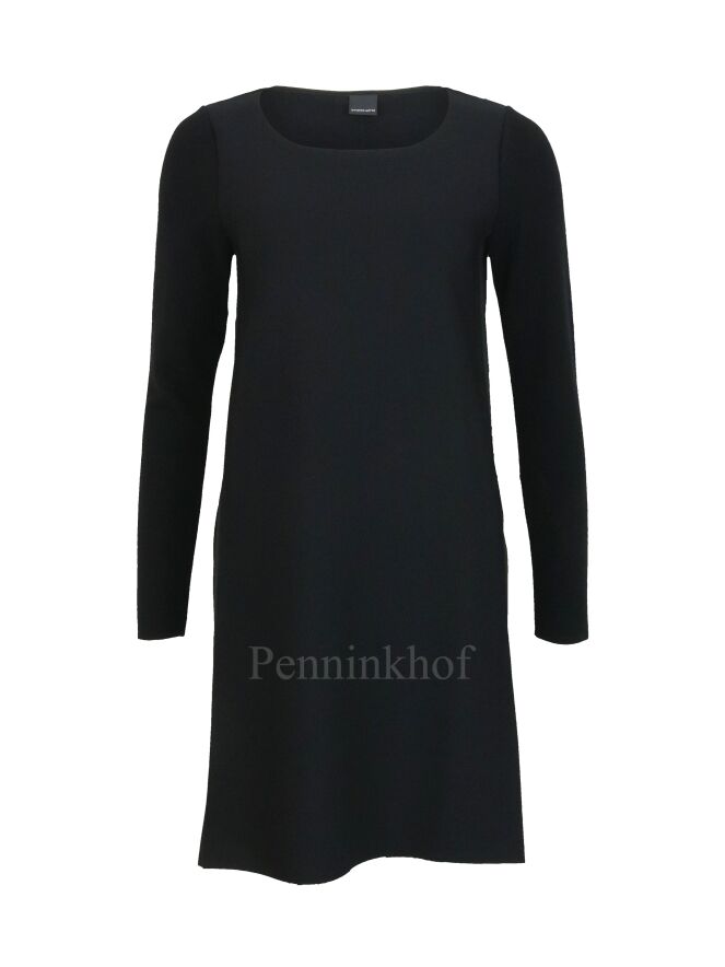 Ein schwarzes Kleid der Designermode von Annette Görtz. Beiden Seiten des Kleides sind mit umgekehrten Nähten und einem mattschwarzen Band dazwischen versehen. Das Kleid hat einen Rundhalsausschnitt, lange Ärmel und kann von Hand gewaschen werden.