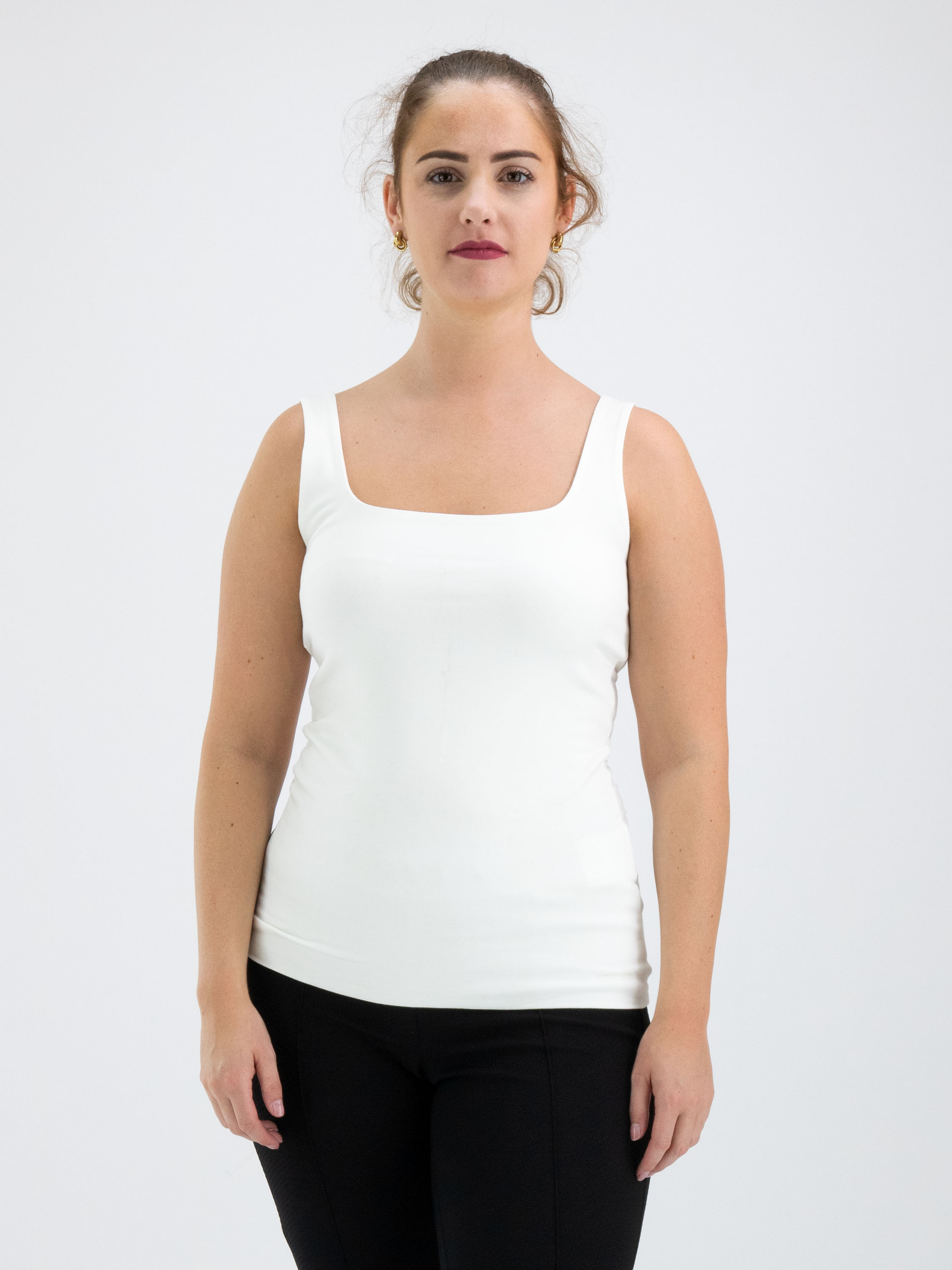 Ein Top von Annette Görtz in Cremeweiß. Das Top hat einen weiten runden Ausschnitt und die Schulterträger sind 3 cm breit. Dieses Top kann bei 30 Grad gewaschen werden.