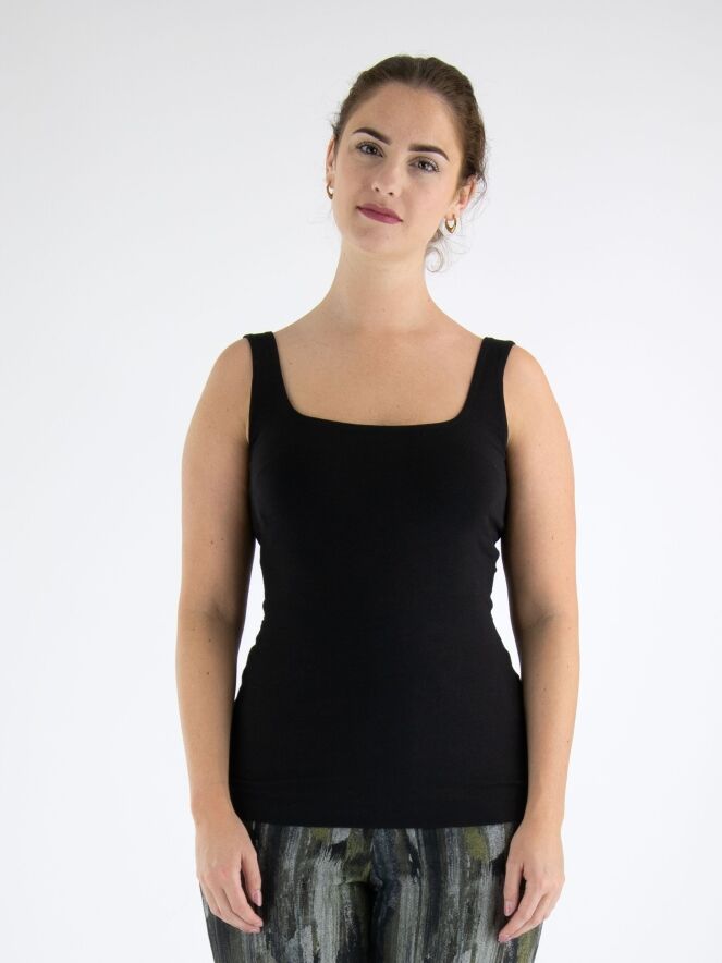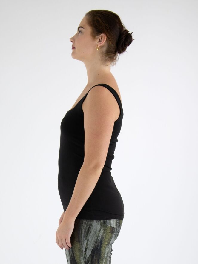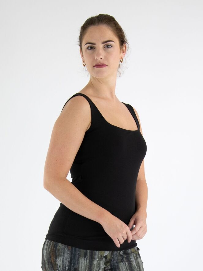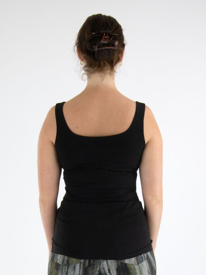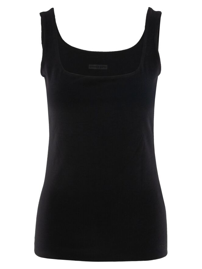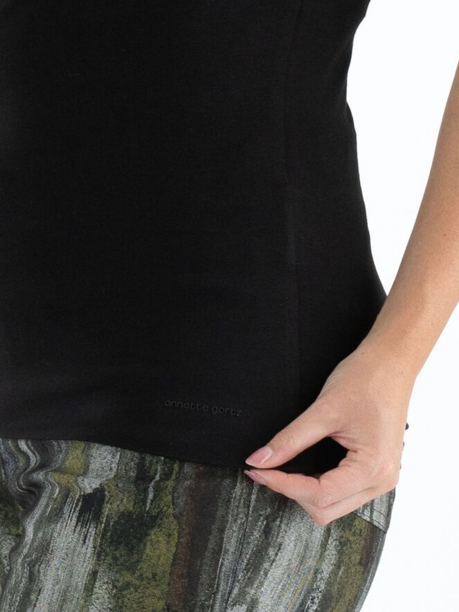 Ein Top von Annette Görtz in Schwarz. Das Top hat einen weiten Rundhalsausschnitt und die Schulterträger sind 3 cm breit. Dieses Top kann bei 30 Grad gewaschen werden.