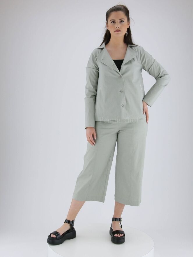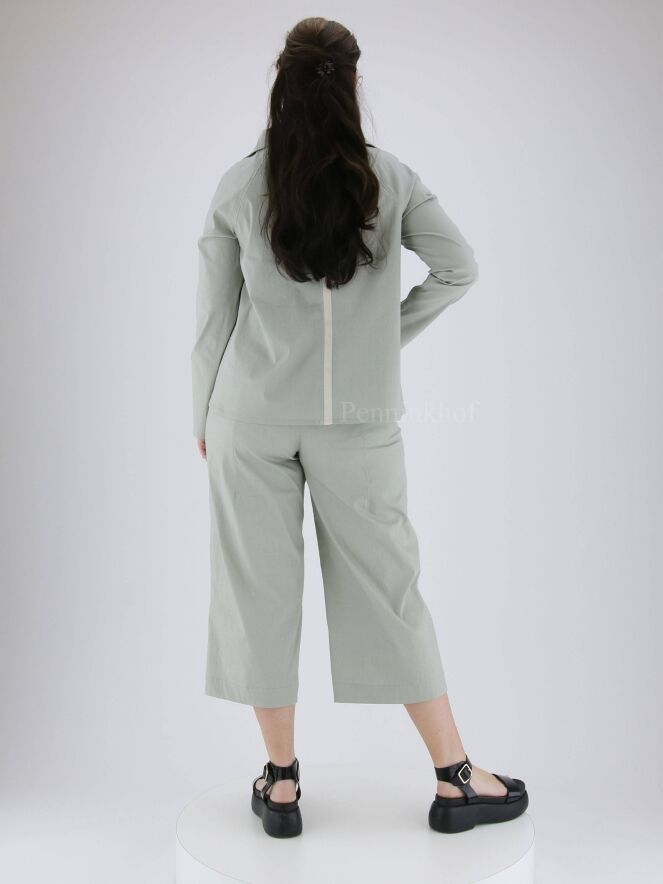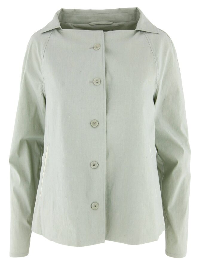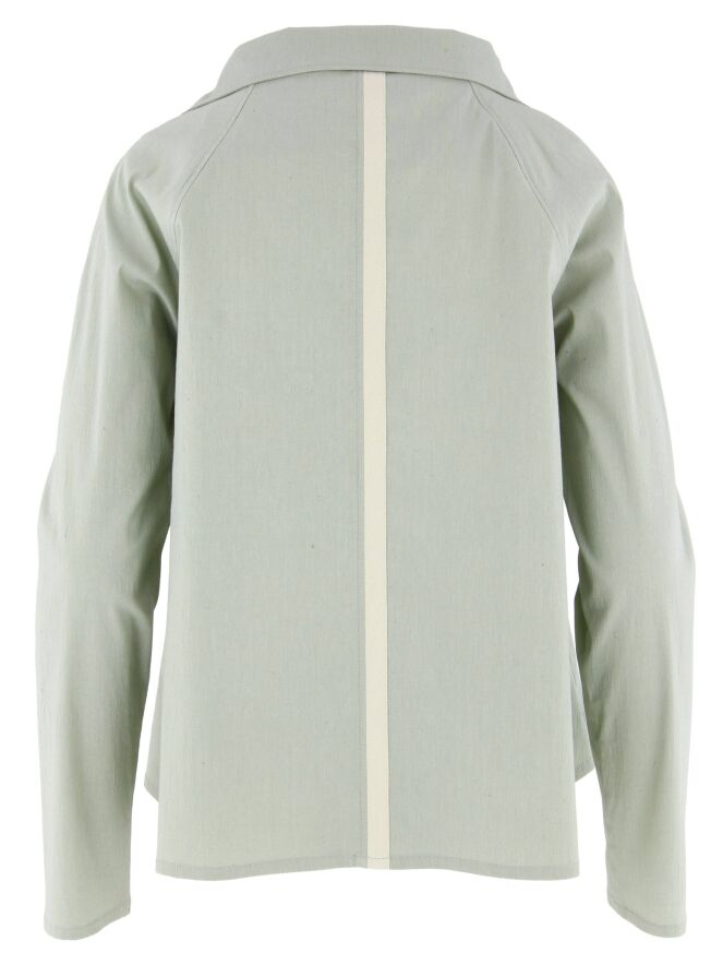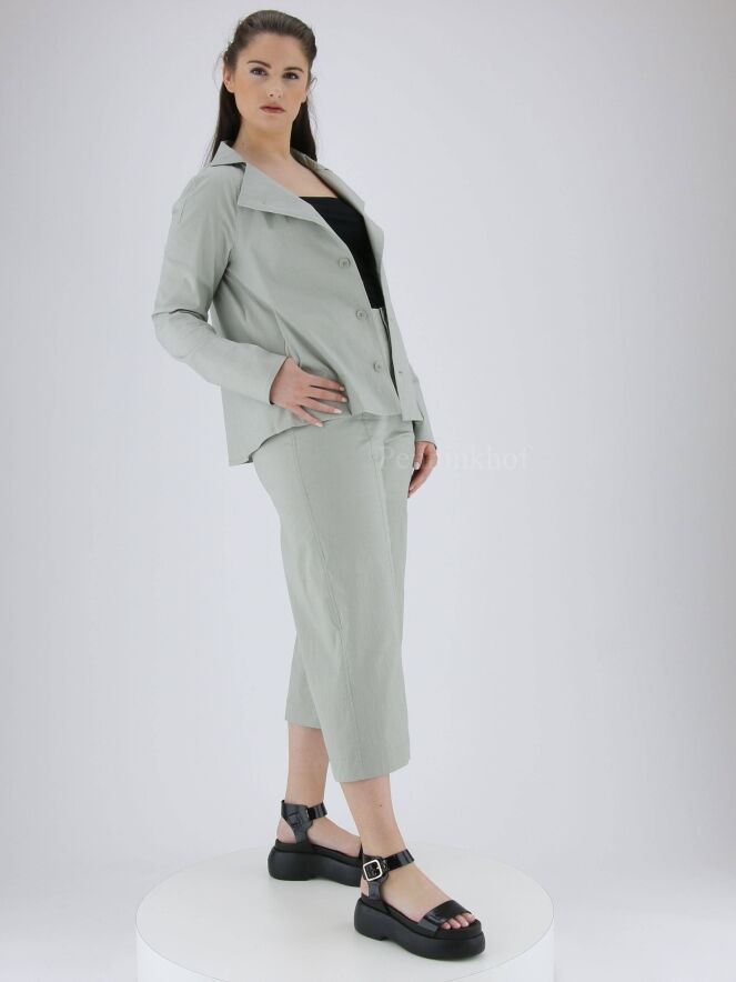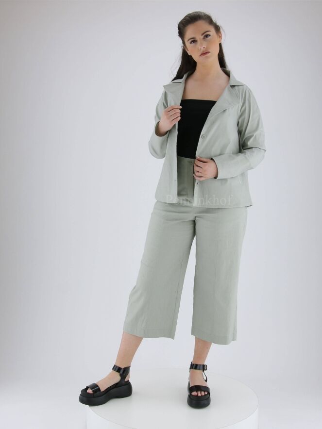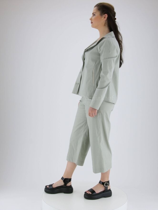 Ein Blazer der Designermode von Annette Görtz in Mintgrün / Hellgrau. Der Blazer hat einen eckigen Ausschnitt und eine A-Linie. Die Kante der Eingriffstaschen ist mit einem weißen Besatz versehen. Der Blazer wird mit fünf Knöpfen geschlossen und ist nicht gefüttert. Dieser Blazer kann bei 30 Grad gewaschen werden.