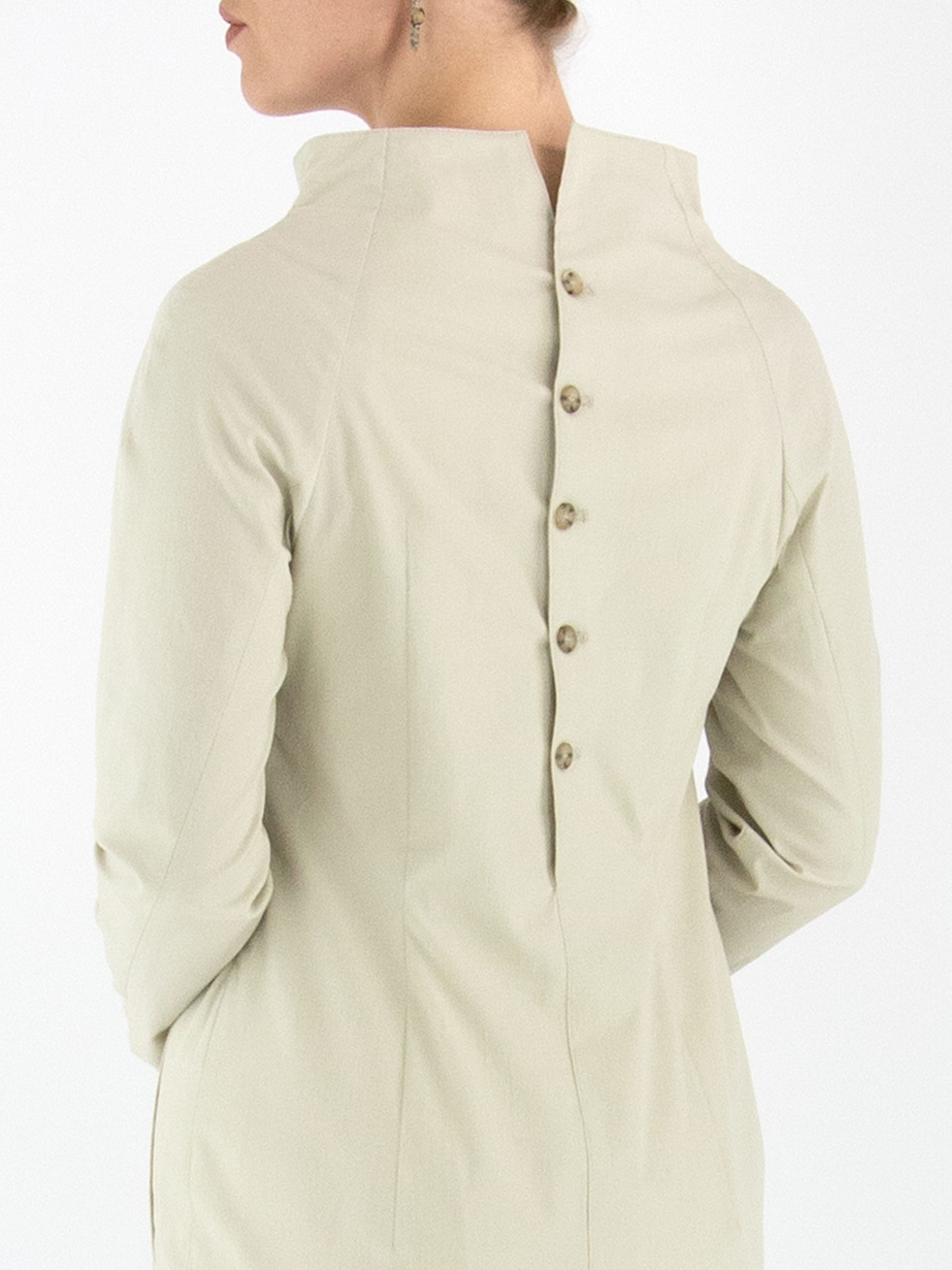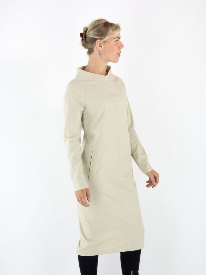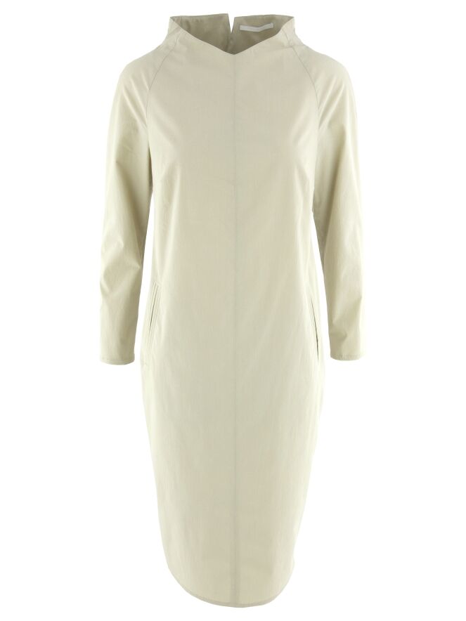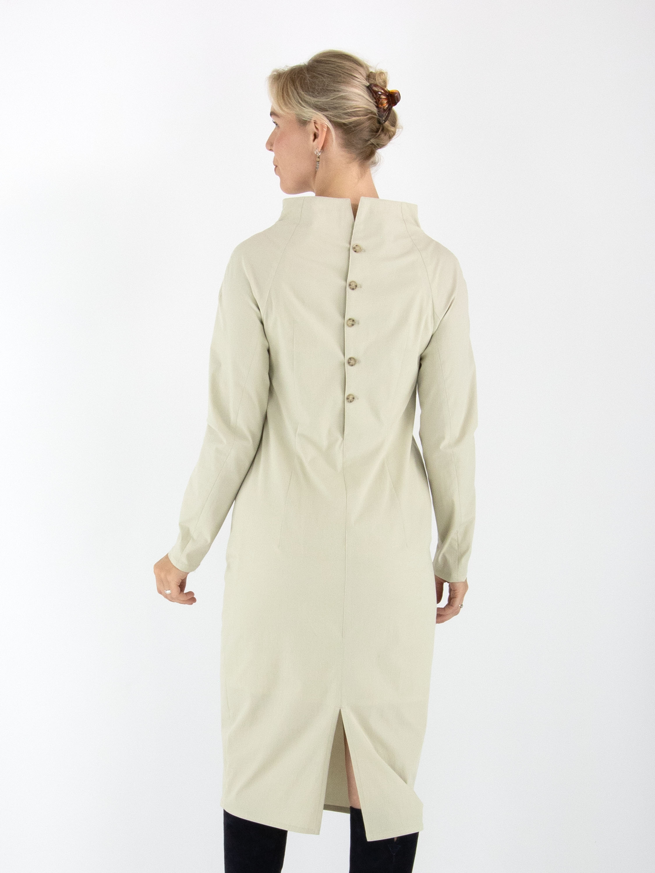 Ein Kleid von Annette Görtz in Sandfarbe. Das Kleid hat einen hohen V-Ausschnitt und Eingrifftaschen auf Taillenhöhe. Auf der Rückseite verläuft eine Knopfleiste von der Halslinie bis zur Taille. Das Kleid ist gefüttert und sollte von Hand gewaschen werden.