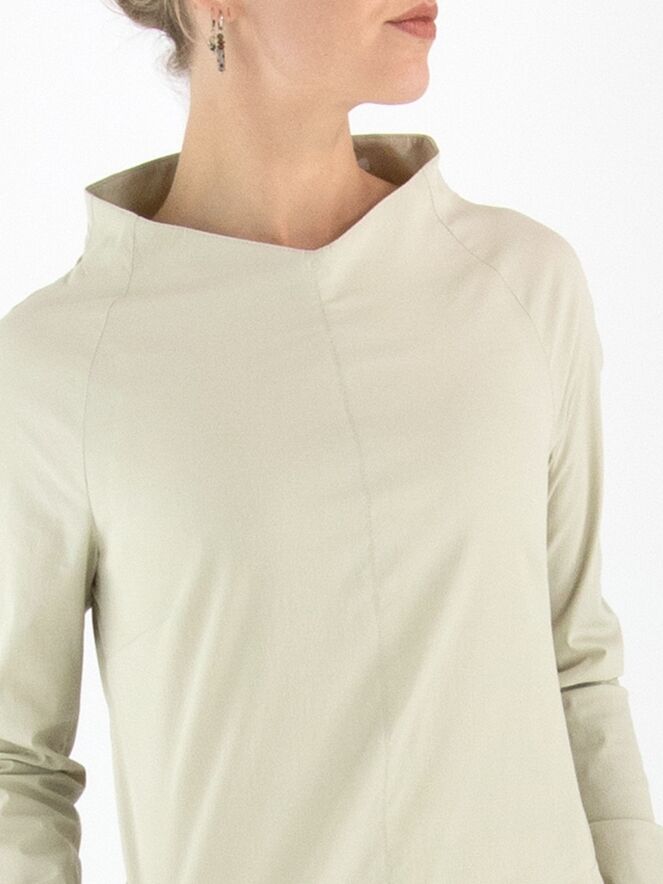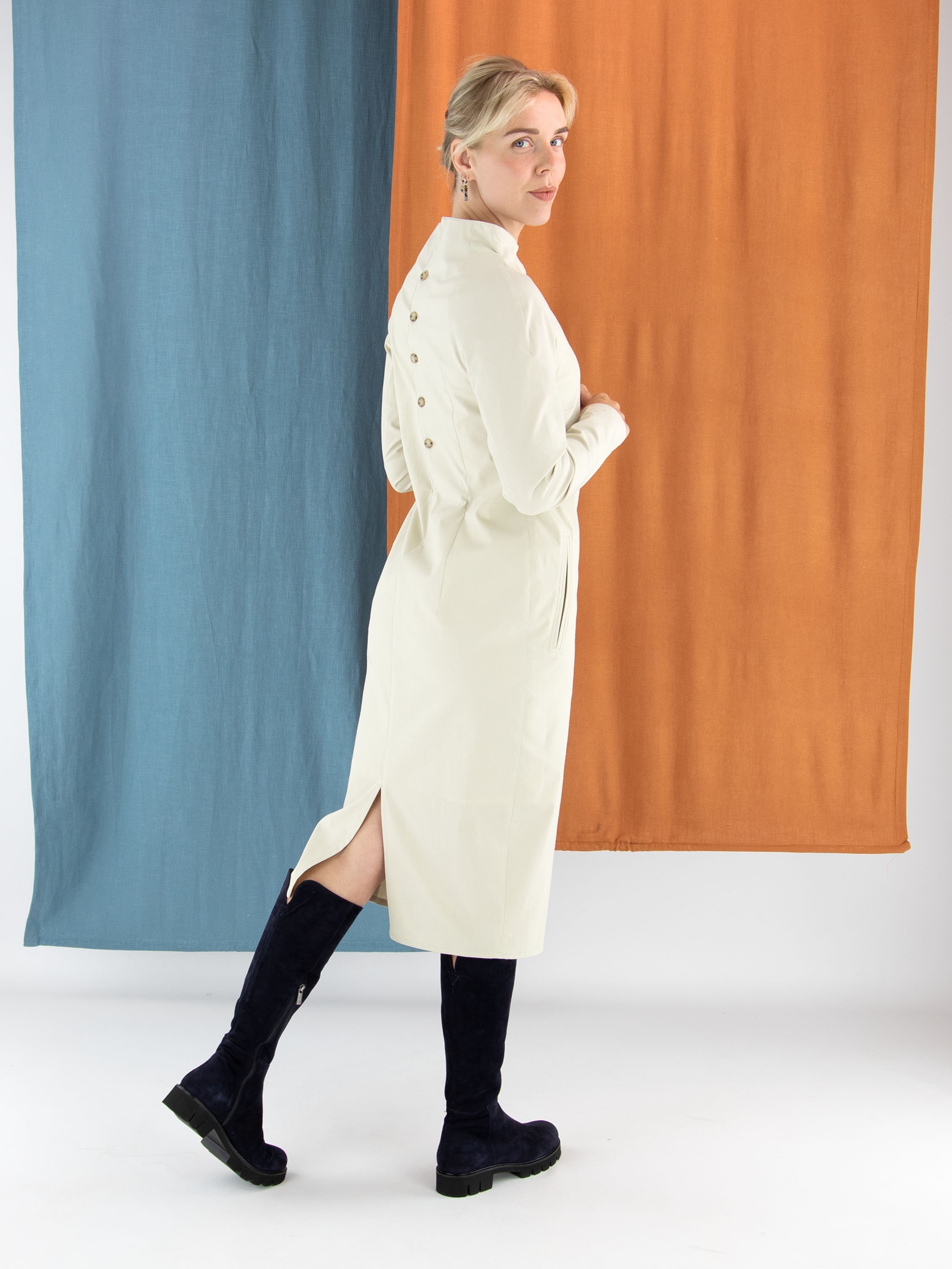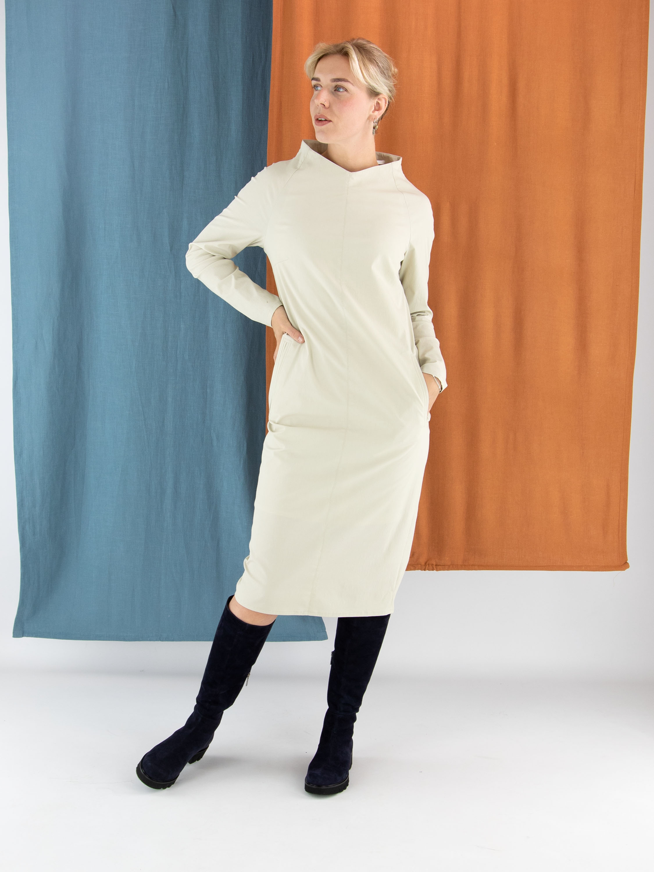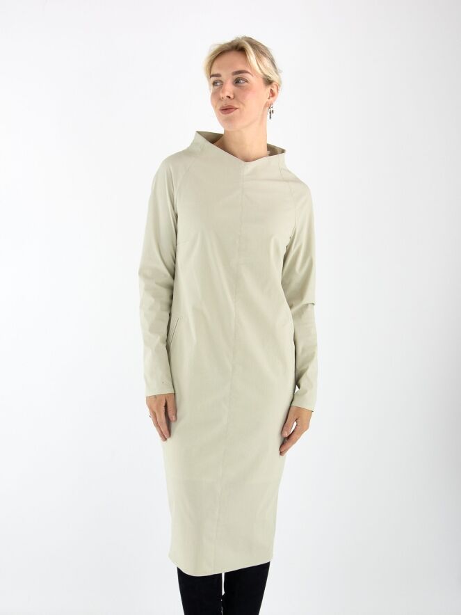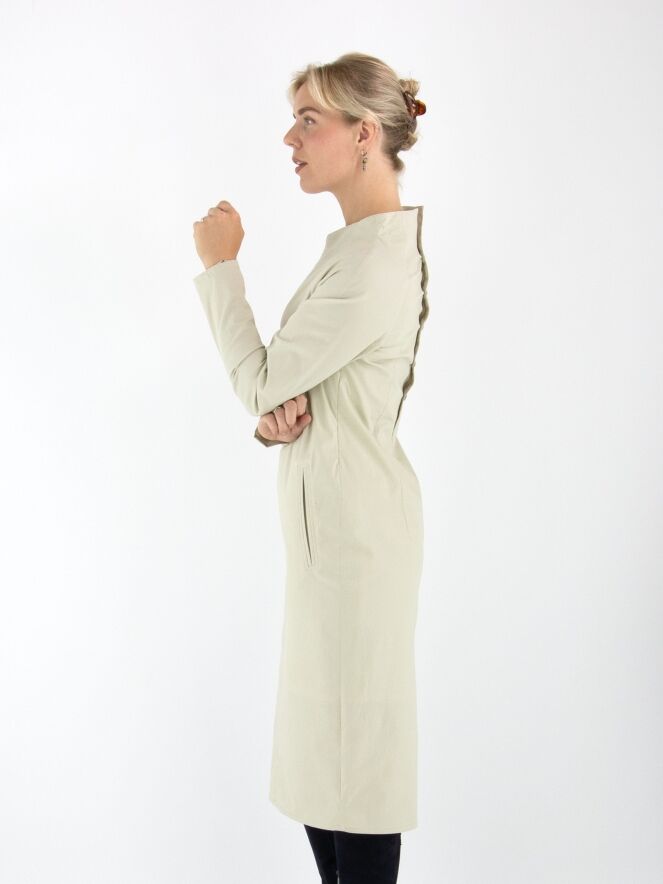 Ein Kleid von Annette Görtz in Sandfarbe. Das Kleid hat einen hohen V-Ausschnitt und Eingrifftaschen auf Taillenhöhe. Auf der Rückseite verläuft eine Knopfleiste von der Halslinie bis zur Taille. Das Kleid ist gefüttert und sollte von Hand gewaschen werden.