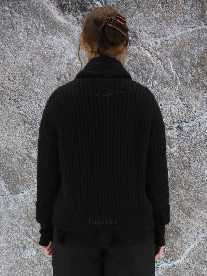 Ein offenmaschiger Cardigan der Designermode von Annette Görtz in Schwarz. Der Verschluss erfolgt mit einem Druckknopf mit einem dekorativen Lederstreifen. Der Cardigan hat einen gefalteten Rollkragen und kann von Hand gewaschen werden.