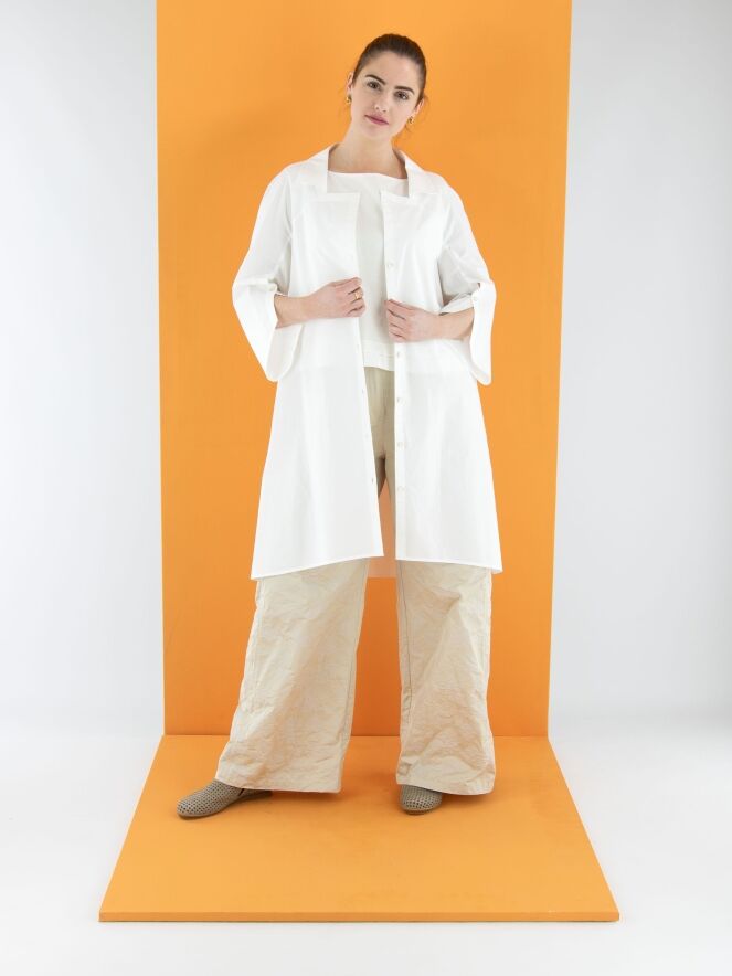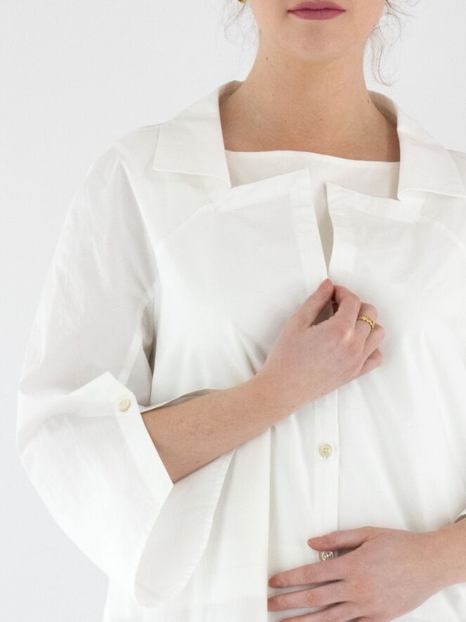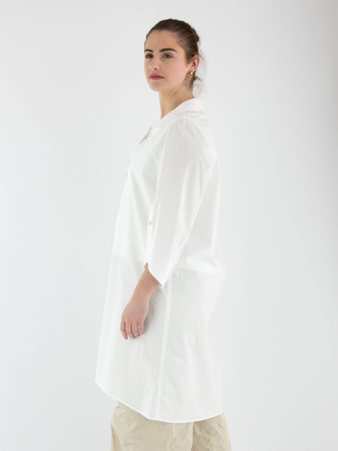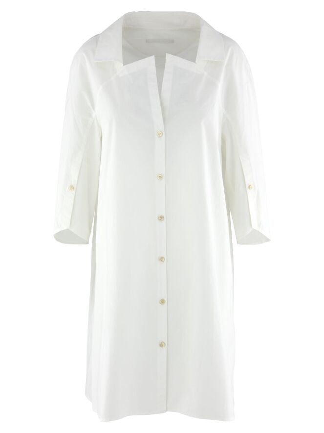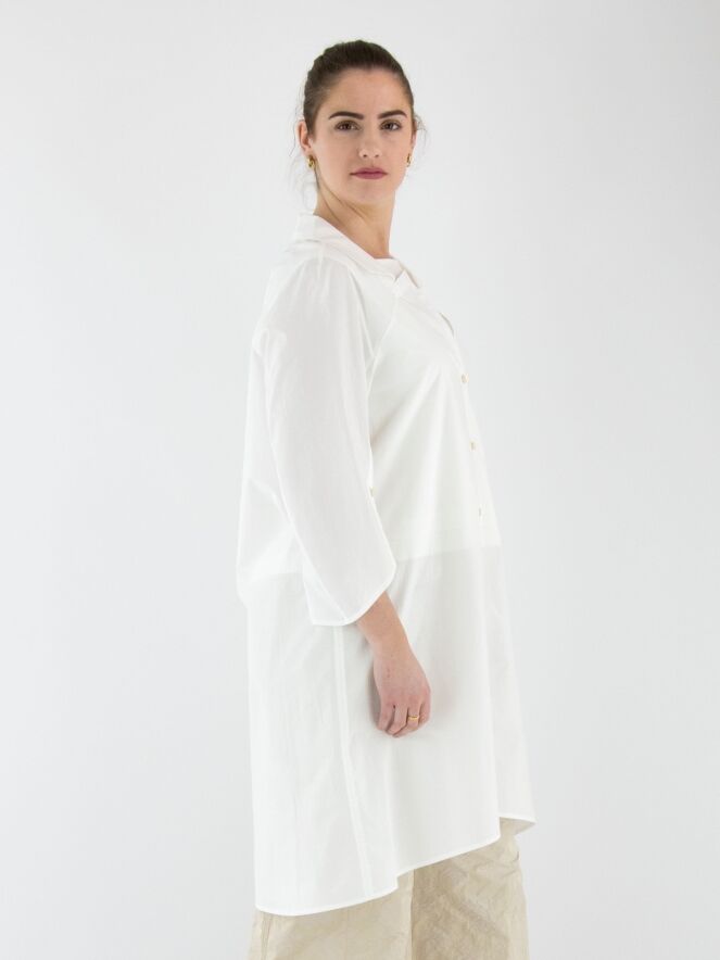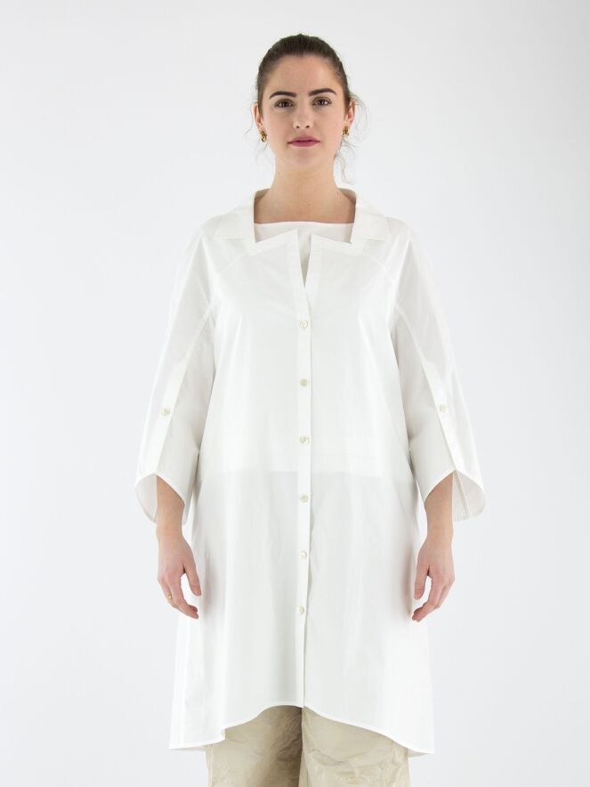 Eine lange Bluse von Annette Görtz in Weiß. Die Bluse hat einen quadratischen Ausschnitt mit Kragen. Die Enden der halblangen Ärmel verfügen über einen tiefen Schlitz mit Knopfverschluss. Diese Bluse kann bei 30 Grad gewaschen werden.