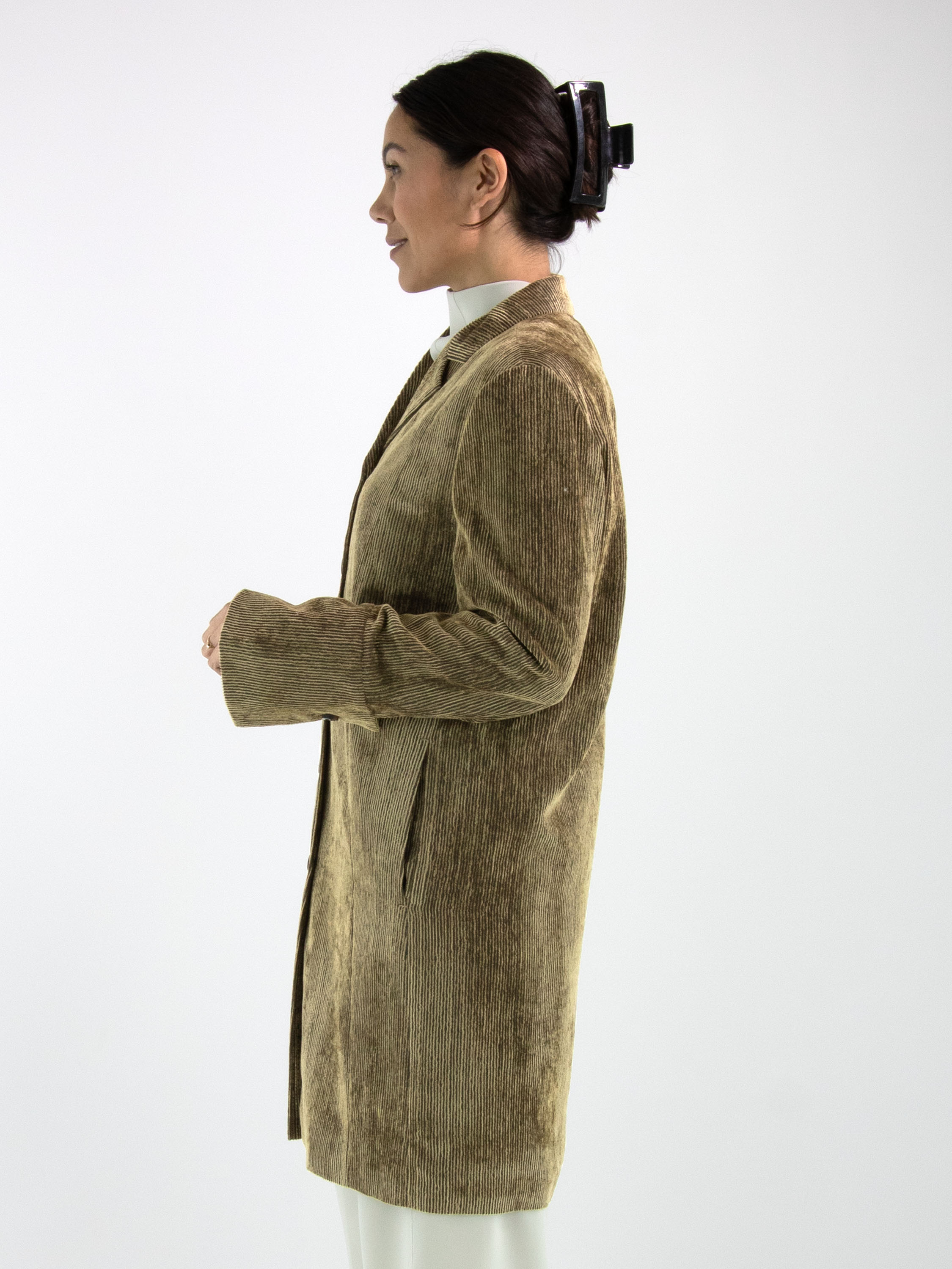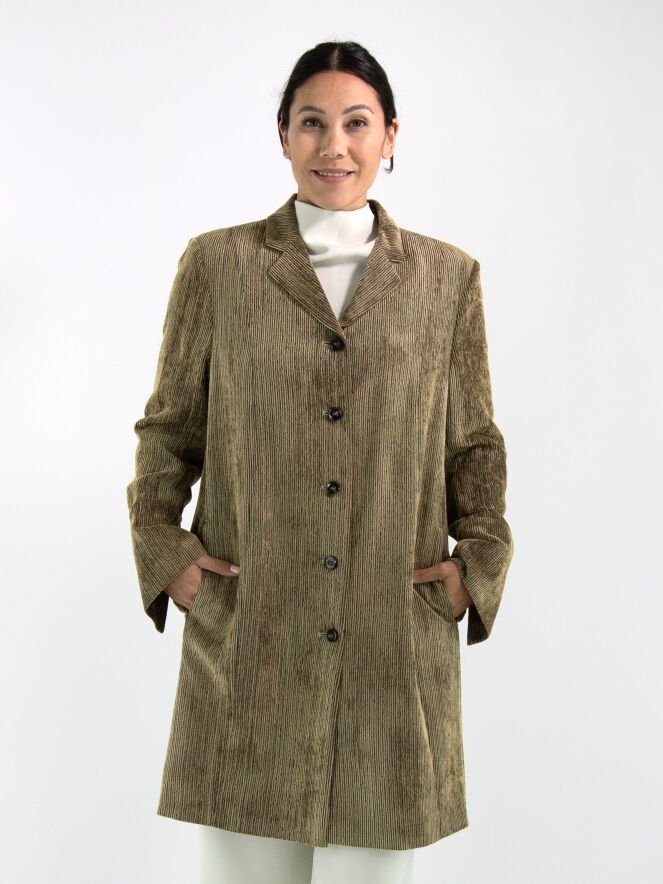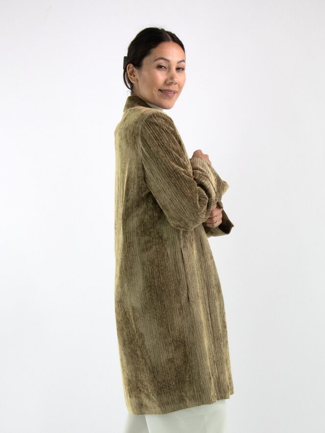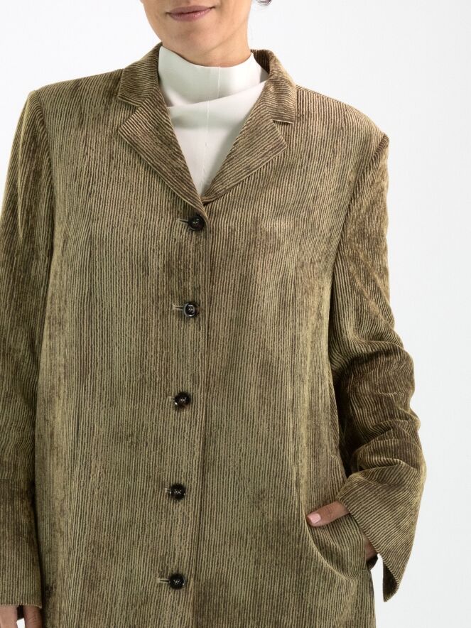 Langer Blazer aus Rippcord von Annette Görtz in verschiedenen Olivgrüntönen, die je nach Strichrichtung variieren. Der Blazer hat eine Knopfleiste mit fünf Knöpfen und ist komplett gefüttert. Dieser Blazer darf nicht gewaschen werden.
