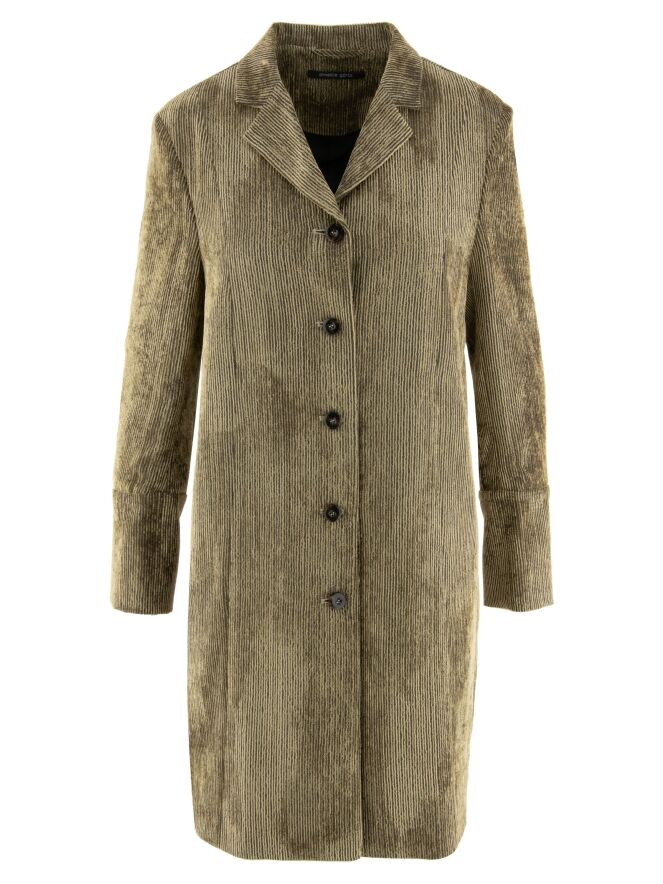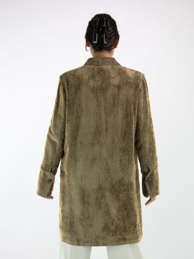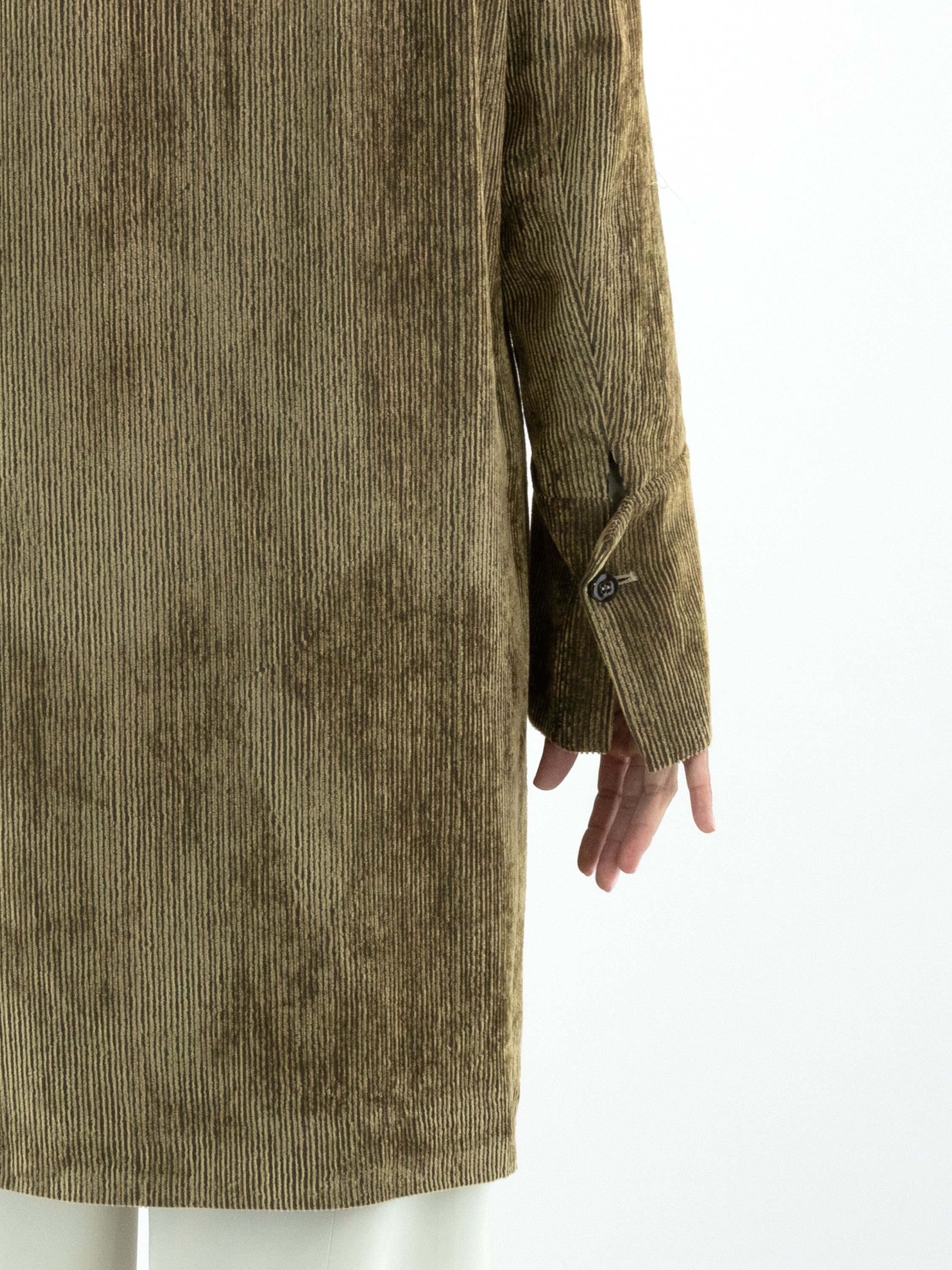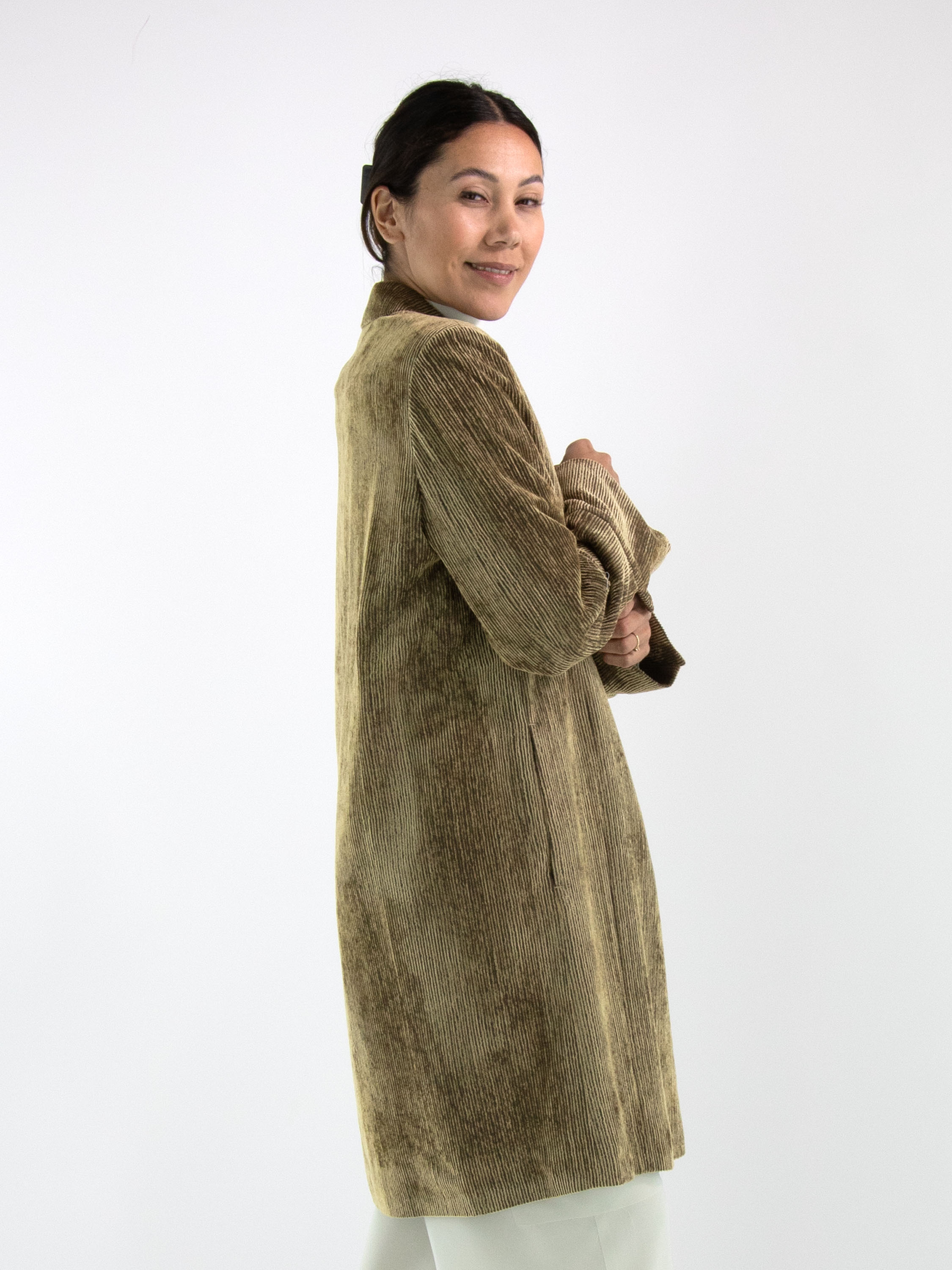 Langer Blazer aus Rippcord von Annette Görtz in verschiedenen Olivgrüntönen, die je nach Strichrichtung variieren. Der Blazer hat eine Knopfleiste mit fünf Knöpfen und ist komplett gefüttert. Dieser Blazer darf nicht gewaschen werden.