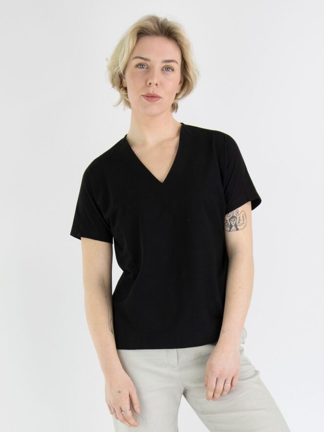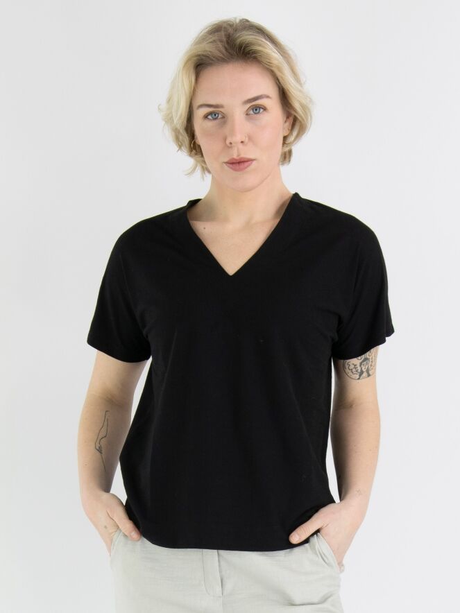 Ein Shirt von Annette Görtz in der Farbe schwarz. Das Shirt hat kurze Ärmel und einen V - Ausschnitt. Dieses Shirt kann bei 30 Grad gewaschen werden.