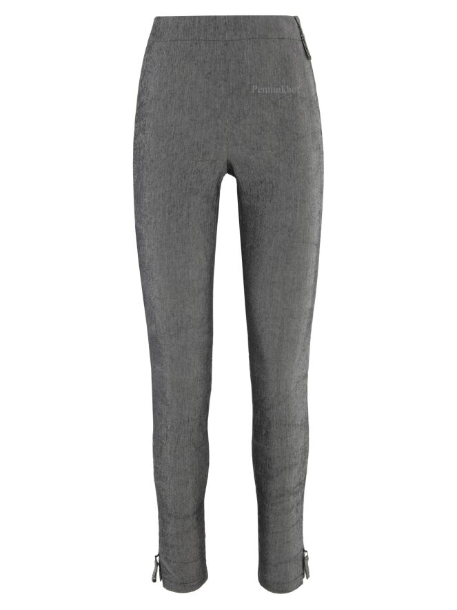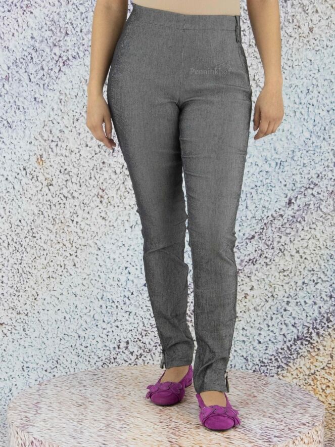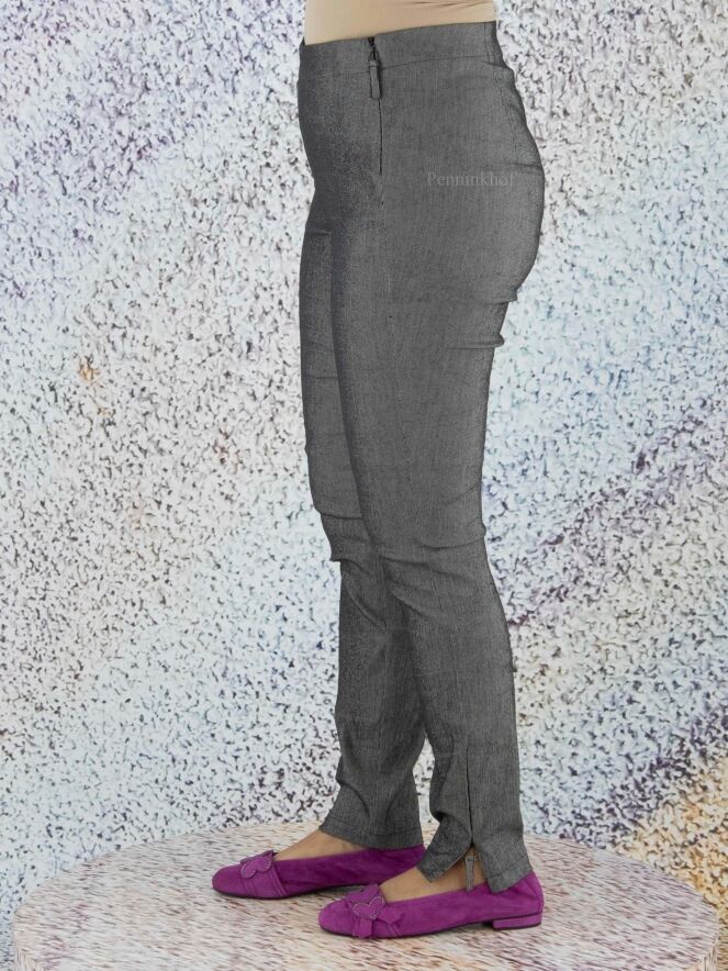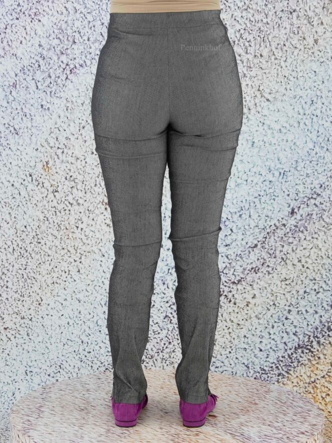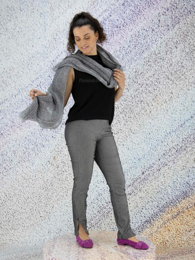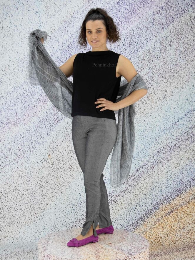 Eine Hose der Designermode von Annette Görtz mit vertikal gestreifter Struktur in Schwarz-Cremeweiß, die einen dunkelgrauen Effekt ergibt. Der Taillenbund ist dehnbar. Am Abschluss der Hosenbeine befindet sich ein Reißverschluss auf beiden Seiten. Diese Hose kann bei 30 Grad gewaschen werden.