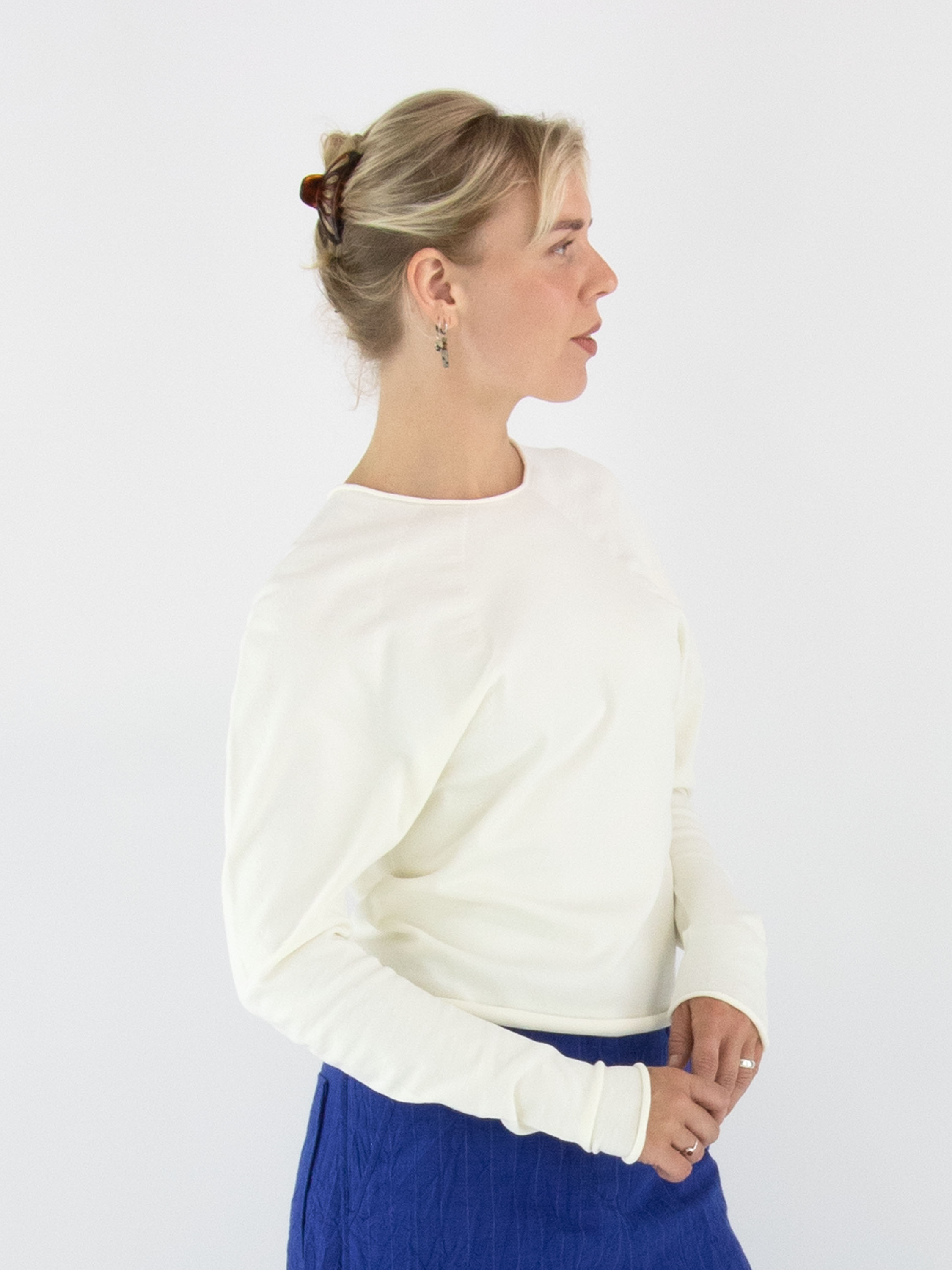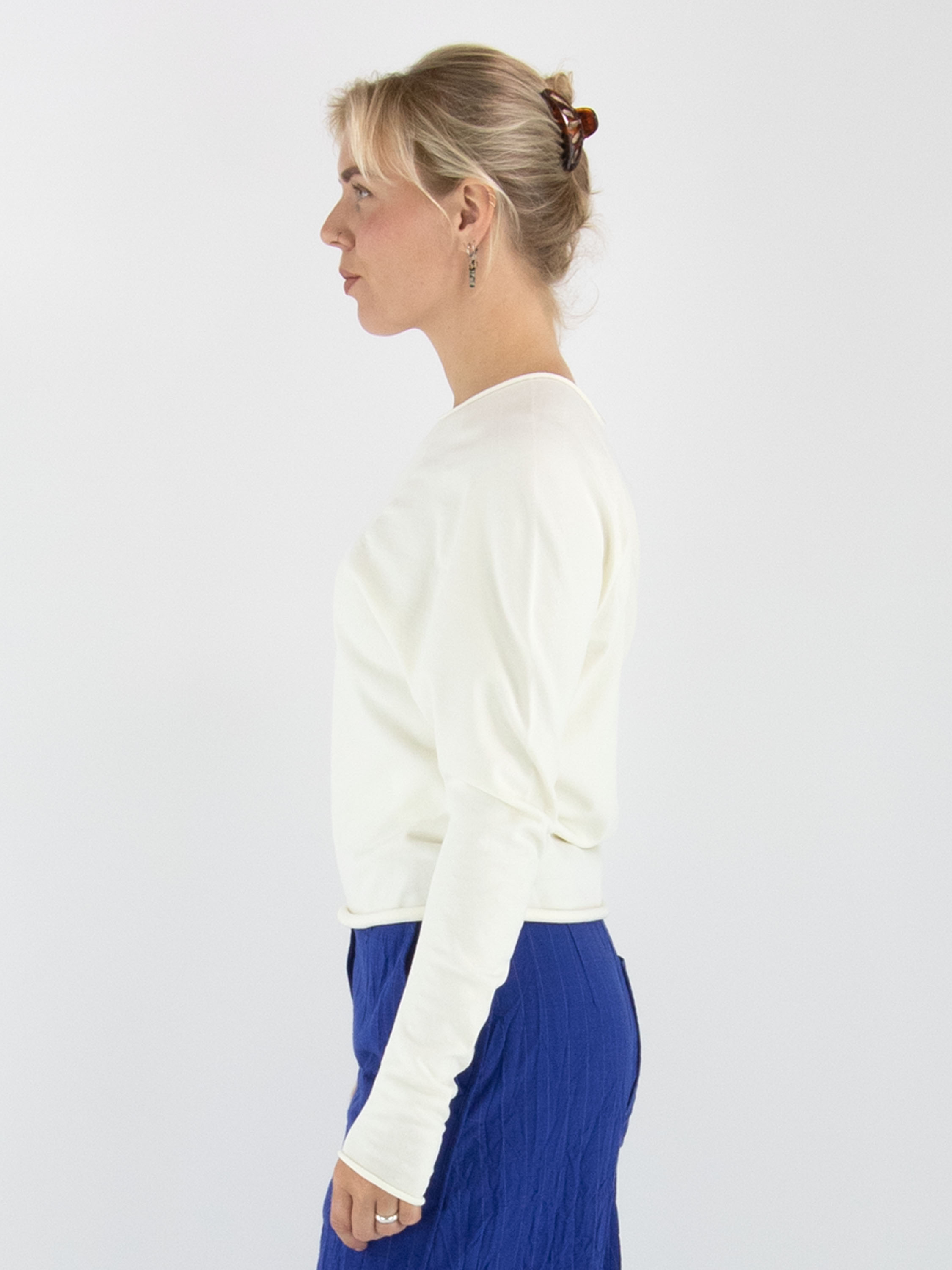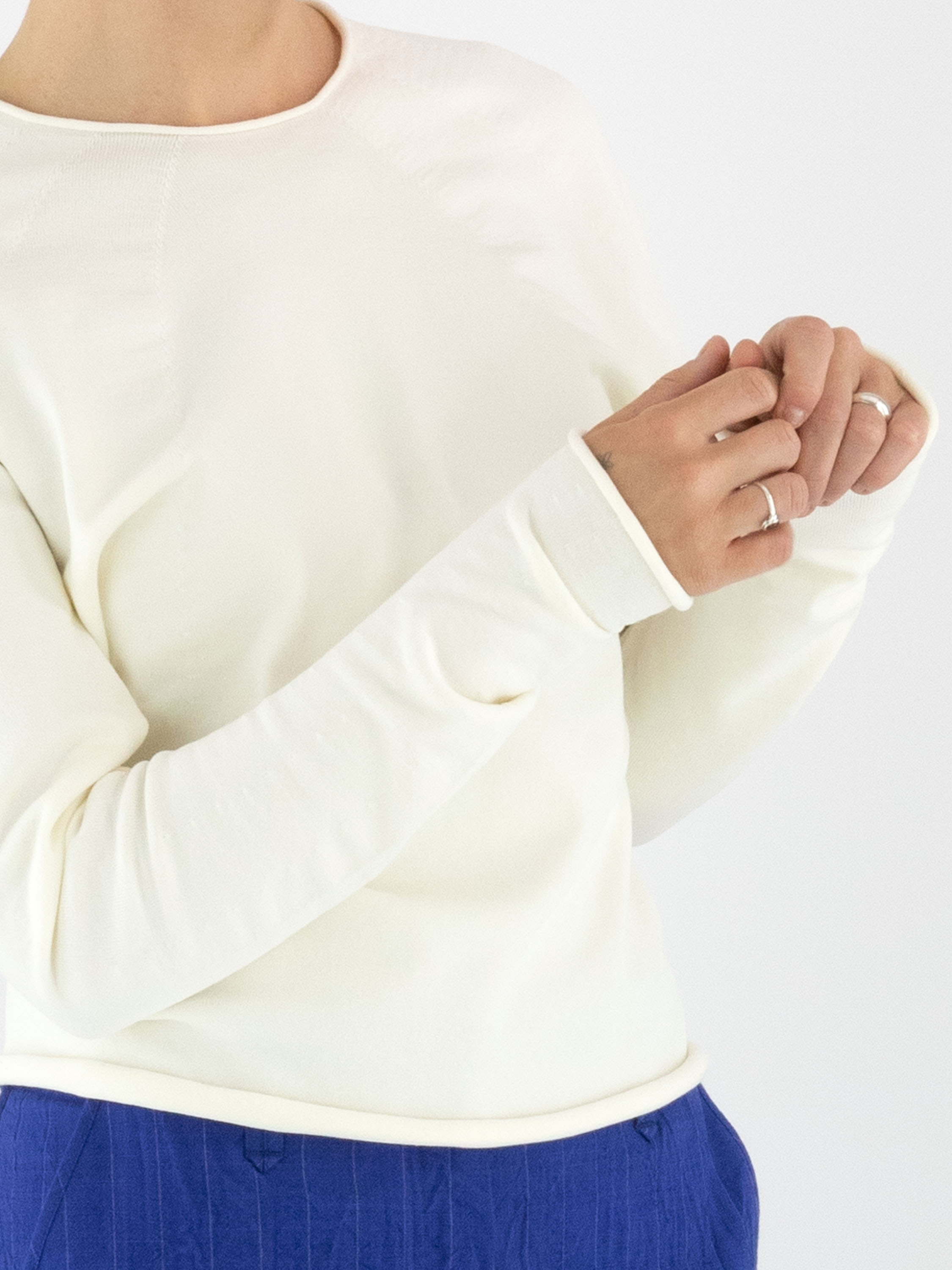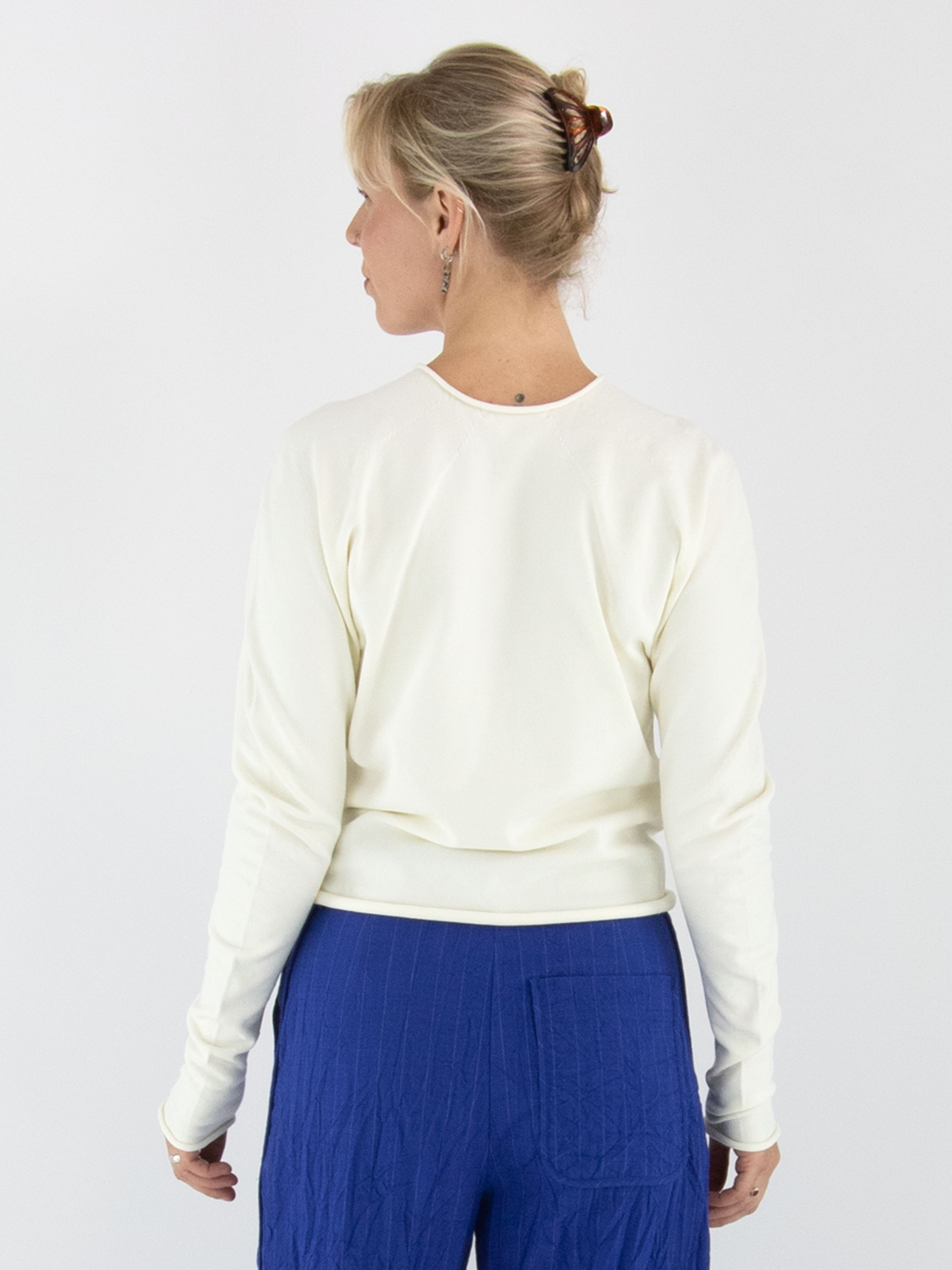 Annette Görtz Pullover aus festem Stoff in Cremeweiß. Die Abschlüsse am Rundhalsausschnitt, an den langen Ärmeln und am Saum sind gerüscht. Vom Halsausschnitt aus verlaufen mehrere dekorative Nähte, die einen feinen Smokeffekt erzeugen. Dieser Pullover sollte von Hand gewaschen werden.
