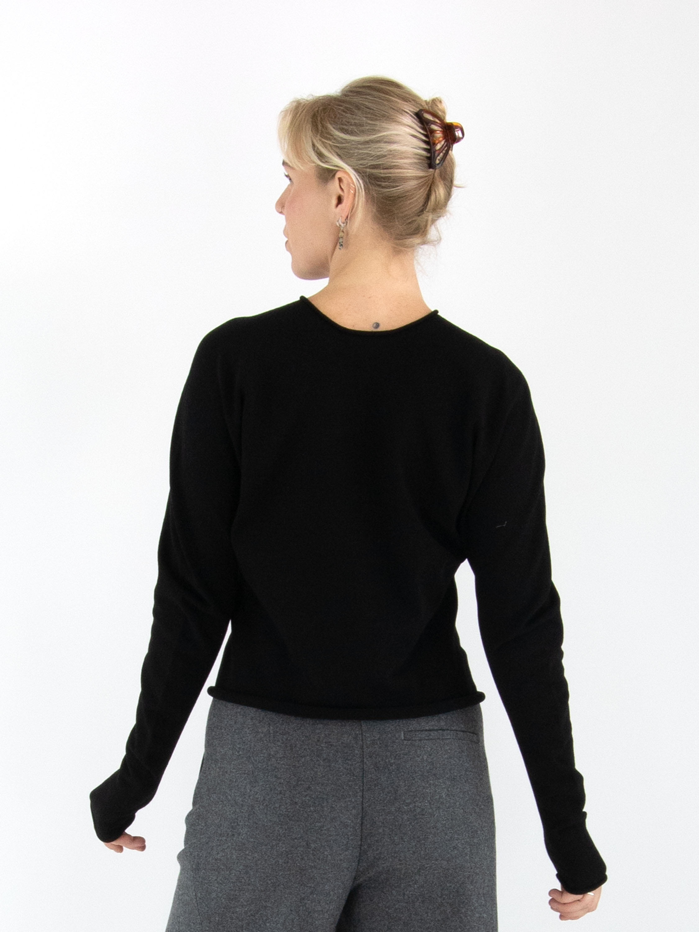 Pullover von Annette Görtz aus festem schwarzen Stoff. Die Ränder des Rundhalsausschnitts, der langen Ärmel und des Saums sind gerafft. Vom Halsausschnitt verlaufen mehrere dekorative Nähte, die einen dezenten Smokeffekt erzeugen. Dieser Pullover sollte von Hand gewaschen werden.