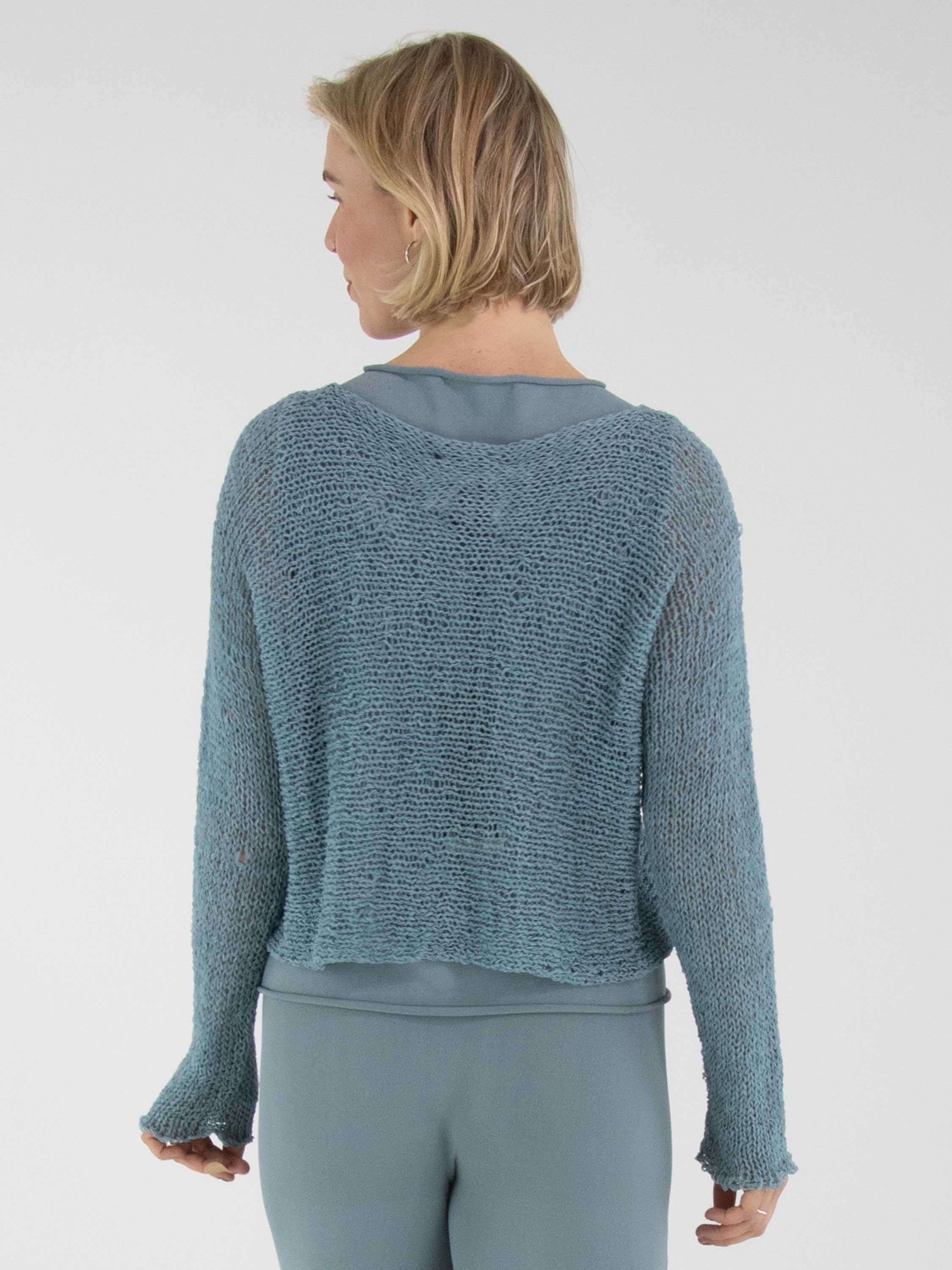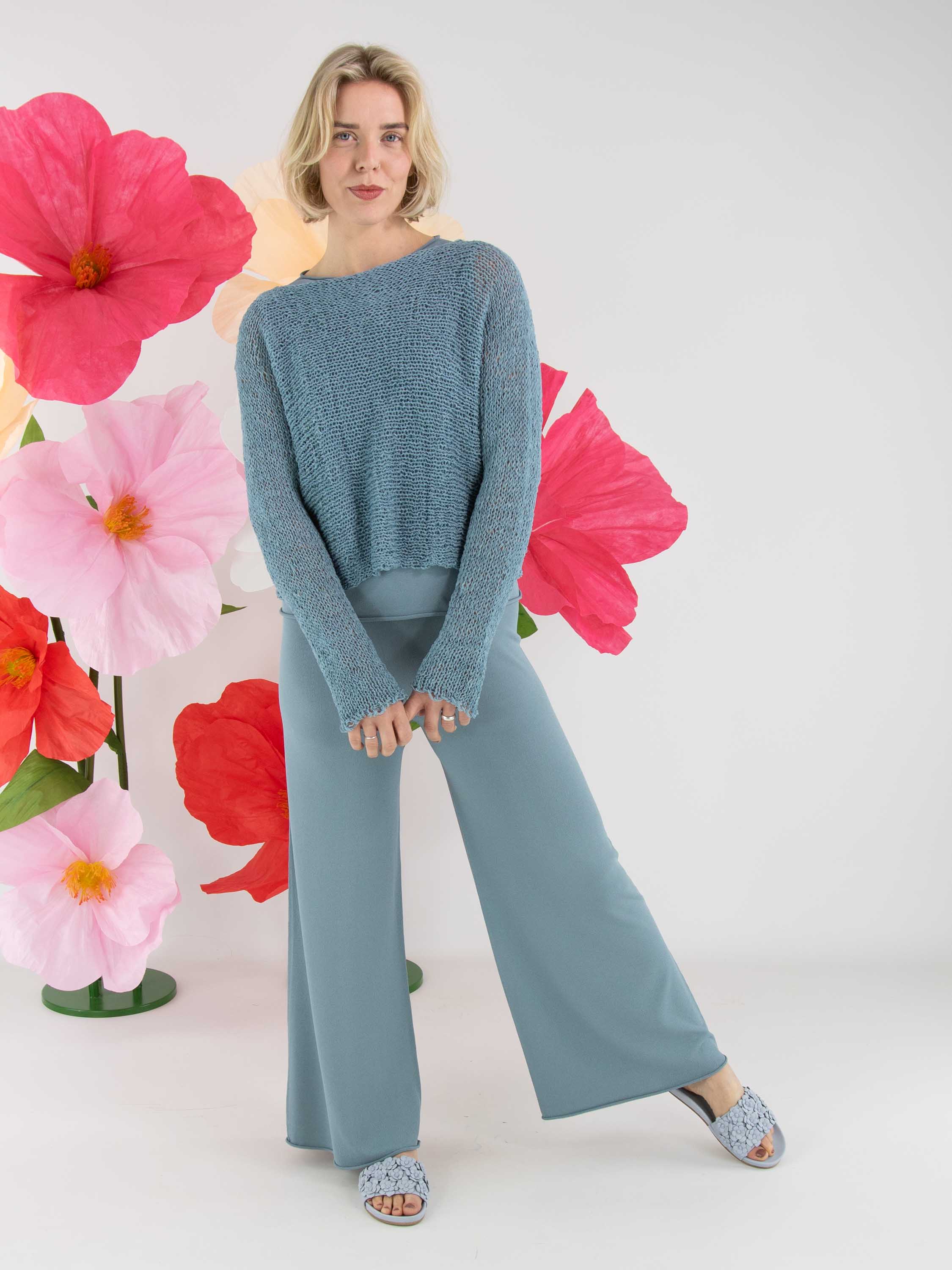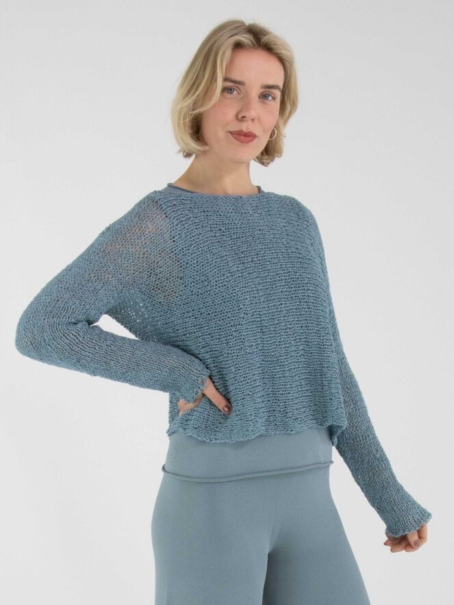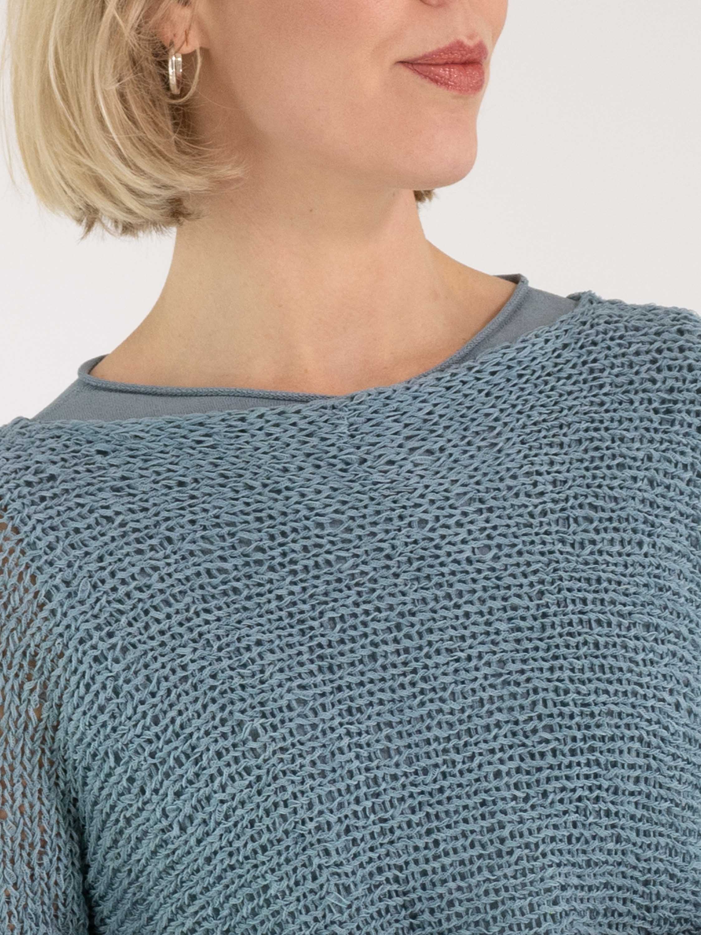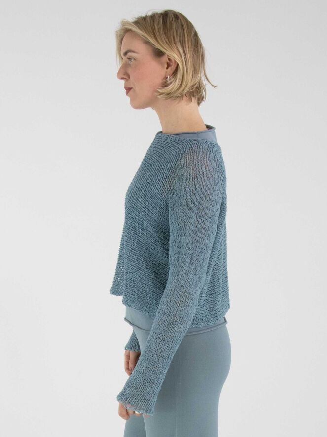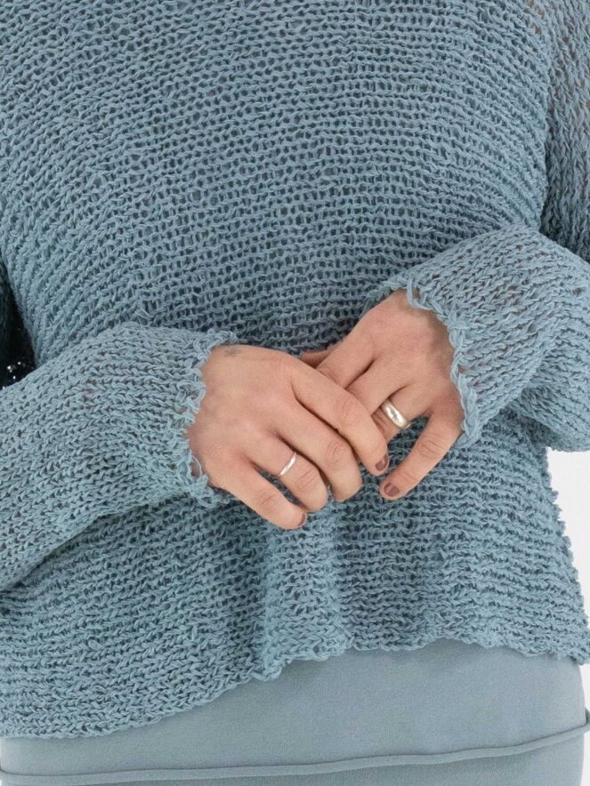 Ein Pullover von Annette Görtz, offen gestrickt aus Bändchengarn in Blau. Der Pullover hat einen Rundhalsausschnitt und lange Ärmel und kann von Hand gewaschen werden.