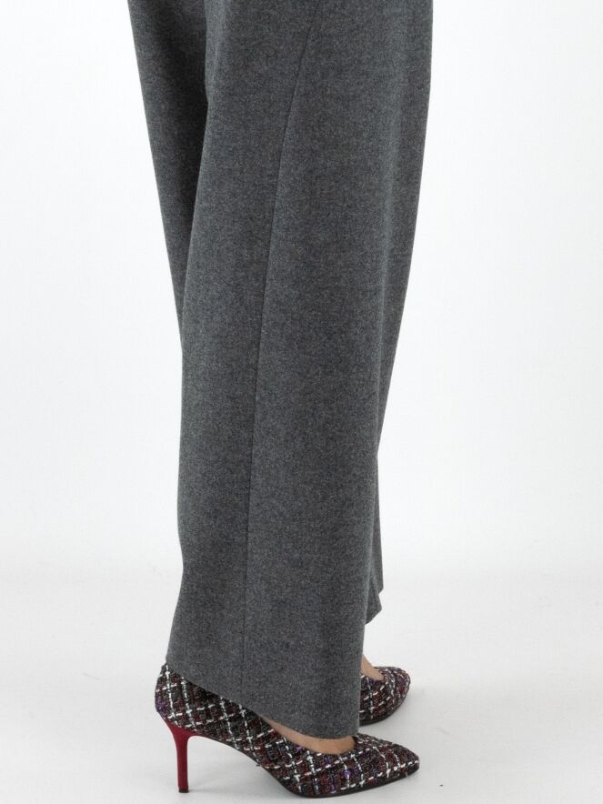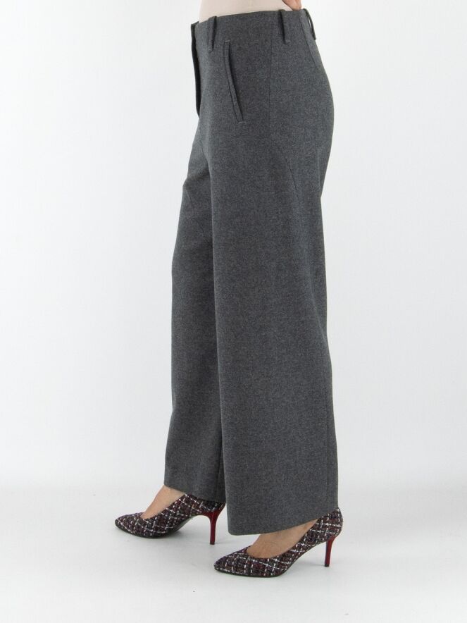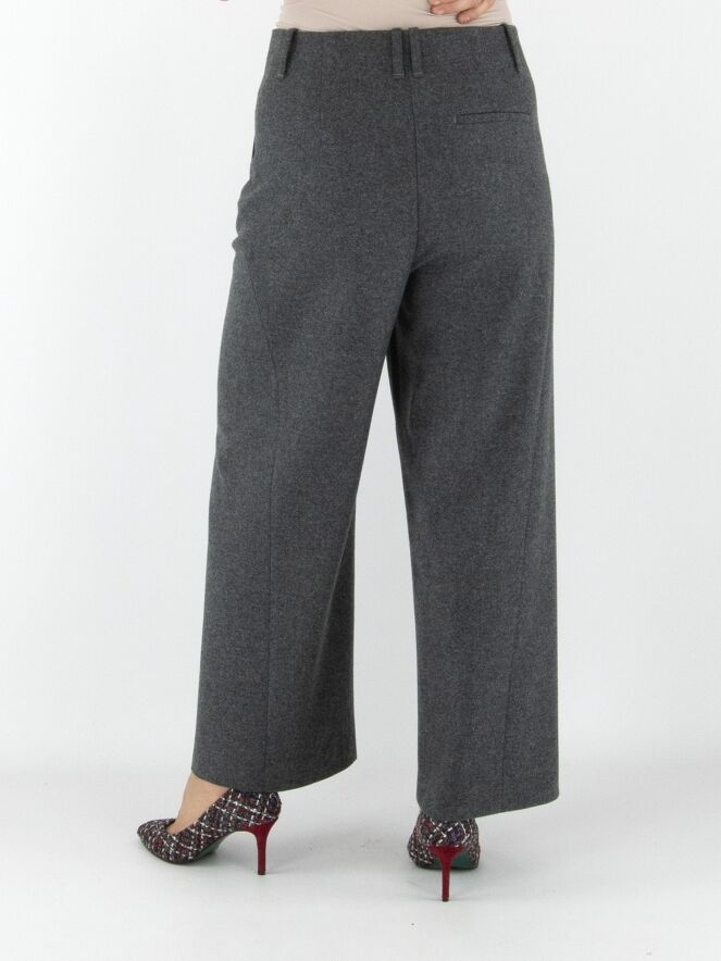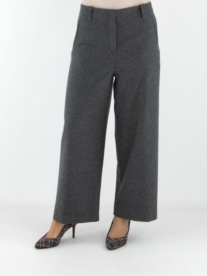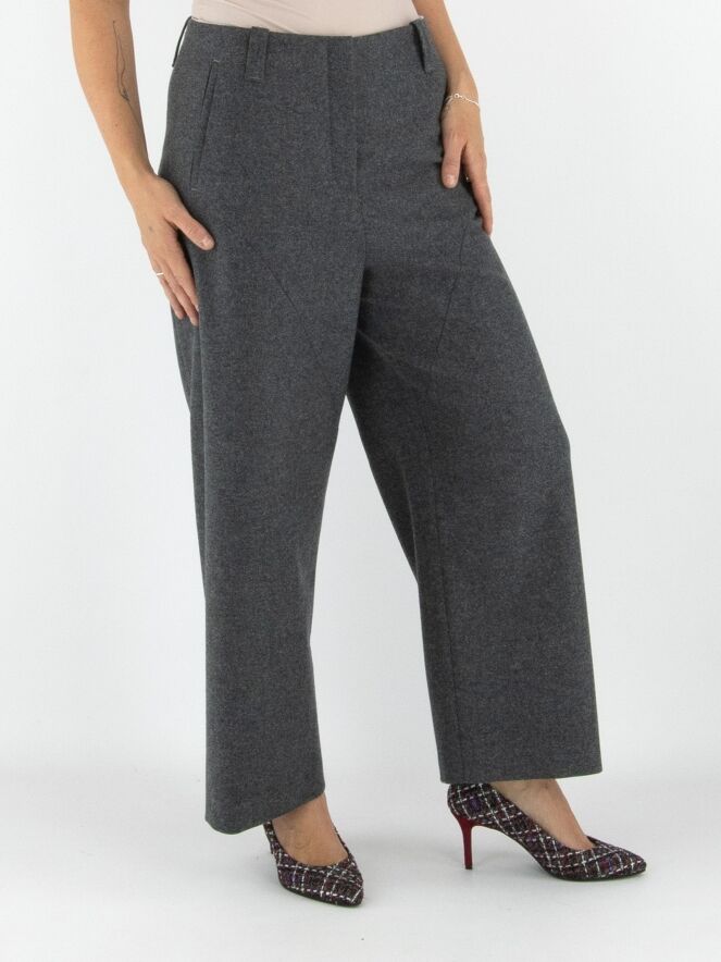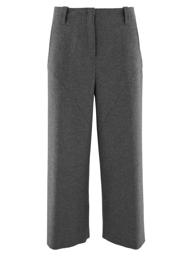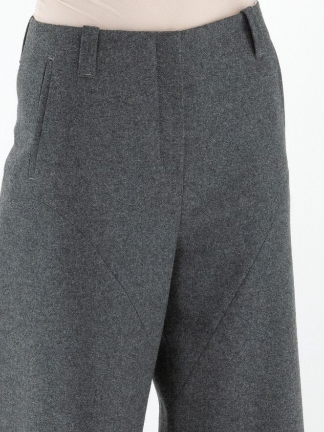Hose von Annette Görtz in Grau. Mit seitlichen Eingrifftaschen und einer Naht, die in einer Parabellinie vom Taschenansatz bis zu den Knien verläuft. Die Hosenbeine sind gerade geschnitten. Diese Hose darf nur von Hand gewaschen werden.