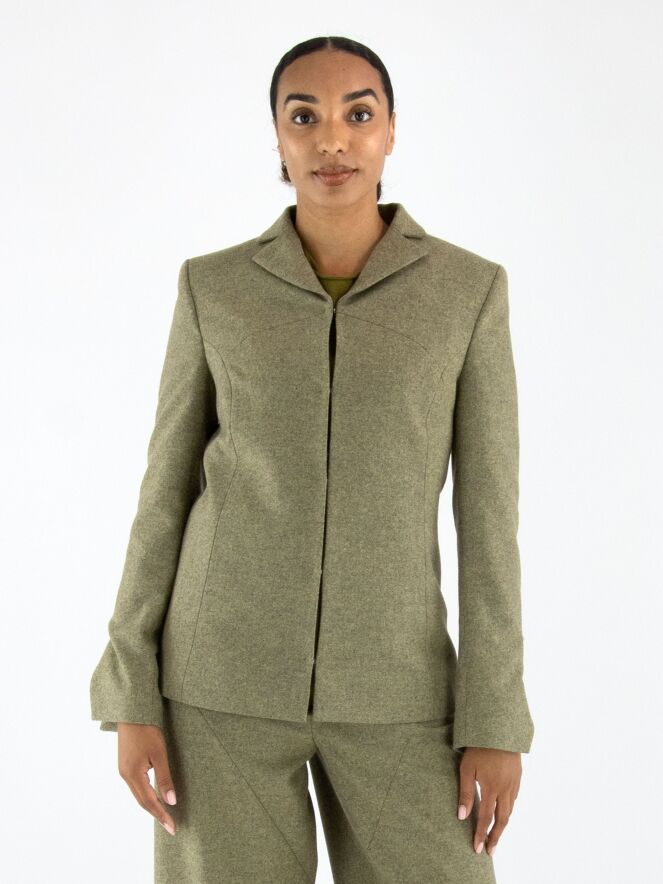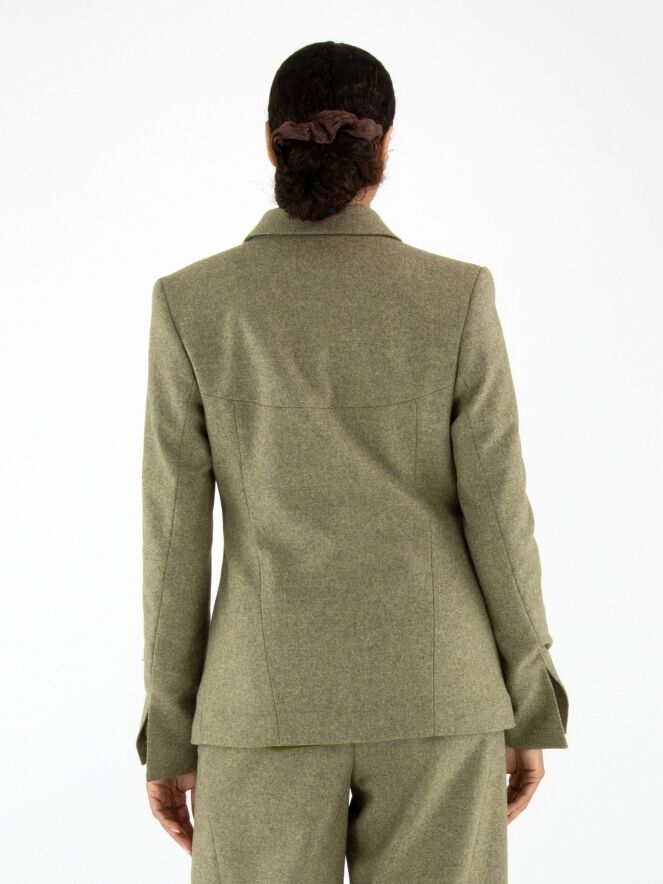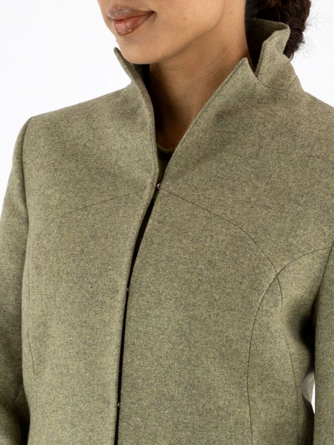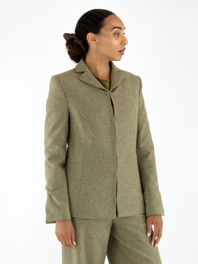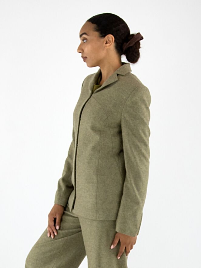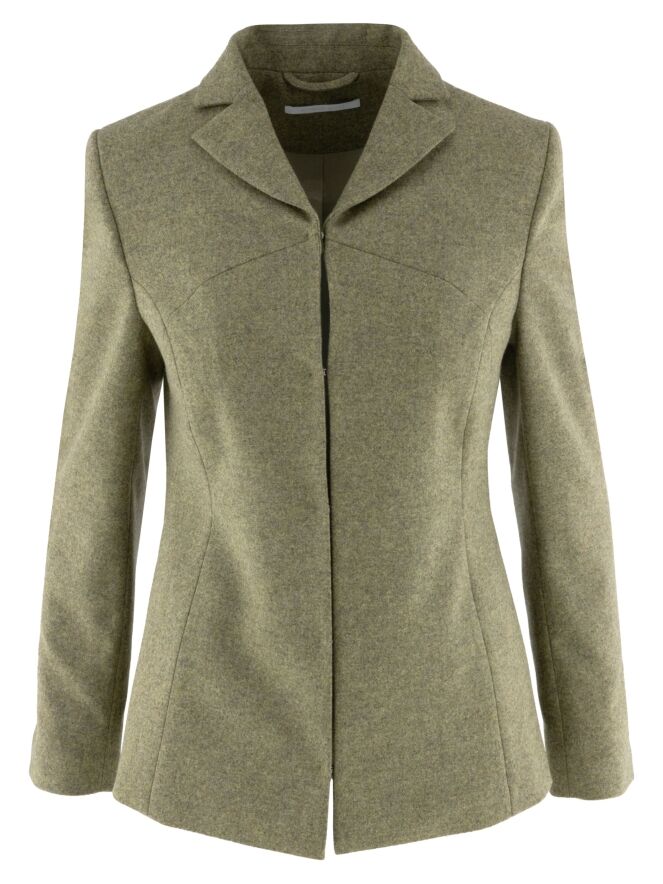 Blazer von Annette Görtz in melierter Olivgrün-Nuance. Der Verschluss besteht aus fünf feinen Haken-und-Ösen. Am Ende der langen Ärmel befindet sich ein Schlitz. Der Blazer ist vollständig gefüttert und darf nicht gewaschen werden.