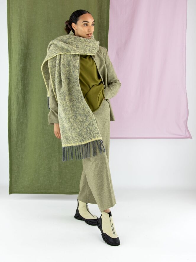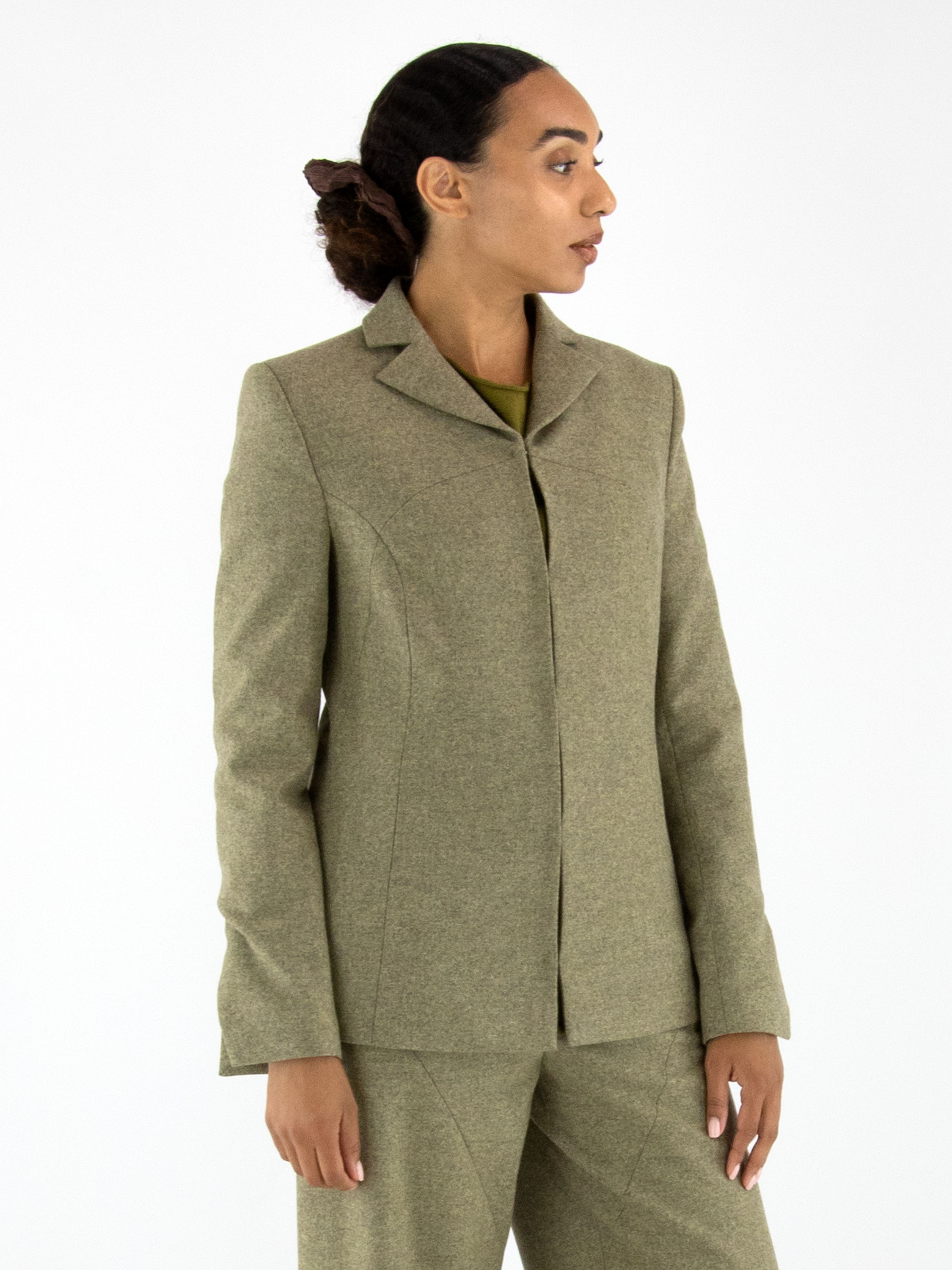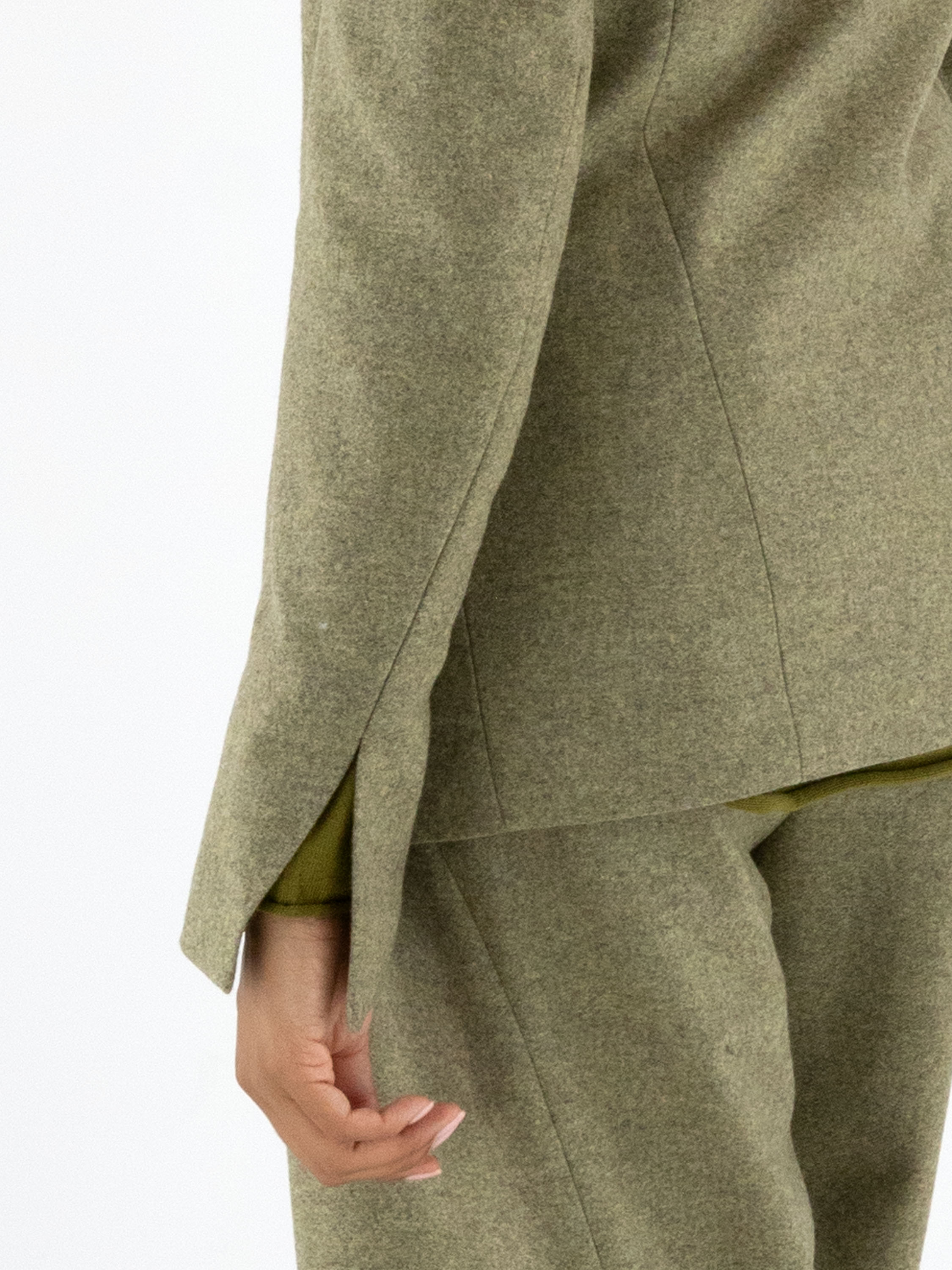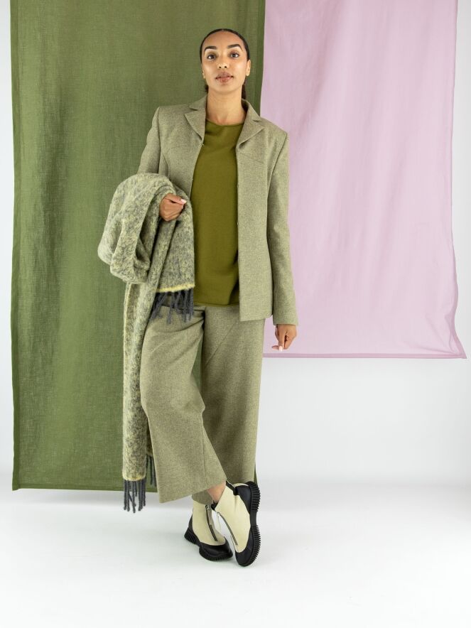 Blazer von Annette Görtz in melierter Olivgrün-Nuance. Der Verschluss besteht aus fünf feinen Haken-und-Ösen. Am Ende der langen Ärmel befindet sich ein Schlitz. Der Blazer ist vollständig gefüttert und darf nicht gewaschen werden.