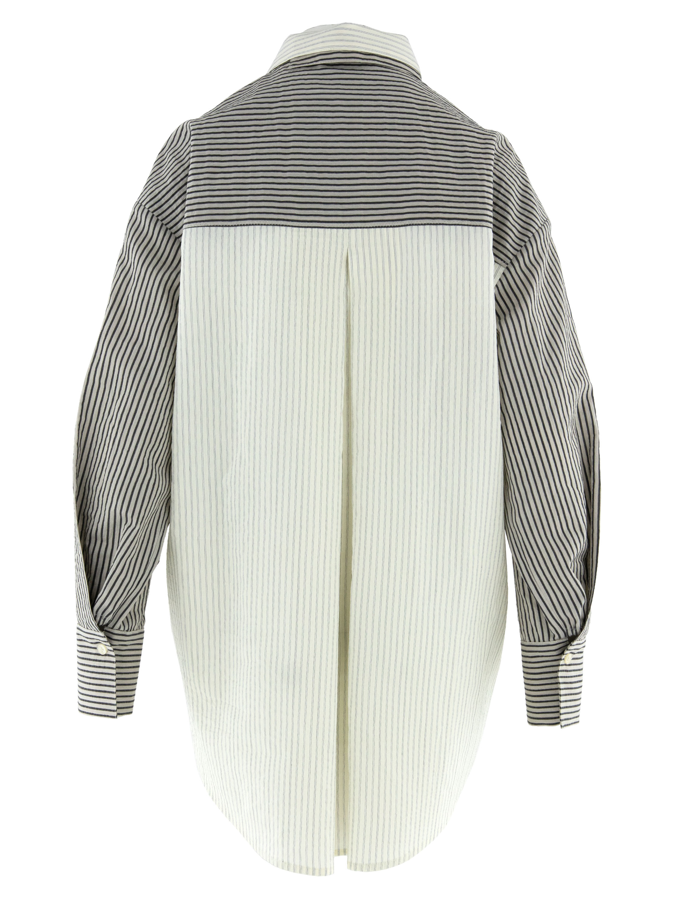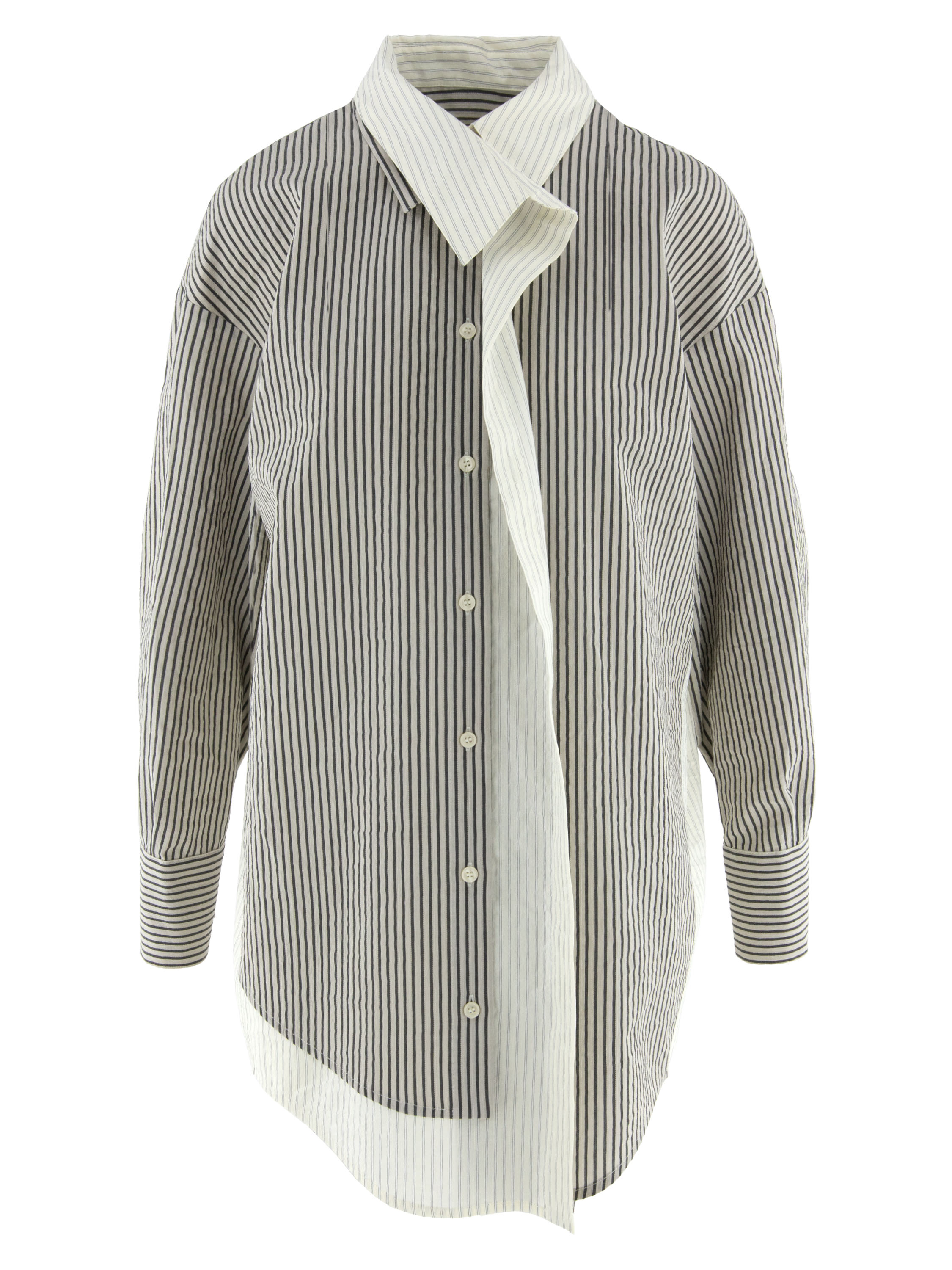 Eine Bluse von Annette Görtz mit einem Streifenmuster in Anthrazit und Grau. Auf der Rückseite ist der breite Umschlag entlang der Knopfleiste, der bis in den Kragen übergeht, aus einem Stoff mit Streifenmuster in Cremeweiß und Grau gearbeitet. Diese Bluse kann von Hand gewaschen werden.