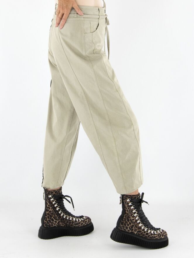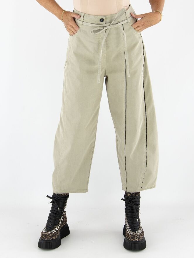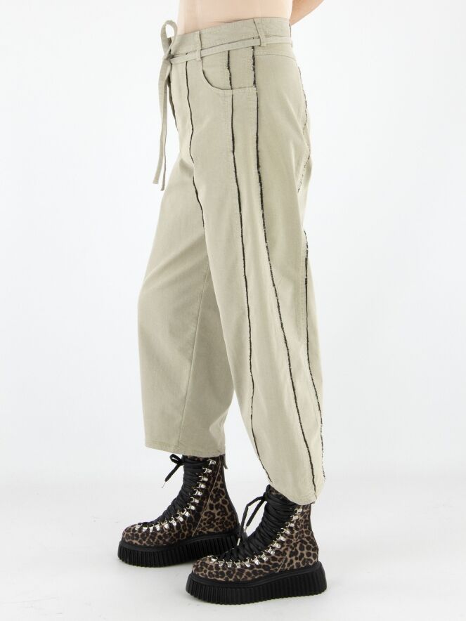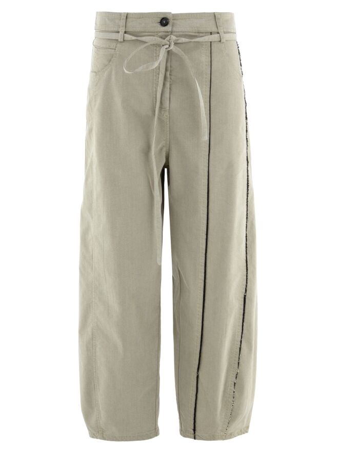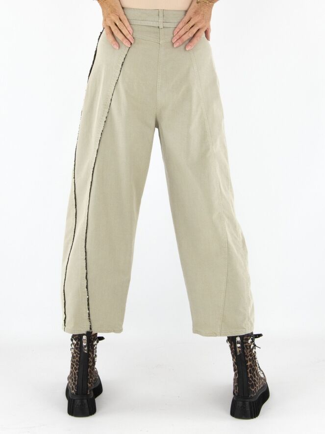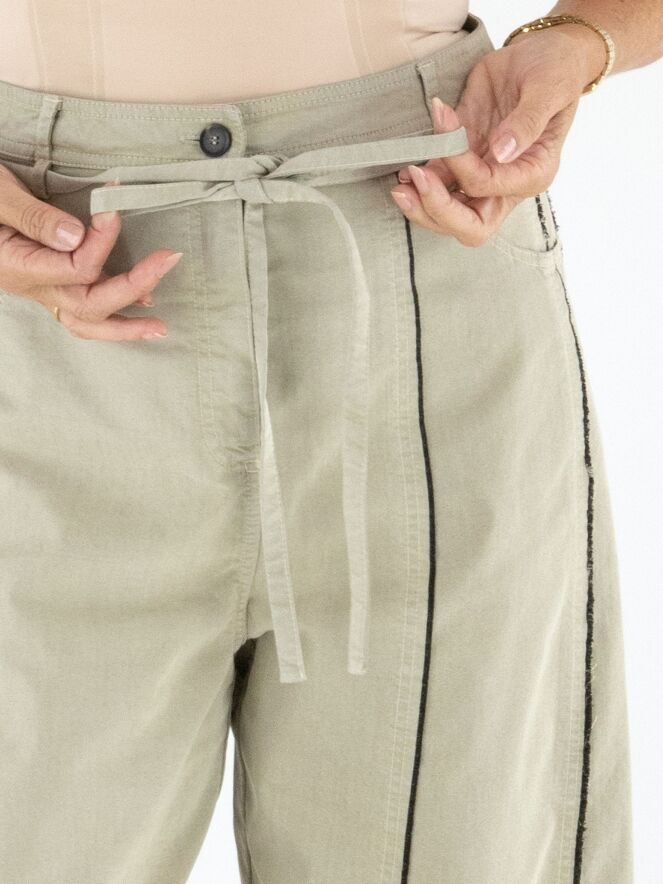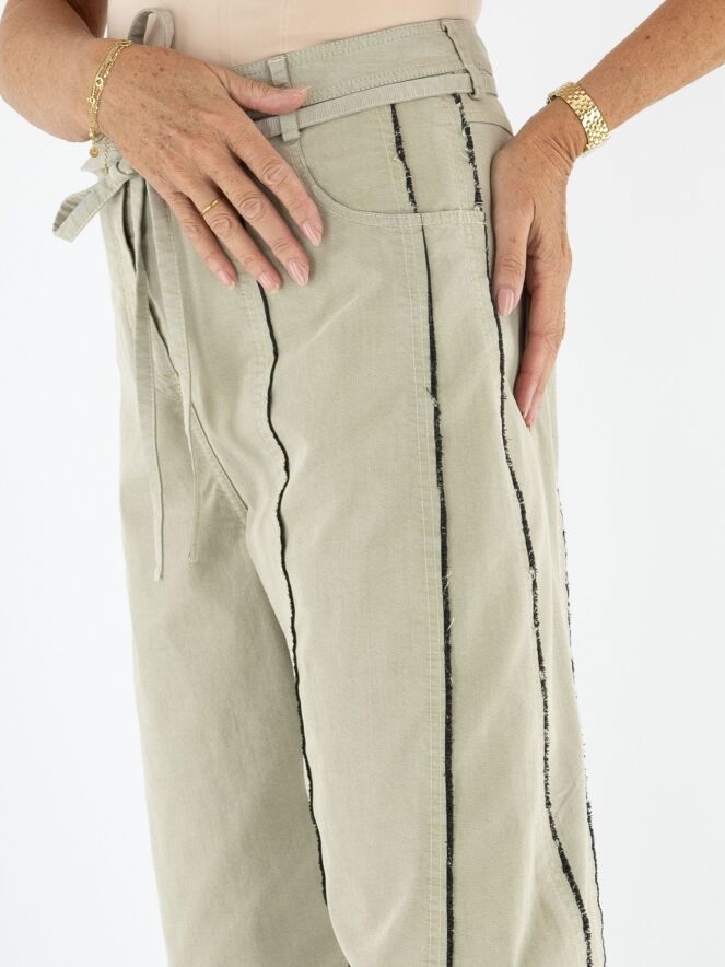 Hose von Annette Görtz in einem edlen Hellgrau. Dieses moderne 5-Pocket-Modell ist mit einem Stoffgürtel aus dem gleichen Material gearbeitet und verleiht so ein elegantes, harmonisches Gesamtbild. An der linken Beinpartie setzen mehrere umgekehrte Nähte mit einer fein ausgefransten schwarzen Biese dezente, stilvolle Akzente. Diese exklusive Designerhose kann bei 30 Grad gewaschen werden.