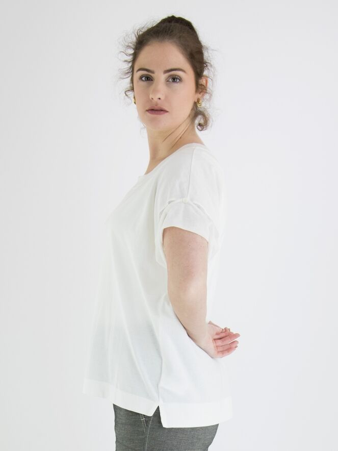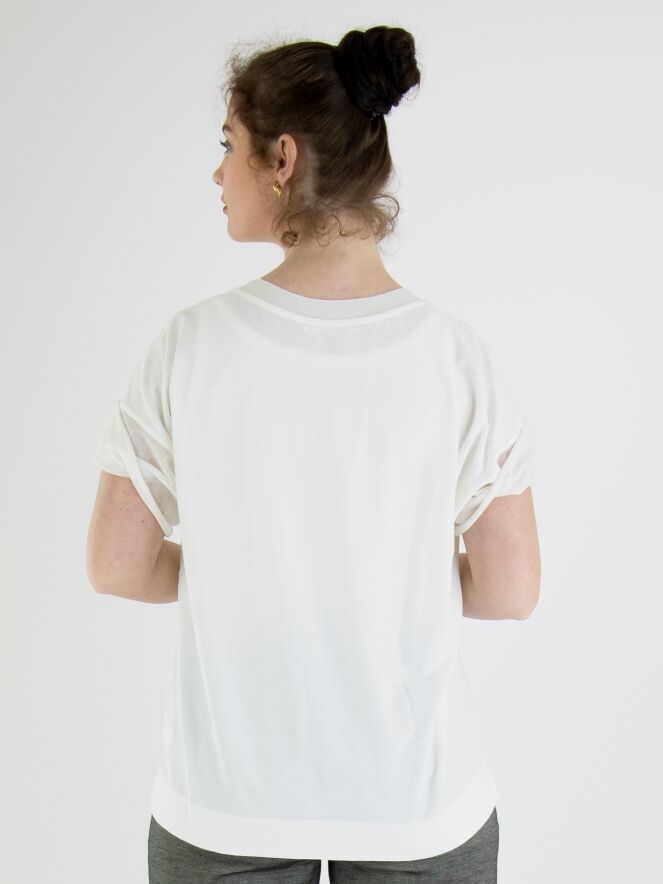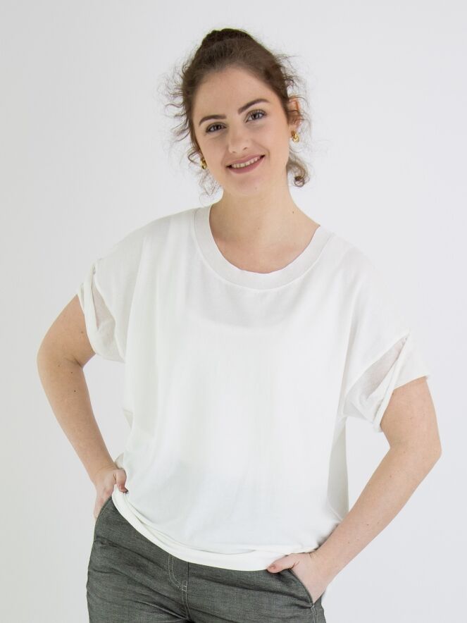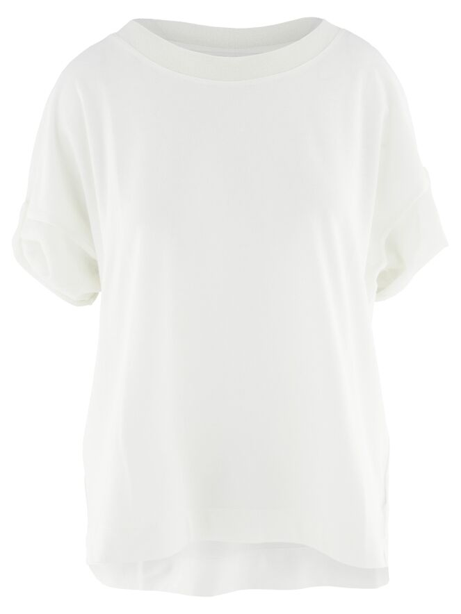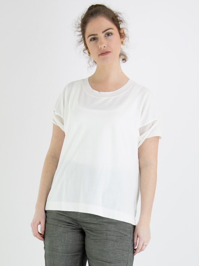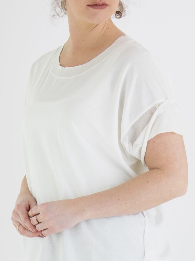 Ein Shirt von Annette Görtz in Cremeweiß. Entlang des Randes des runden Halsausschnitts befindet sich ein fein gerippter Strickbund. Die kurzen Ärmel sind aus einem Voile-Transparentstoff. Dieses Shirt kann bei 30 Grad gewaschen werden.
