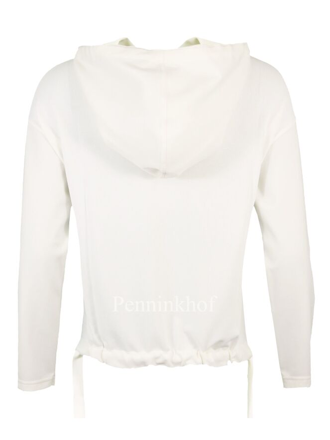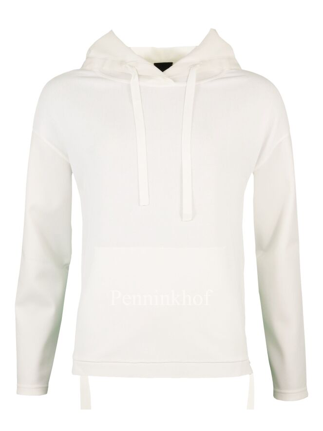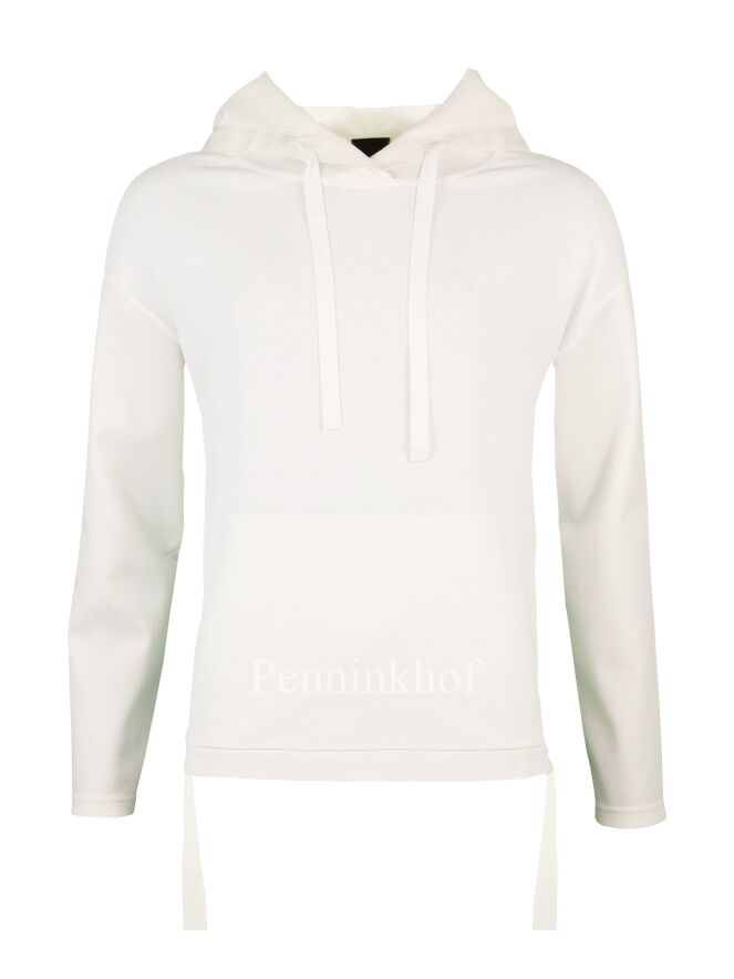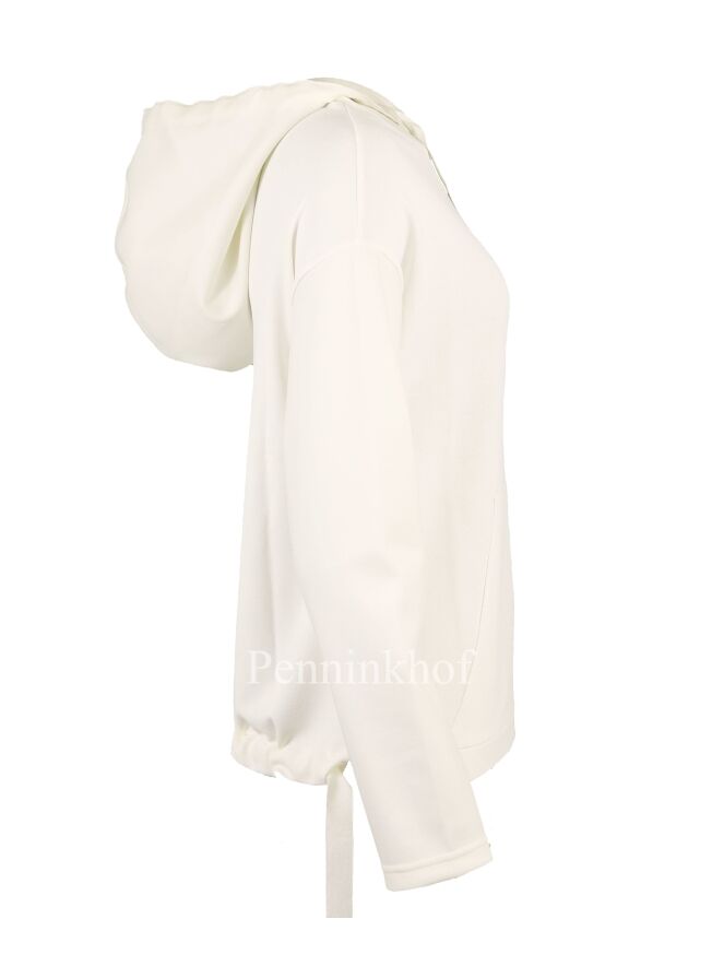 Ein Pullover der Designermode von Annette Görtz in Cremeweiß. Am Rand der Kapuze befindet sich ein breiter Besatz aus einem matten Satingewebe aus dem vorne 2 Bänder herausragen. Auf der Vorderseite befindet sich eine Kängurutasche. Dieser Pullover darf von Hand gewaschen werden.