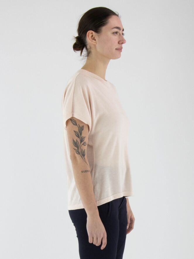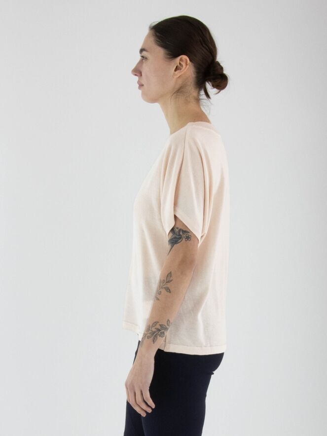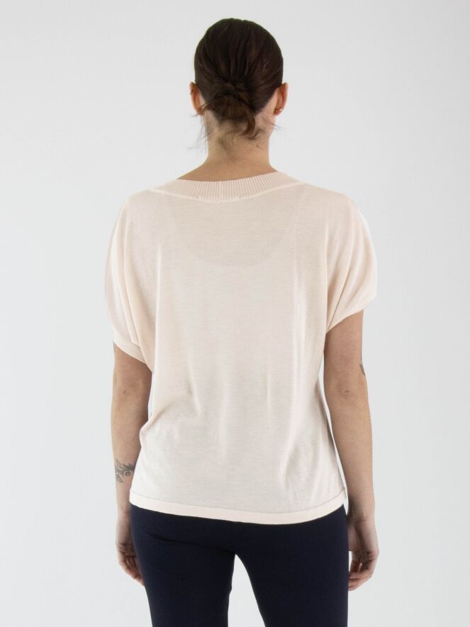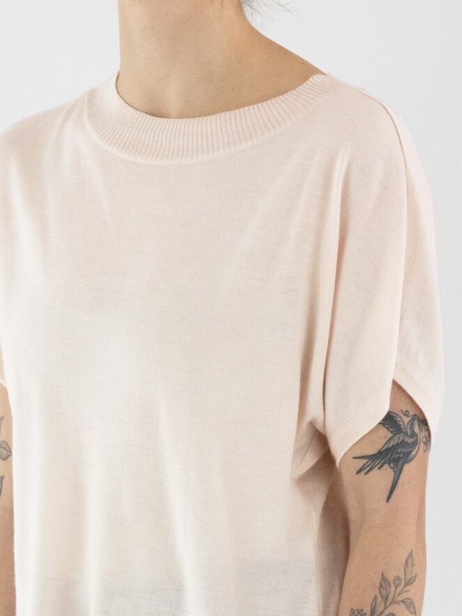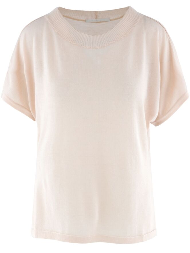 Ein leicht transparenter, luxuriöser Pullover von Annette Görtz in Pastellrosa. Der runde Ausschnitt ist mit einer gerippten Strickborte versehen. Der Pullover hat kurze Ärmel und sollte von Hand gewaschen werden.