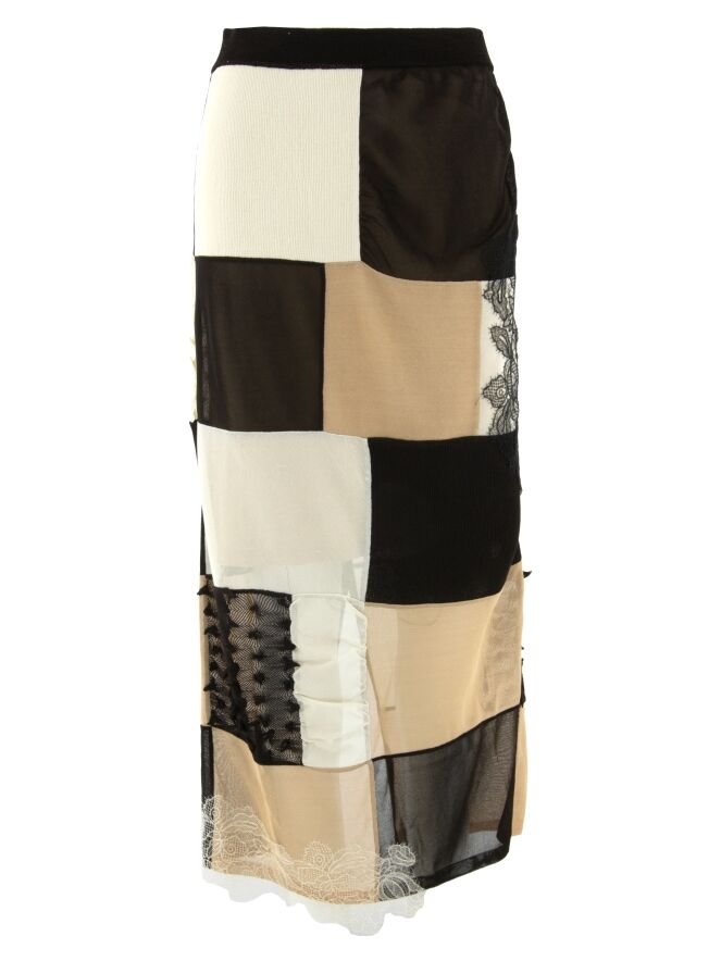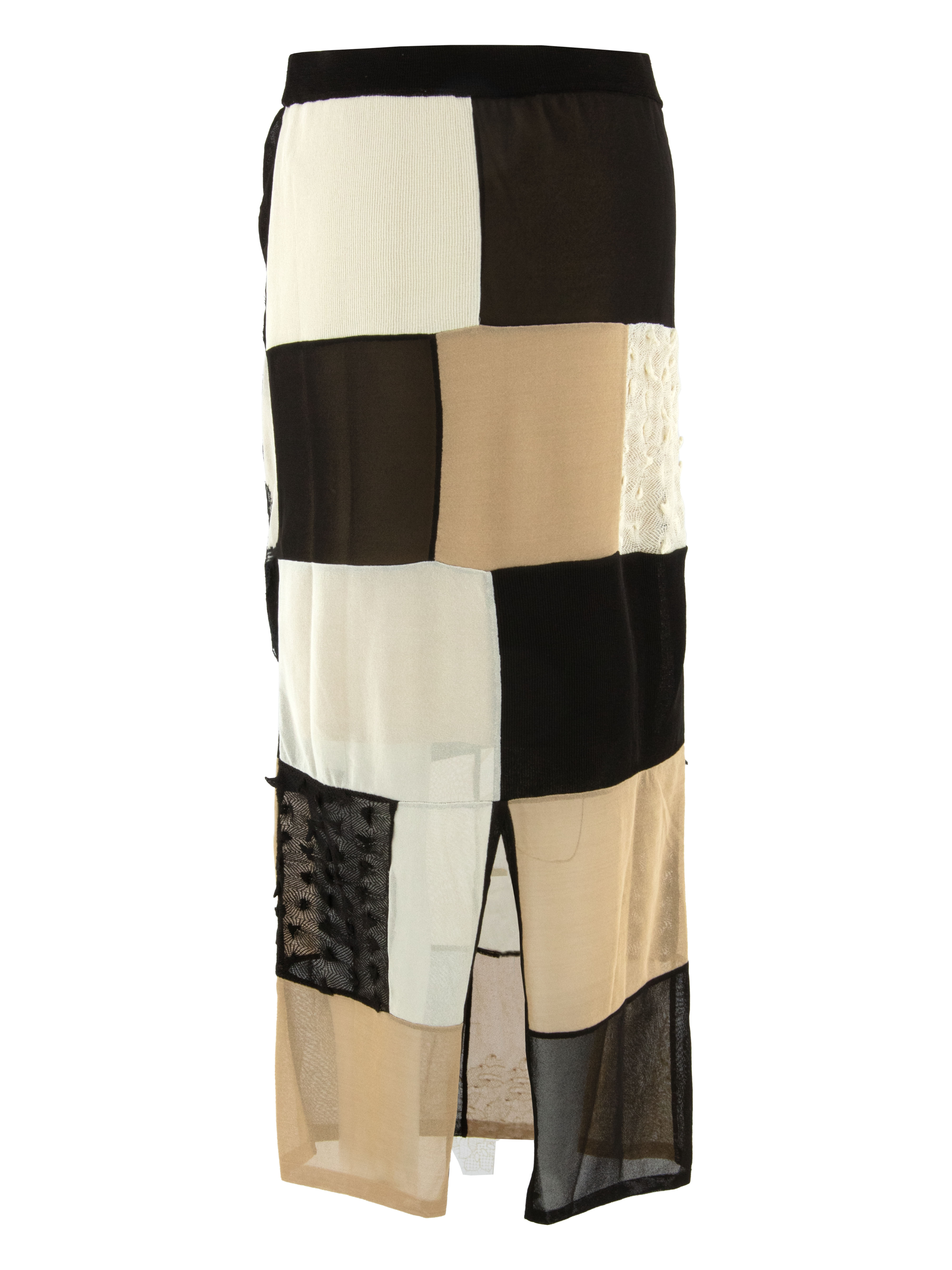 Ein Design-Rock von Annette Görtz in drei Farbflächen: Schwarz, Camel und Beige. Die verschiedenen Materialien vereinen mehrere Strukturen, darunter eine fein gerippte Oberfläche, eine Spitzenstruktur mit gesmokten Details sowie eine glatte, leicht transparente Qualität. Der Bund ist elastisch gearbeitet. Auf der Rückseite befindet sich mittig ein Schlitz, der bis unter das Knie reicht. Der Rock ist gefüttert und sollte per Hand gewaschen werden.