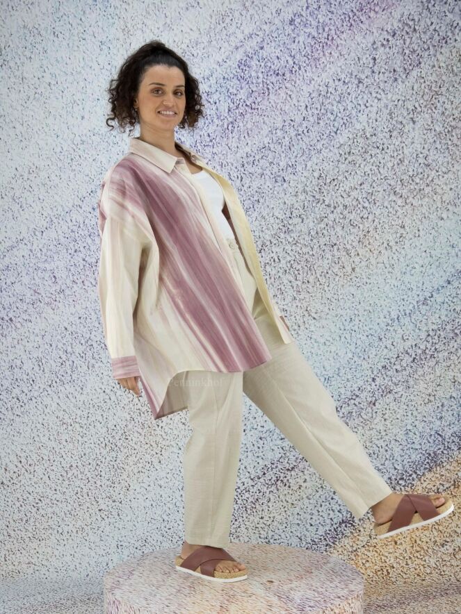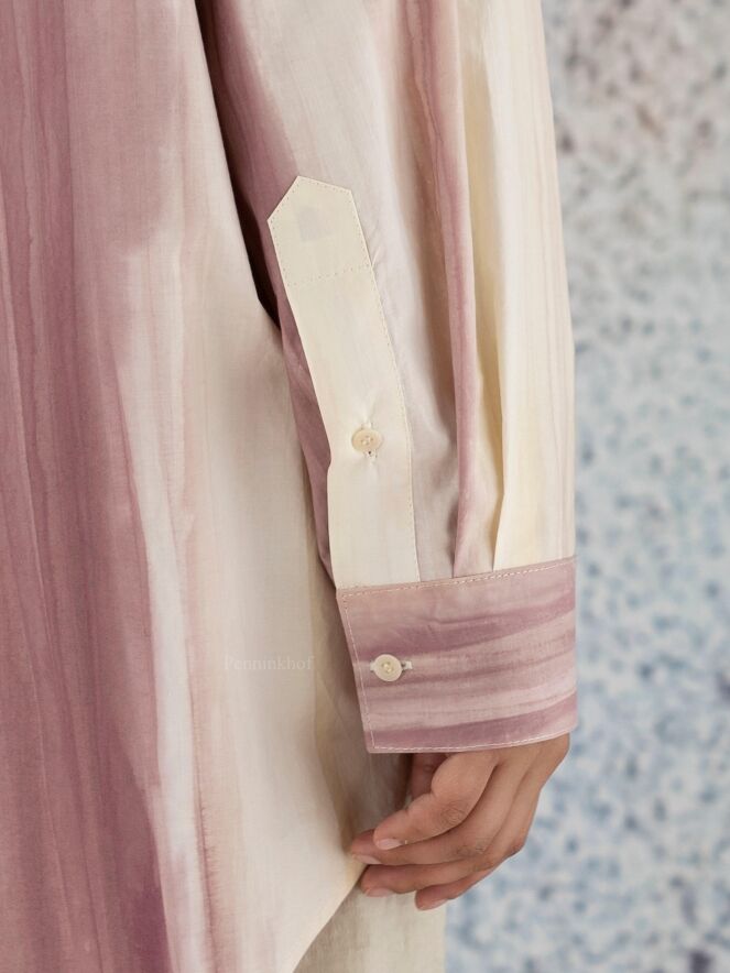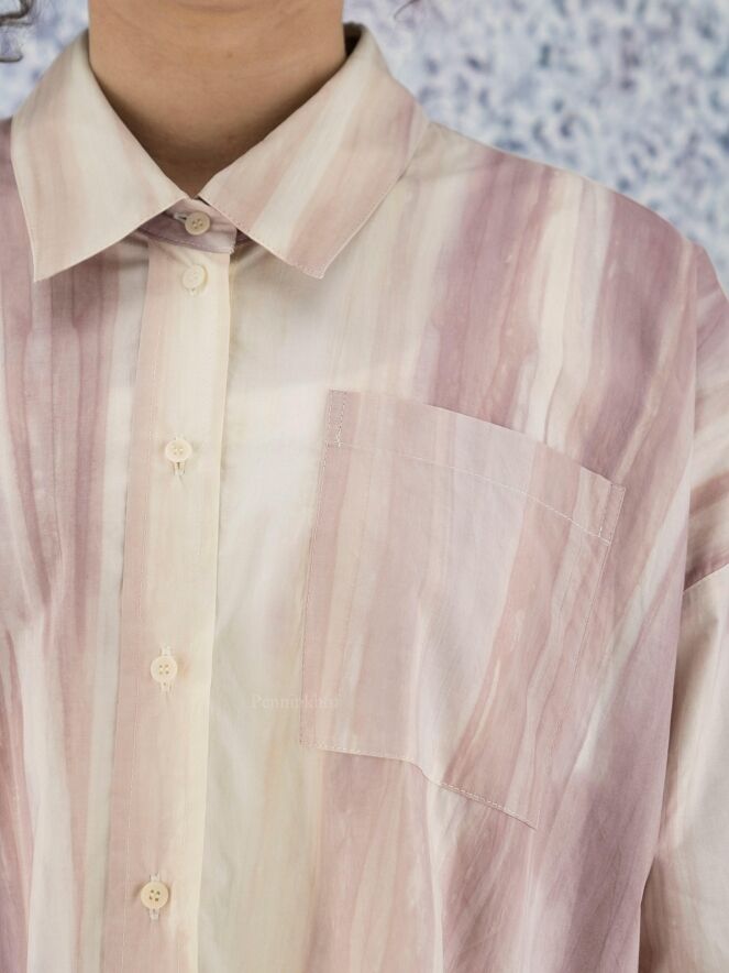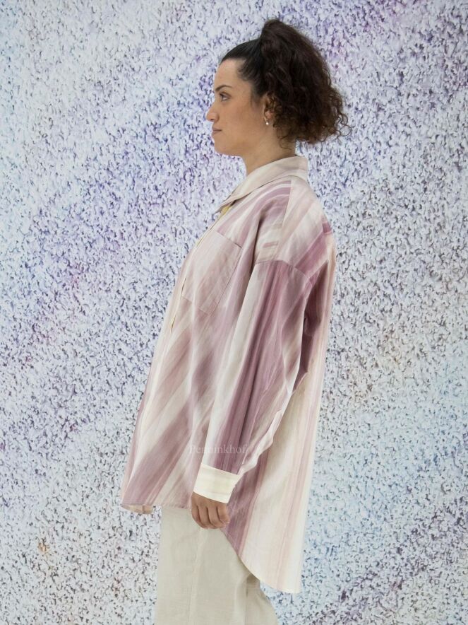 Eine Bluse der Designermode von Annette Görtz mit durchgehenden Streifenprint in verschiedenen Tönen Kirschrot und Cremeweiß. Diese Bluse kann bei 30 Grad gewaschen werden.