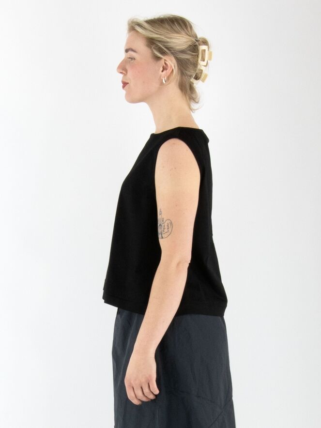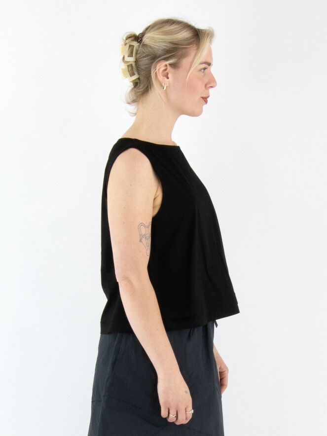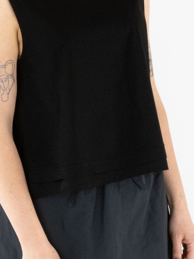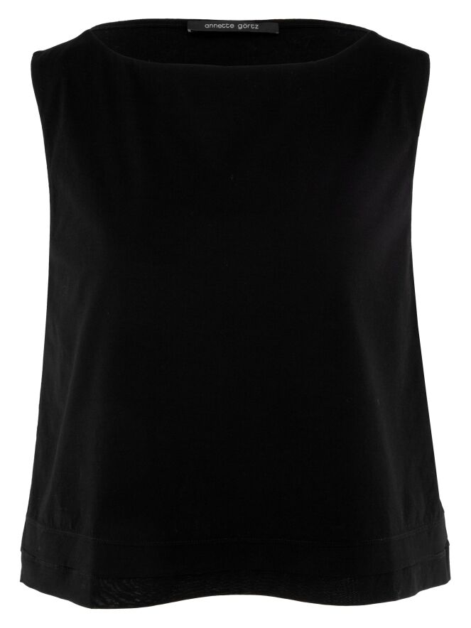 Ein Top von Annette Görtz in Schwarz. Das Top hat einen breiten Rundhalsausschnitt und eine doppelte Stofflage auf der Vorderseite. Dieses Top kann bei 30 Grad gewaschen werden.