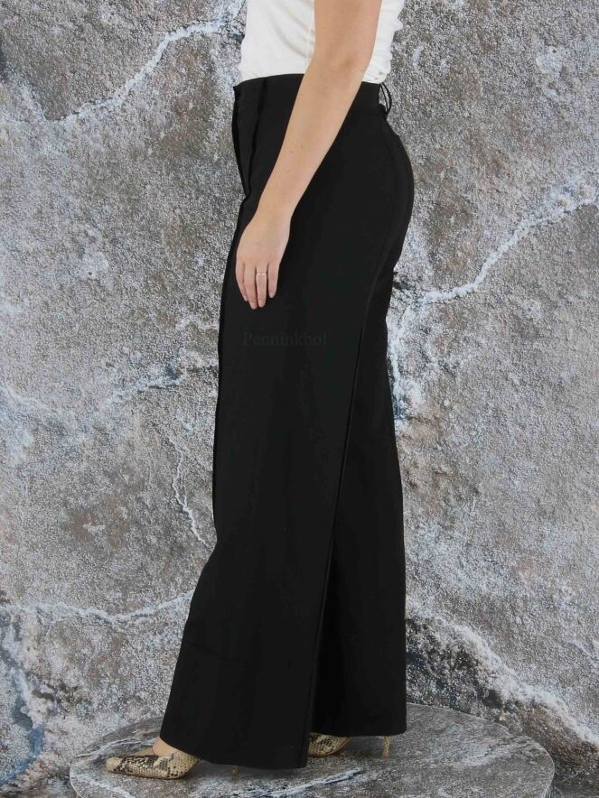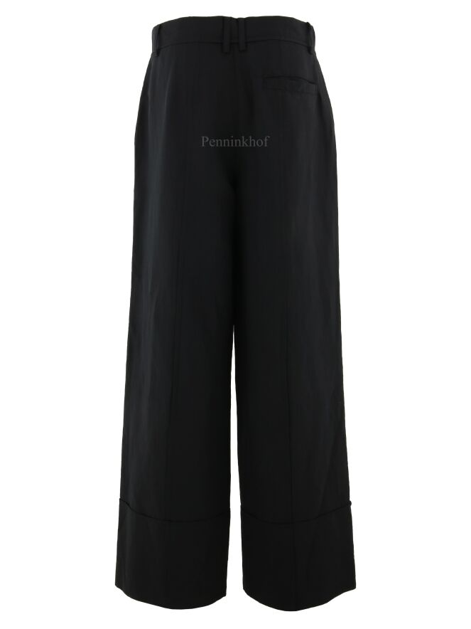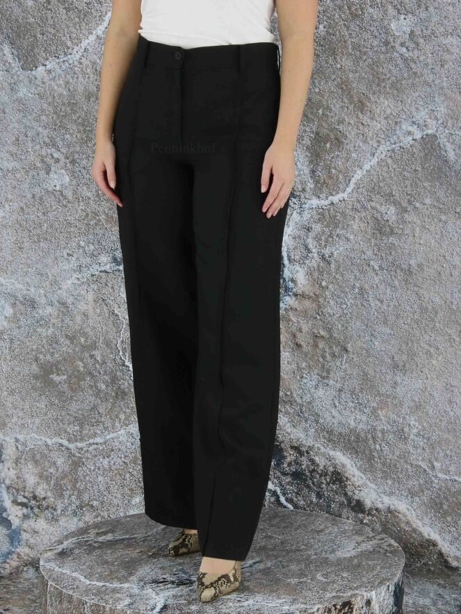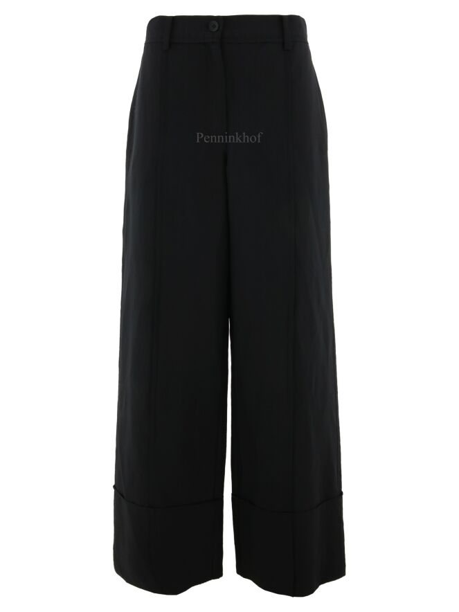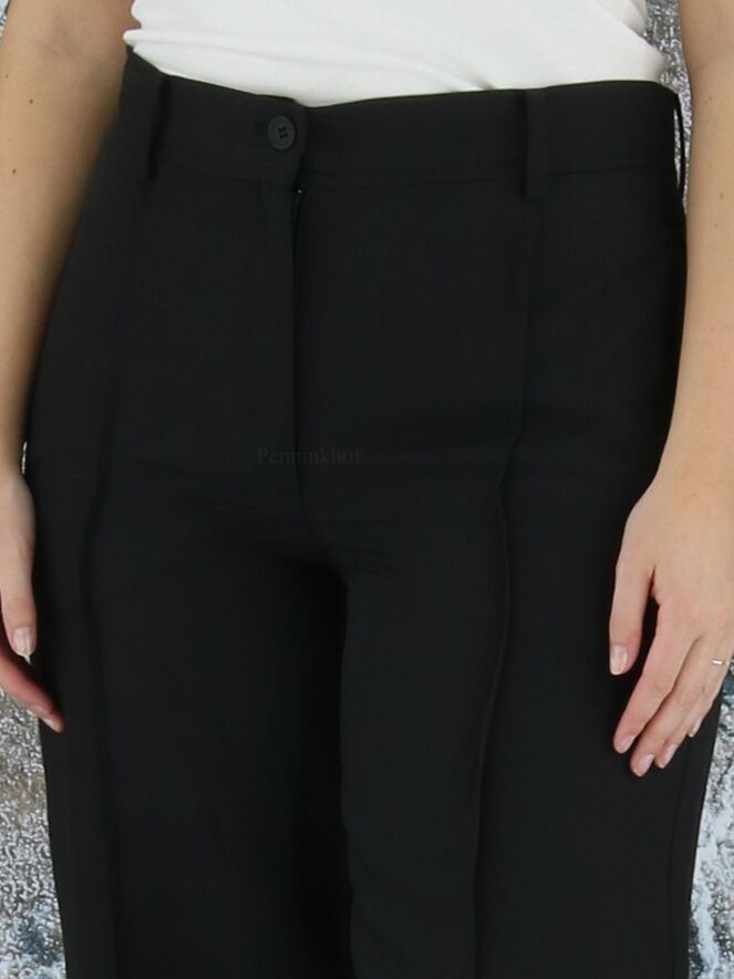 Eine legere Stoffhose der Designermode von Annette Görtz in Schwarz. Der Saum der Hosenbeine ist horizontal abgesteppt, was einen optischen Umschlagsaum ergibt. Über die Mitte der Hosenbeine verläuft eine Steppnaht an der Vorder- und Hinterseite. Diese Hose kann bei 30 Grad gewaschen werden.