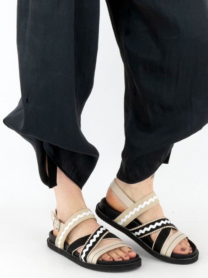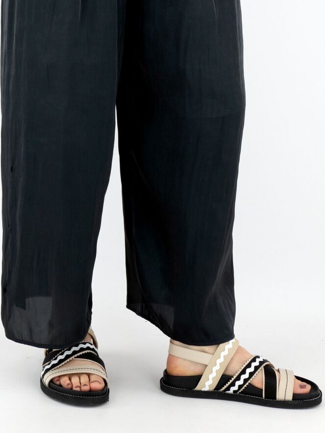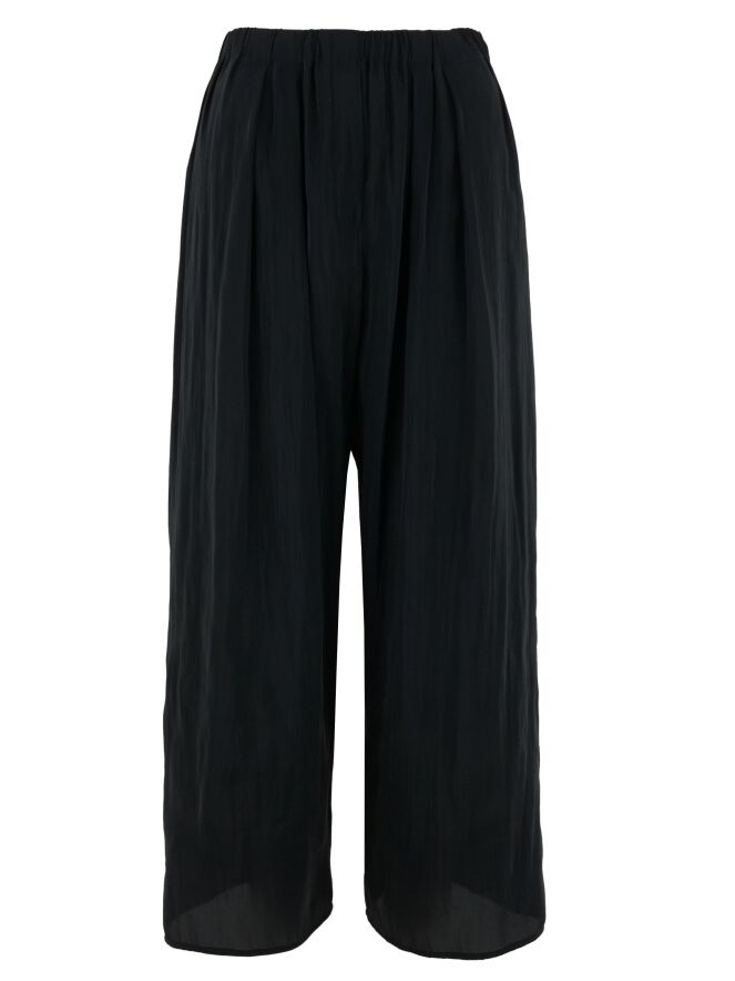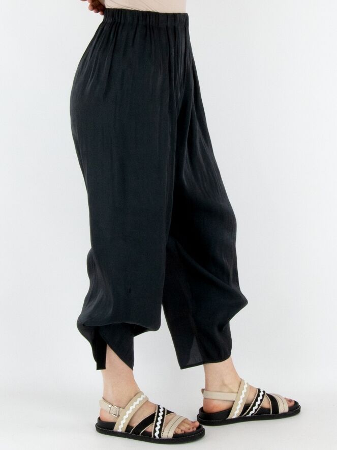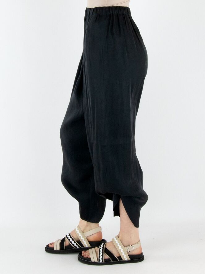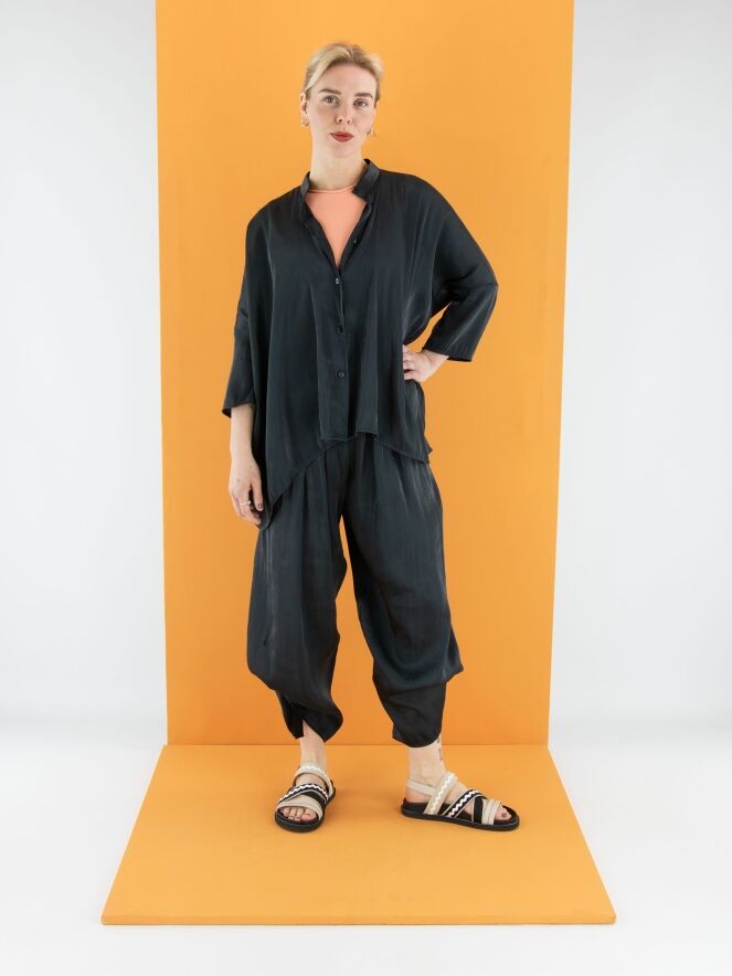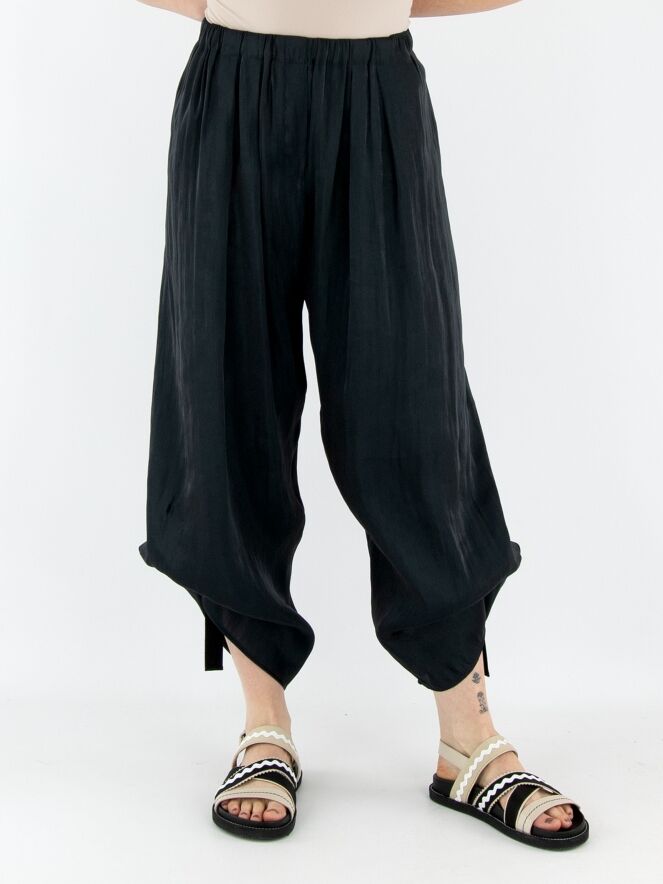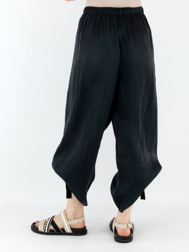 Eine Hose von Annette Görtz aus mattem Satin mit einem melierten Print in Anthrazit. Der Bund hat ein fein plissiertes elastisches Band. An der Innenseite der Hose befindet sich ein Band mit Knöpfen, mit dem verschiedene Falteneffekte und Längenvariationen erzeugt werden können. Diese Hose kann bei 30 Grad gewaschen werden.