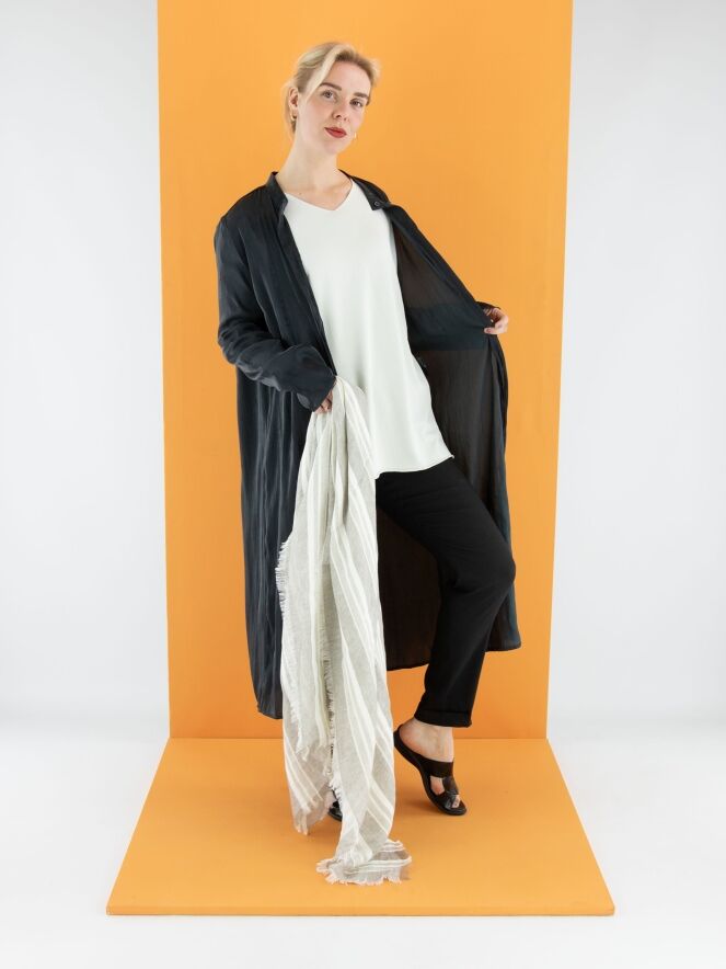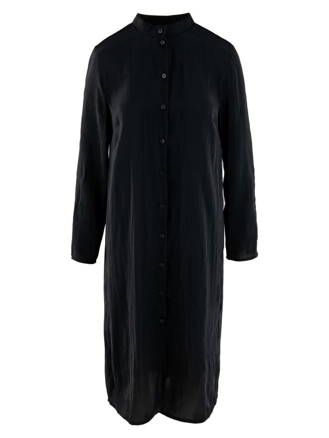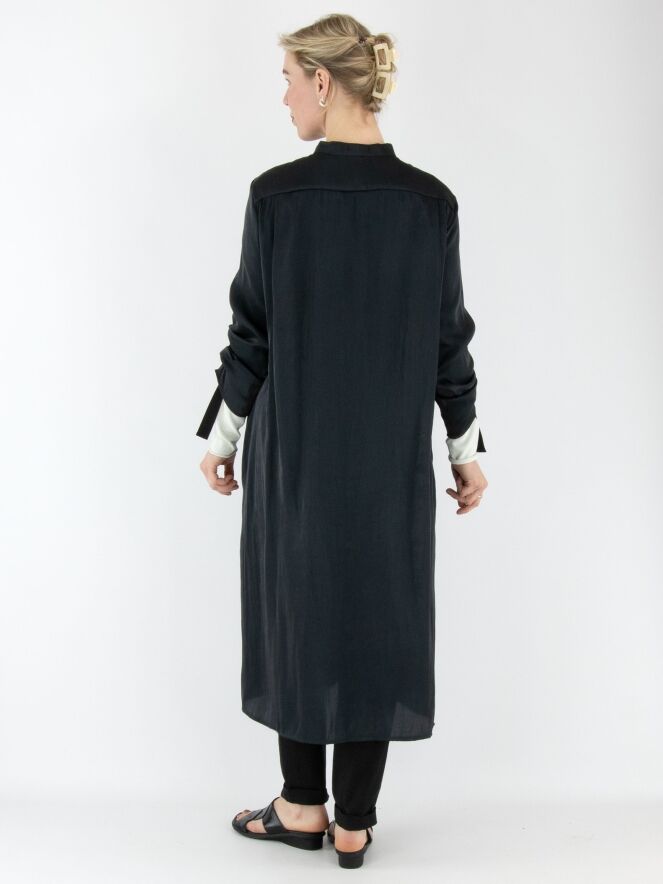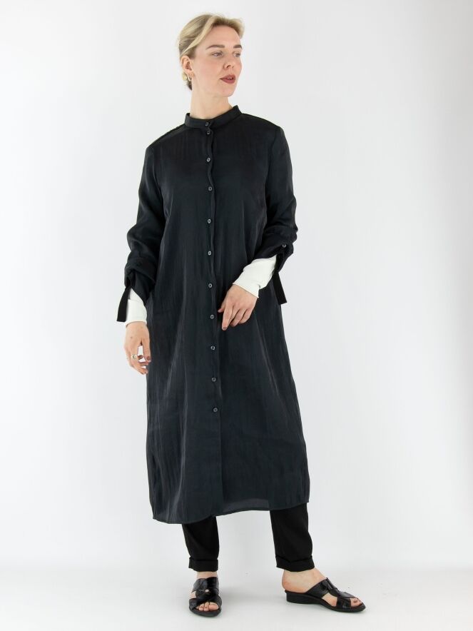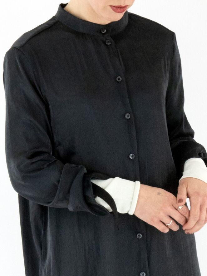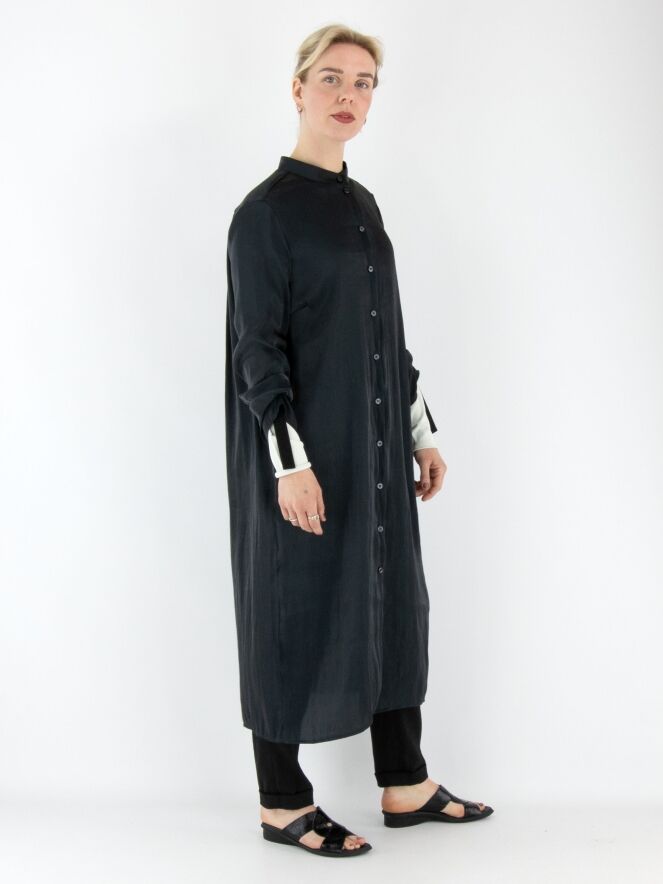 Eine lange Bluse von Annette Görtz aus mattem Satin mit einem melierten Print in Anthrazit. In den Ärmeln befindet sich ein Band mit Knöpfen, mit dem die Ärmel auf spielerische Weise verkürzt werden können. Auf der Rückseite verläuft unterhalb der Schultern eine horizontale Naht mit jeweils einer Falte an den Seiten. Diese Bluse kann bei 30 Grad gewaschen werden.