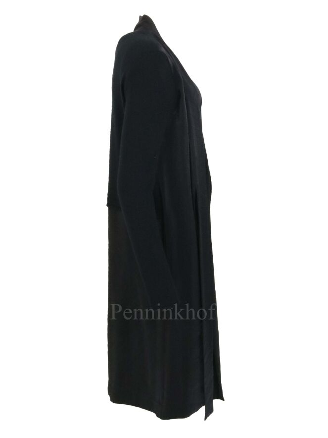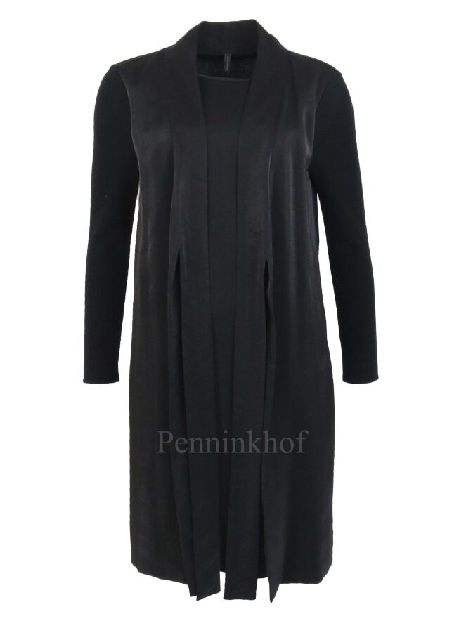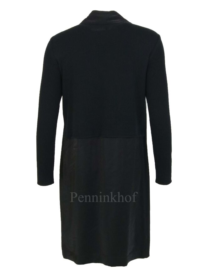 Ein Kleid der Designermode von Annette Görtz aus Mattsatin. Die Vorderseite ist schwarz. Die Rückenpartie und die Ärmel sind aus schwarzem Jersey. Auf der Vorderseite hat das Kleid eine Strickjacken-Optik aus Mattsatin und einen Bandgürtel. Dieses Kleid kann von Hand gewaschen werden.