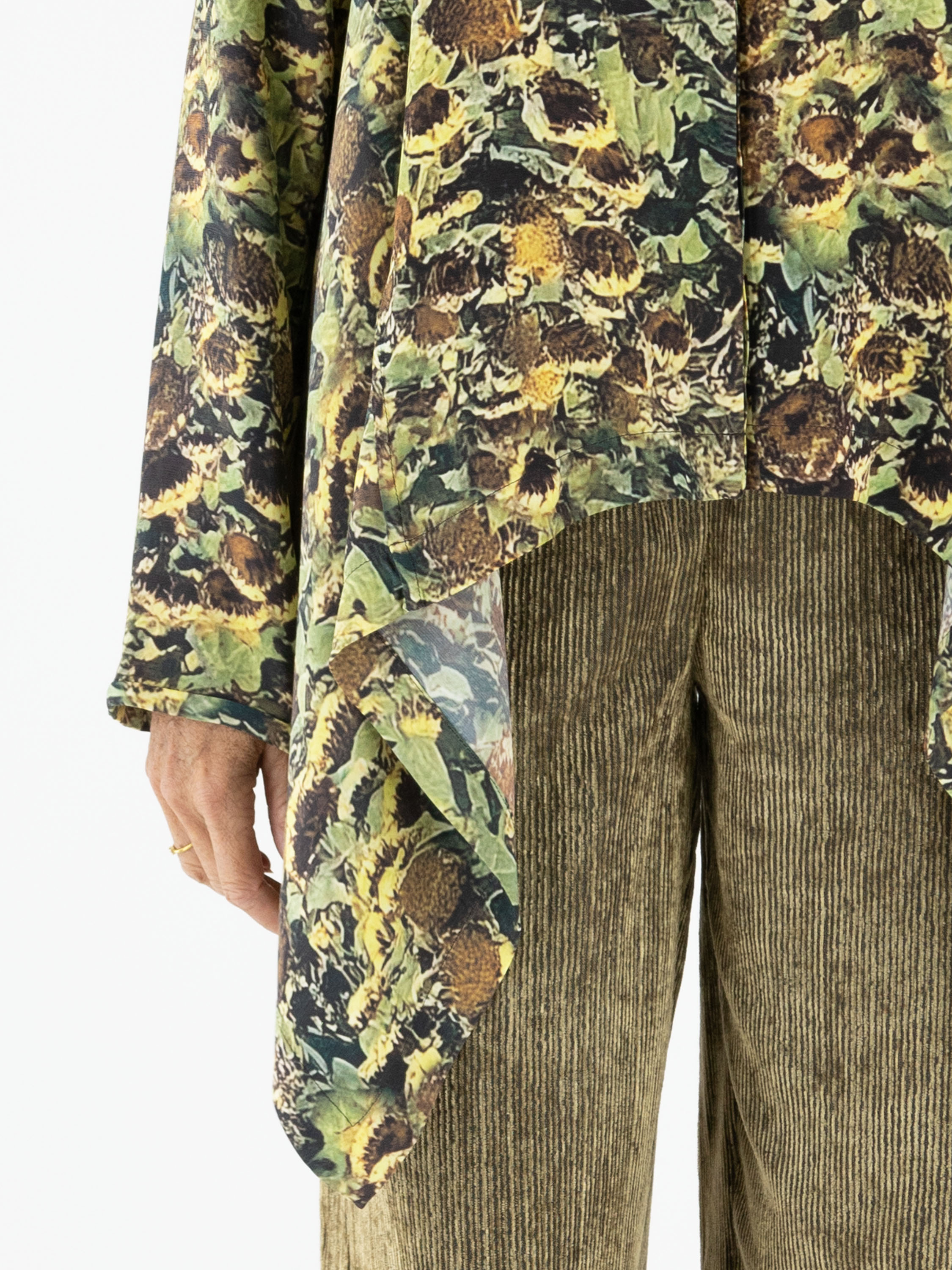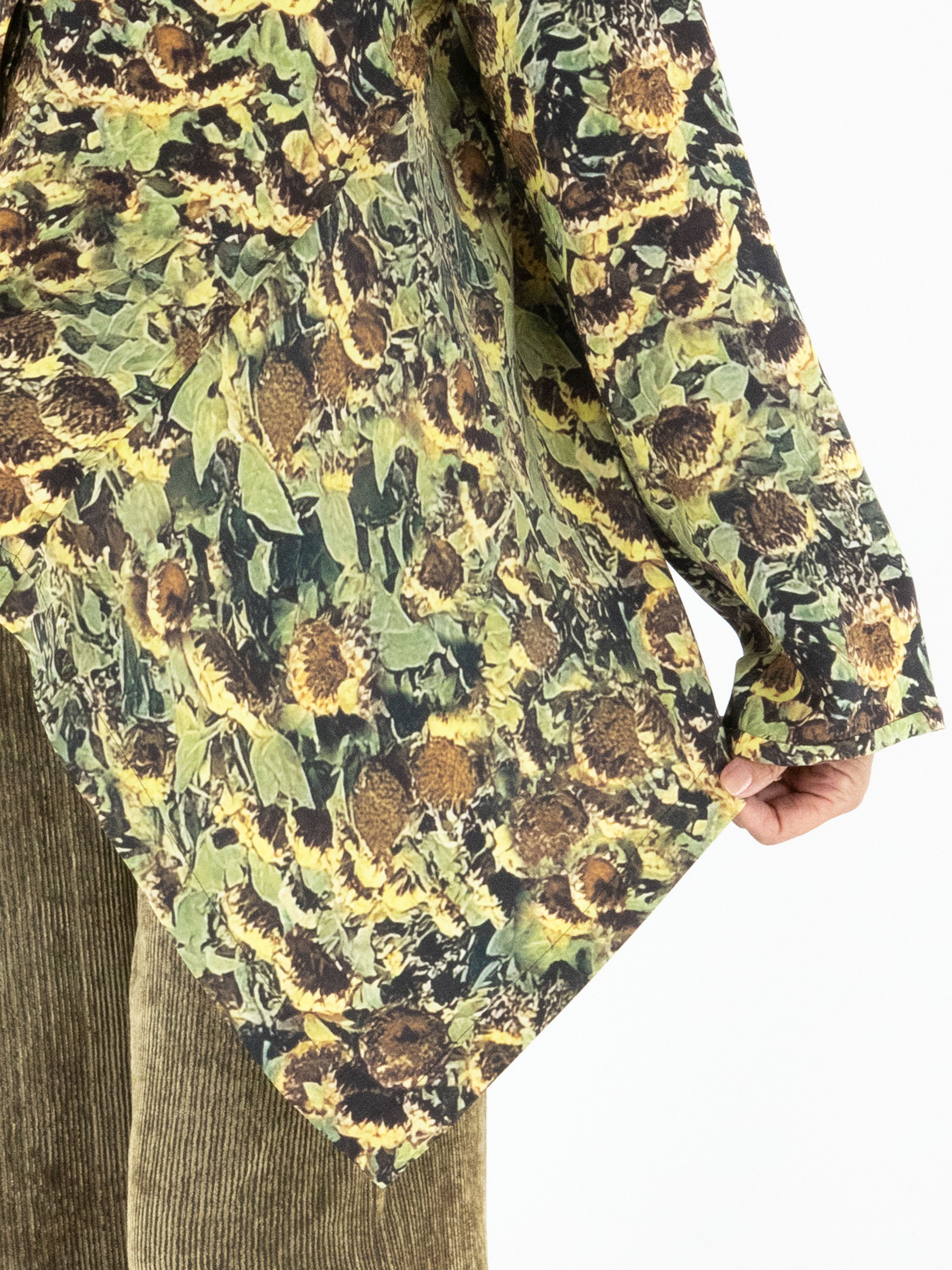 Bluse von Annette Görtz mit künstlerischem Print verblühter Sonnenblumen in Gelb-, Olivgrün-, Braun- und Schwarztönen. Eine verdeckte Knopfleiste sowie zusätzlicher Stoff an den Seiten verleihen der Bluse einen raffinierten Fall mit dezenten Zipfeln. Diese exklusive Designerbluse kann per Hand gewaschen werden.