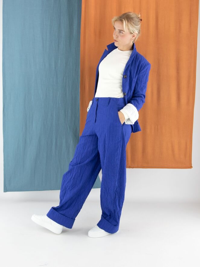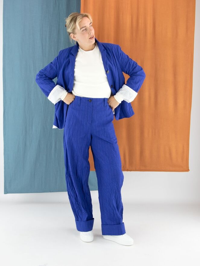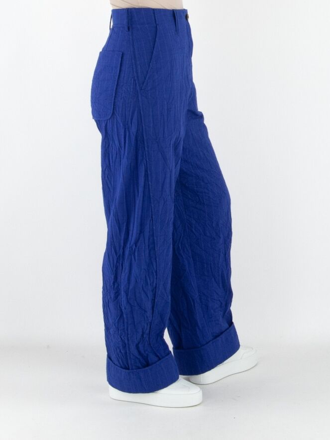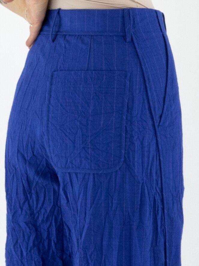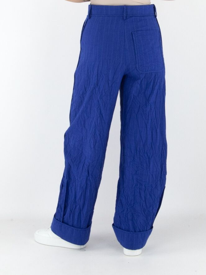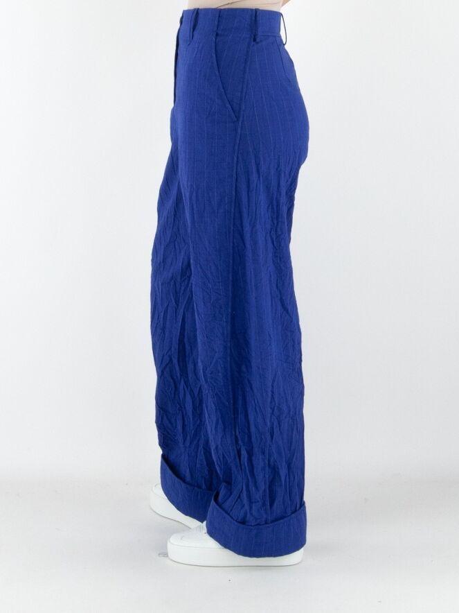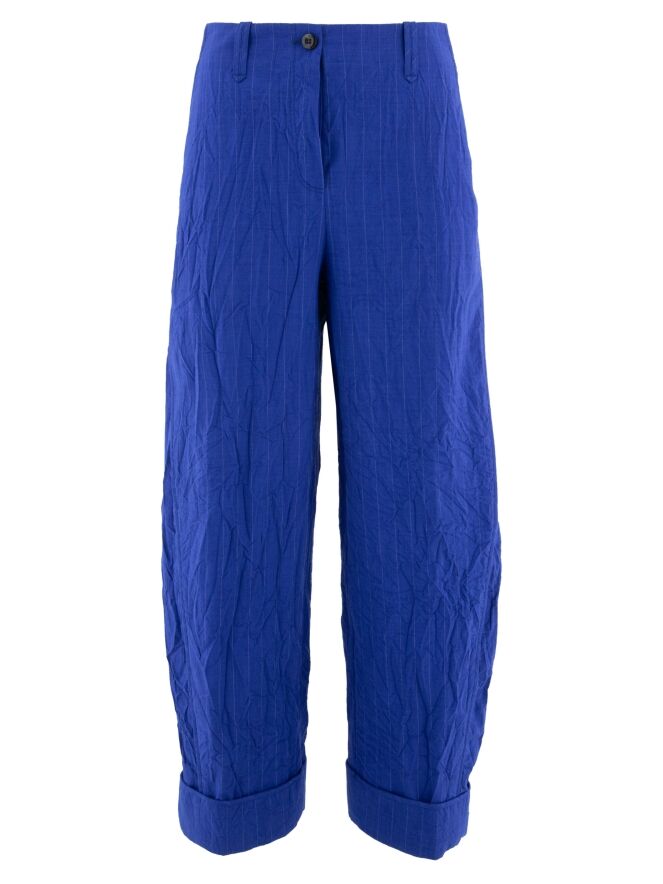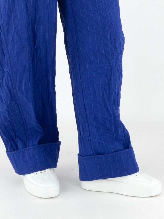 Hose von Annette Görtz im Nadelstreifenmuster in Königsblau und Cremeweiß. Der Stoff hat eine geknitterte Struktur. Das Modell ist mit Seitentaschen und einem breiten Umschlag am Saum versehen. Dieses Kleidungsstück darf nur von Hand gewaschen werden.