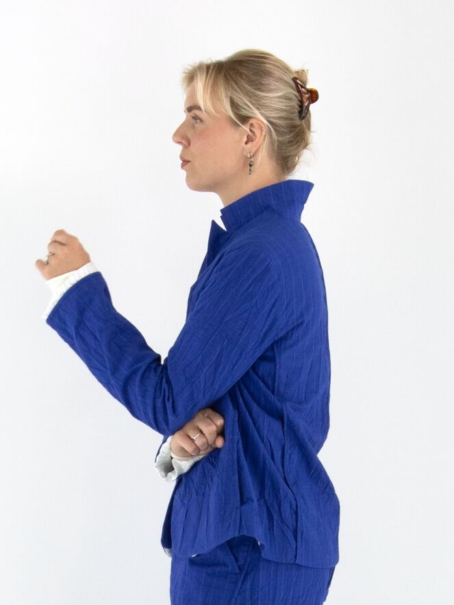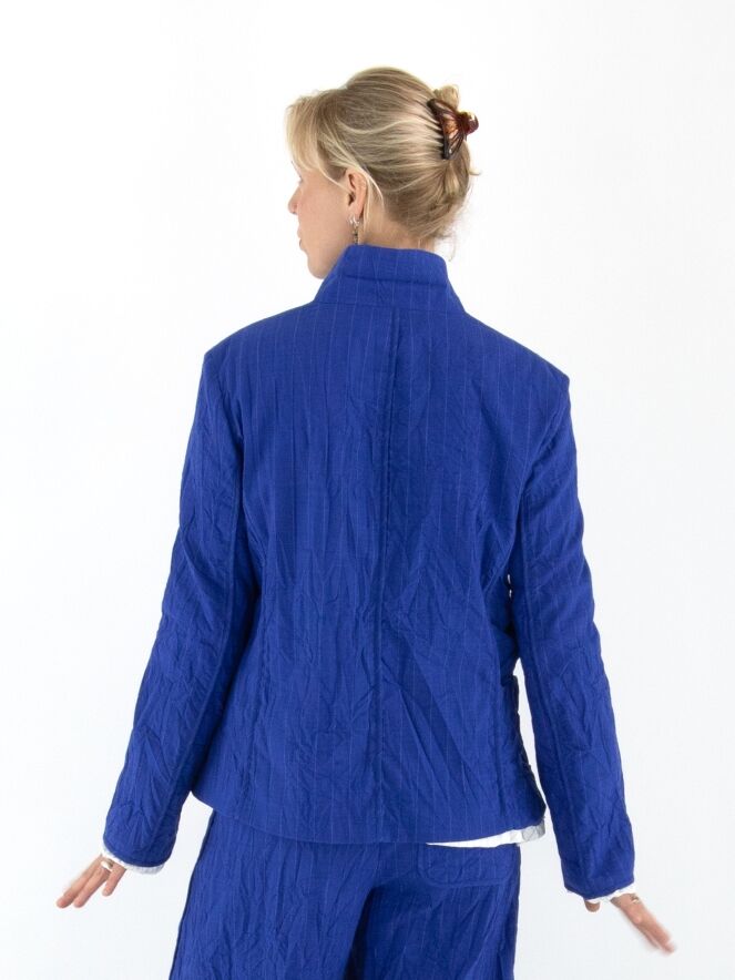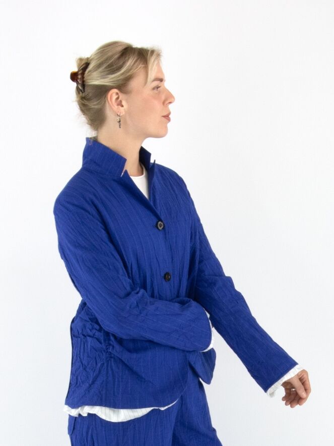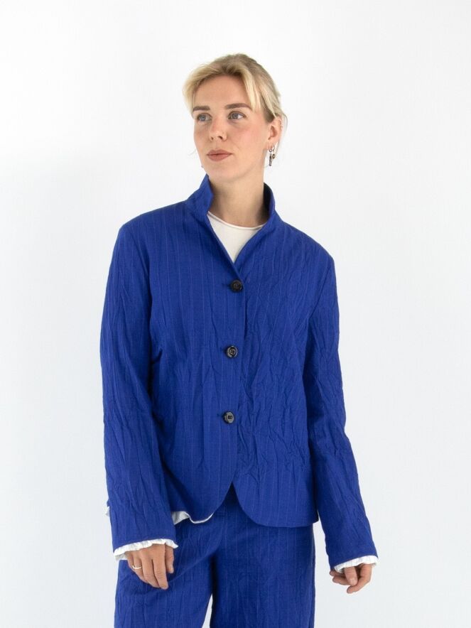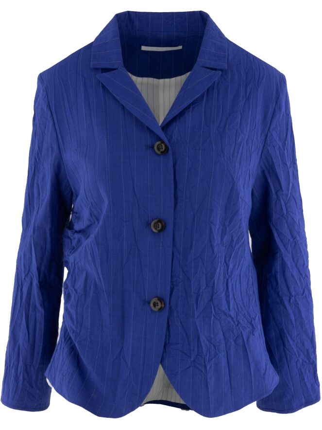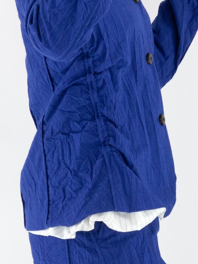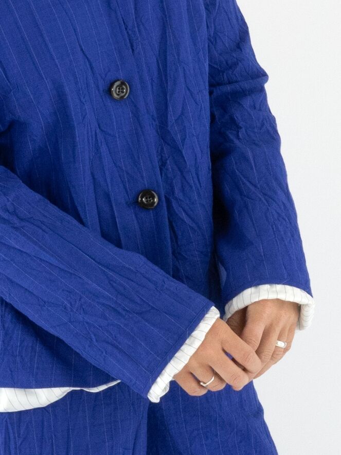 Blazer von Annette Görtz im Nadelstreifenmuster in Königsblau und Cremeweiß. Der Stoff ist geknittert und an der rechten Seite fein entlang der Naht gerafft. Das weiße Nadelstreifenfutter tritt dezent unter dem Saum und an den Ärmelsäumen hervor. Der Blazer hat eine Knopfleiste mit drei Knöpfen und einen abgerundeten Saum. Dieser Blazer darf nicht gewaschen werden.