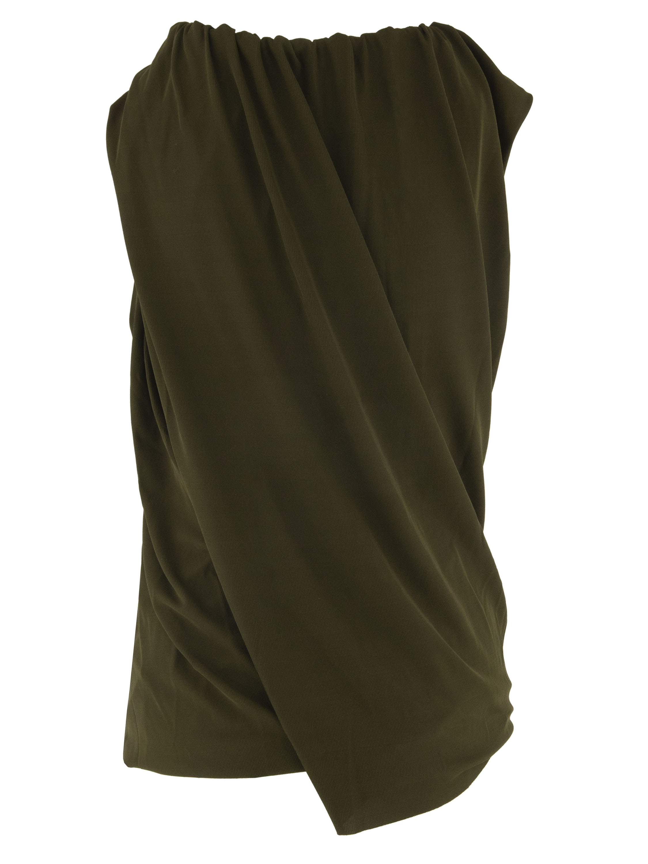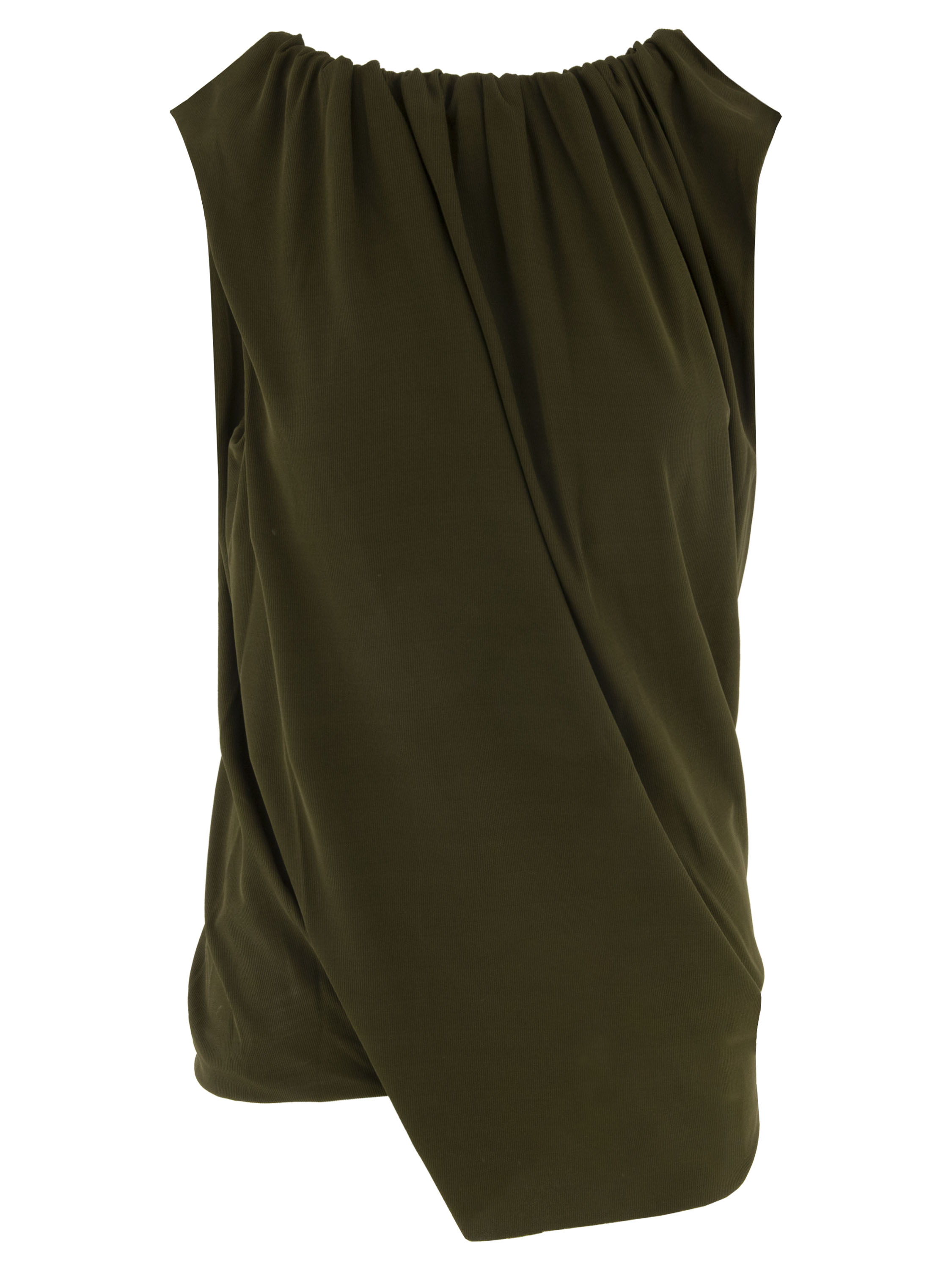 Ein Top von Annette Görtz aus fein geripptem Stoff in dunklem Olivgrün. Der Top ist doppellagig gearbeitet und gedreht, was eine schlanke Silhouette erzeugt. Der Rand des Rundhalsausschnitts ist fein plissiert verarbeitet. Dieser Top kann bei 30 Grad gewaschen werden.